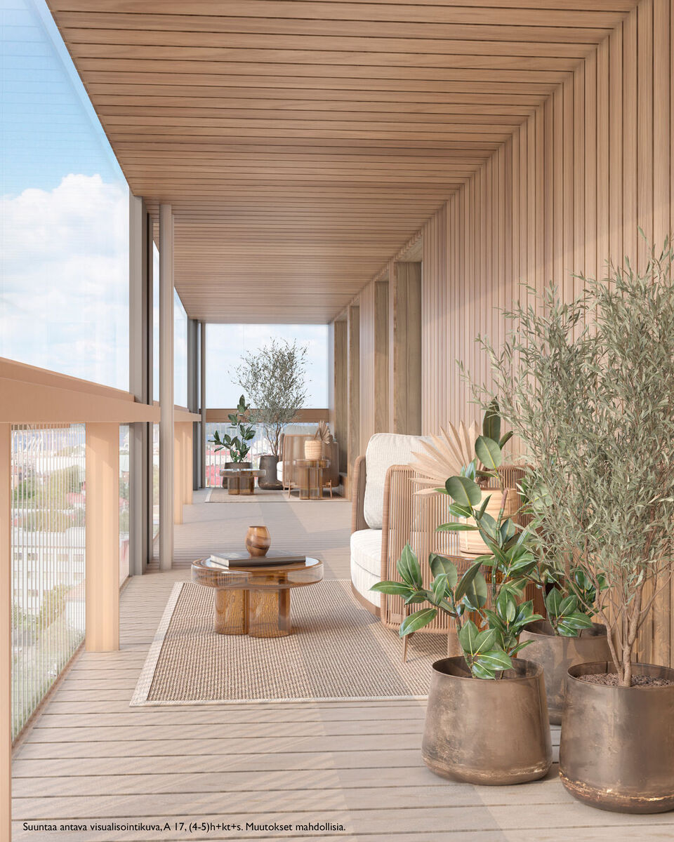 * Suuret lasitetut parvekkeet, jotka on verhoiltu puupaneelilla