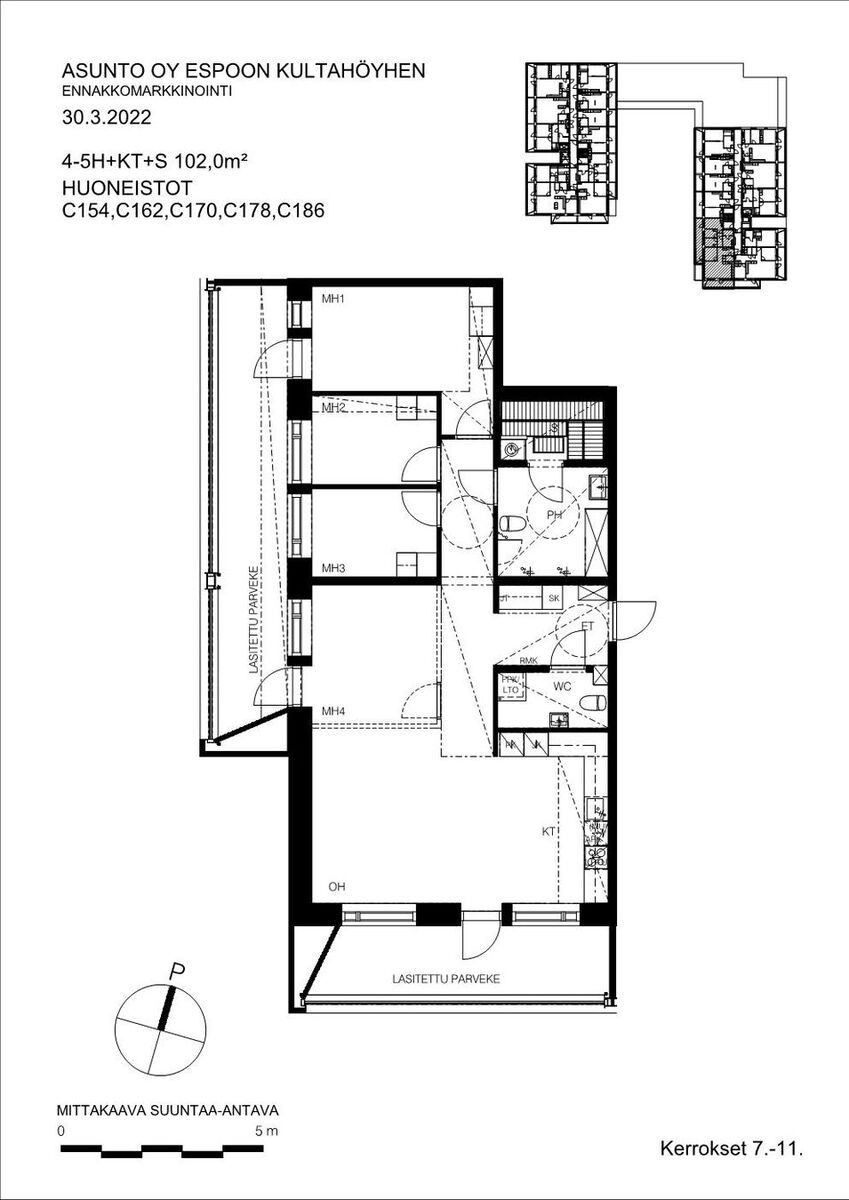| Huoneistoselitelmä | 4-5h + kt + s + parveke n. 20,5 m² ja 13,5 m² |