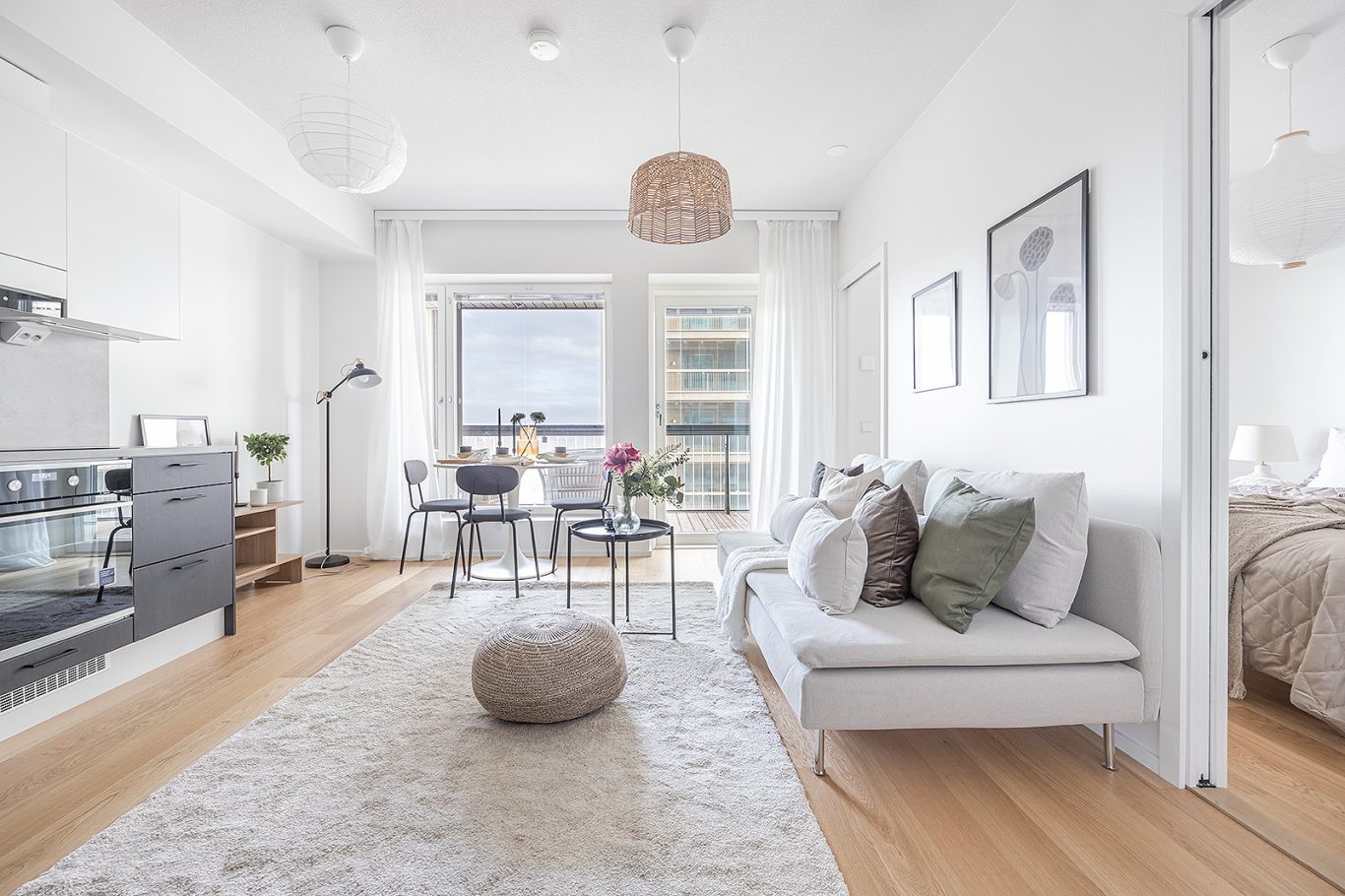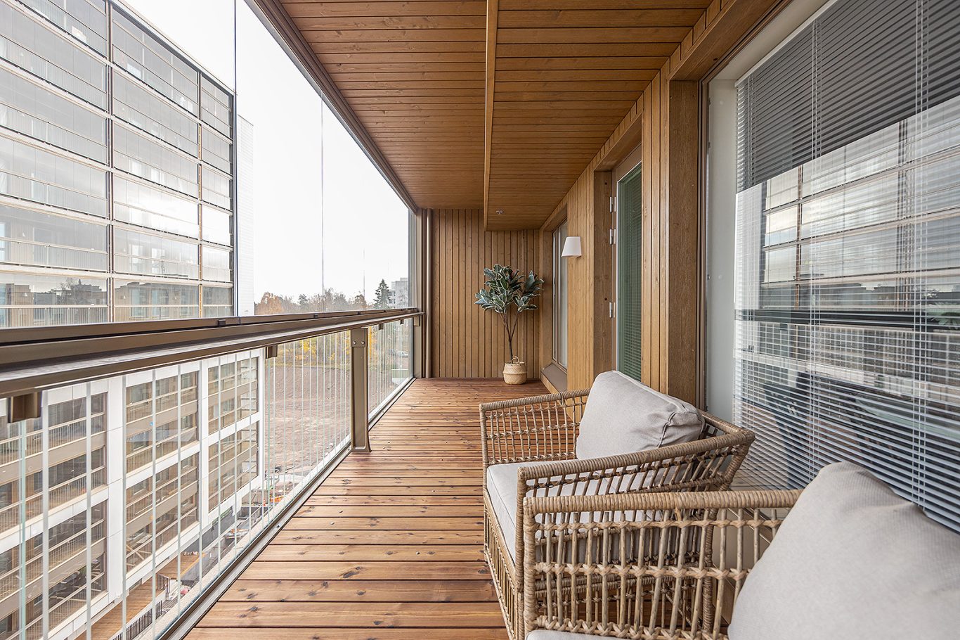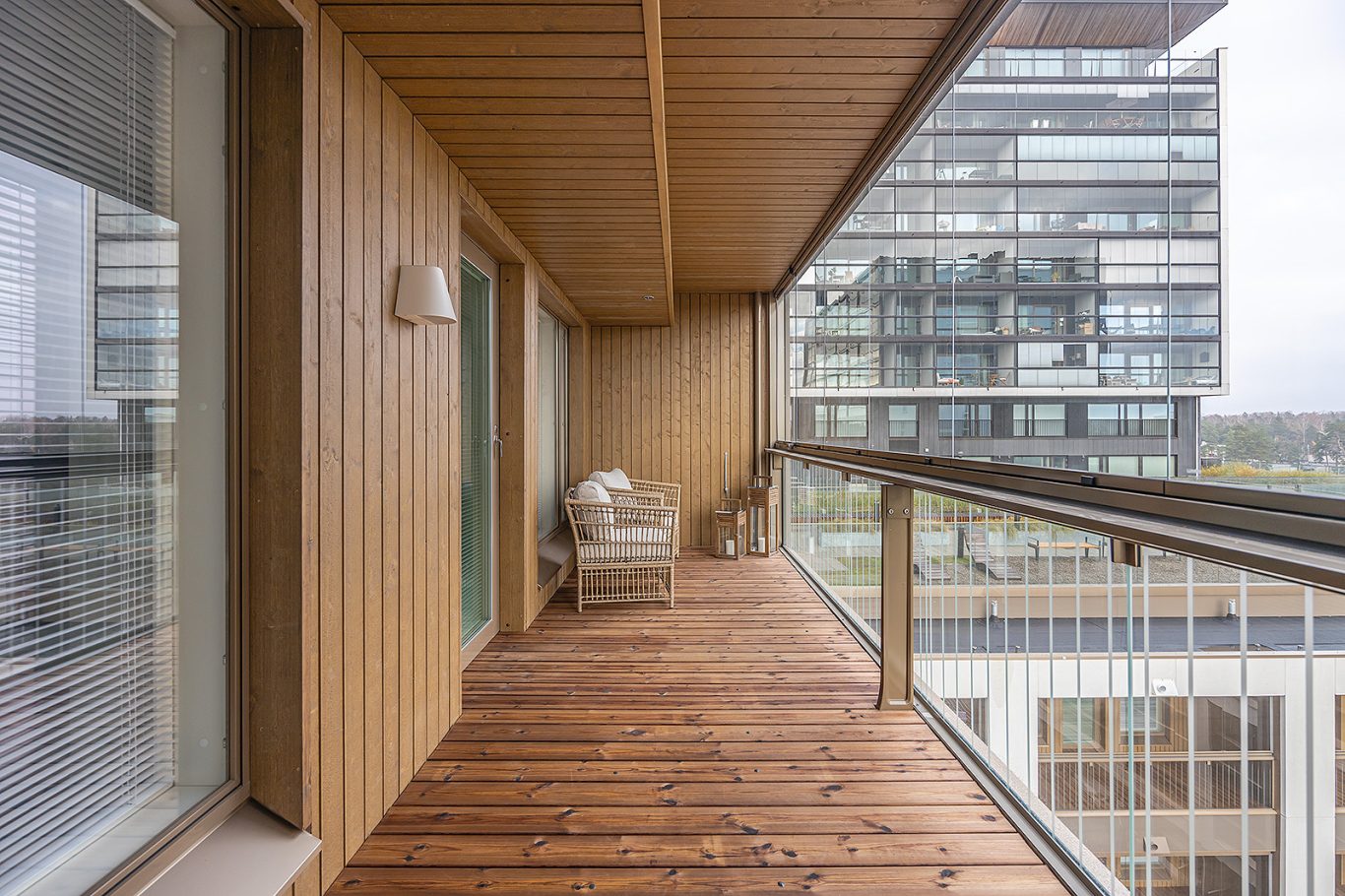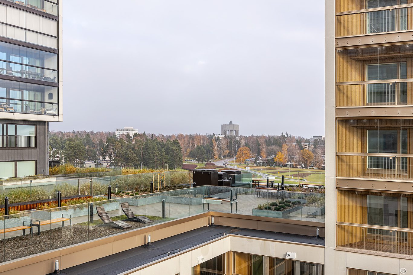 7-kerroksen tyylikäs koti suurella lasitetulla parvekkeella. Parvekkeelta avarat näkymät taloyhtiön kattoterassin yli.