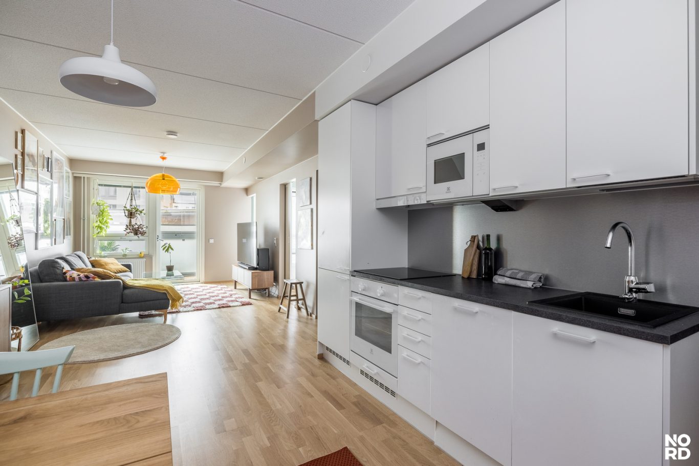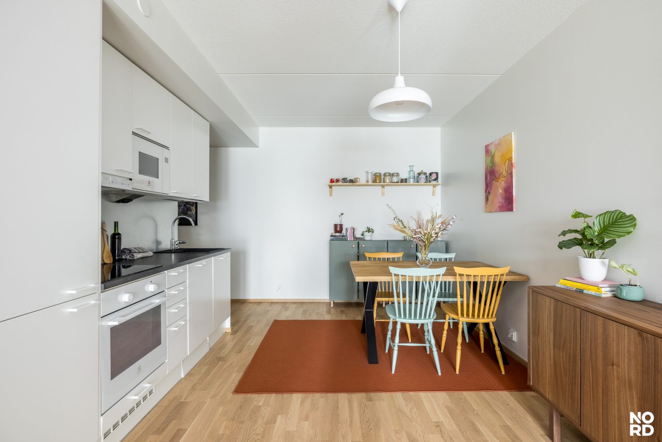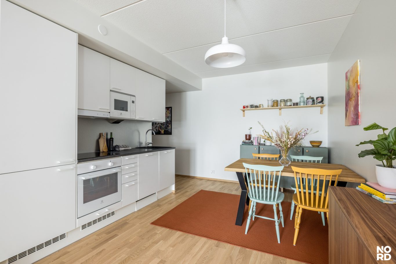 Avokeittiö ja olohuone muodostavat selkeän ja viihtyisän kokonaisuuden. Keittiö on kompakti ja toimiva, ja ruokailuryhmälle on oma paikkansa. Seinät on maalattu tyylikkäillä, harkituilla sävyillä, jotka tuovat kotiin kauniin ja viimeistellyn ilmeen.