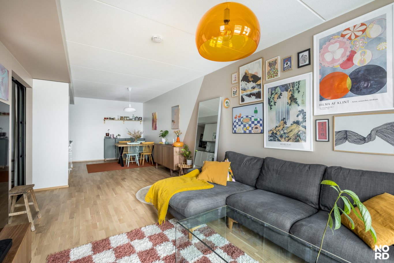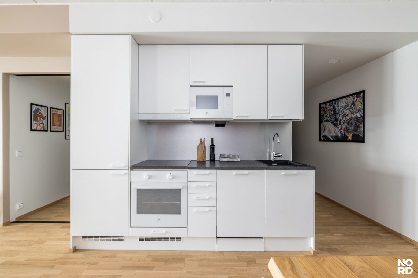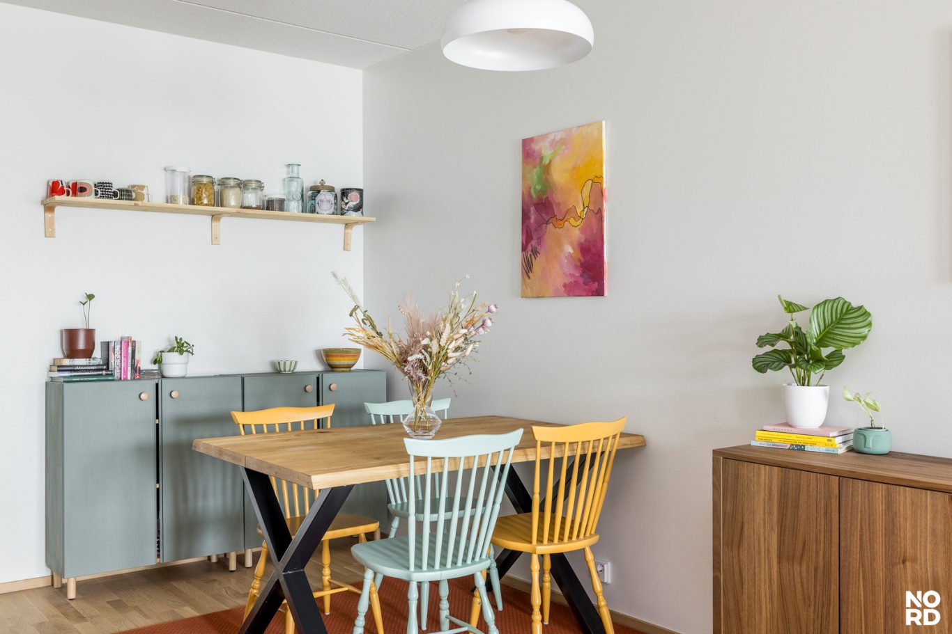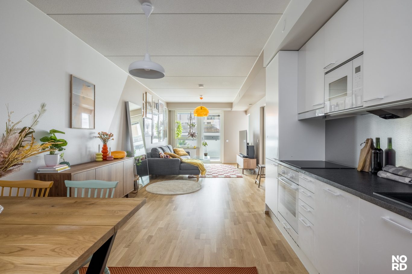 Avokeittiö ja olohuone muodostavat selkeän ja viihtyisän kokonaisuuden. Keittiö on kompakti ja toimiva, ja ruokailuryhmälle on oma paikkansa. Seinät on maalattu tyylikkäillä, harkituilla sävyillä, jotka tuovat kotiin kauniin ja viimeistellyn ilmeen.