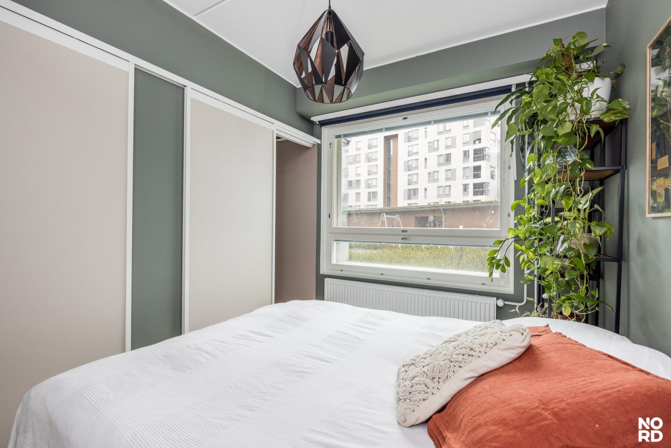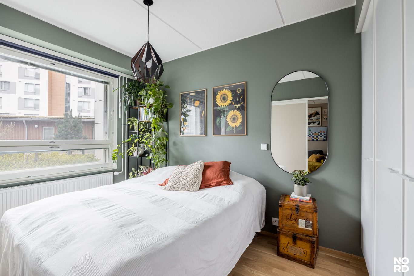 Entisestä alkovista muodostettu kolmas huone soveltuu mainiosti työ-, lasten- tai vierashuoneeksi. Tilavaan päämakuuhuoneeseen mahtuu parisänky yöpöytineen.
