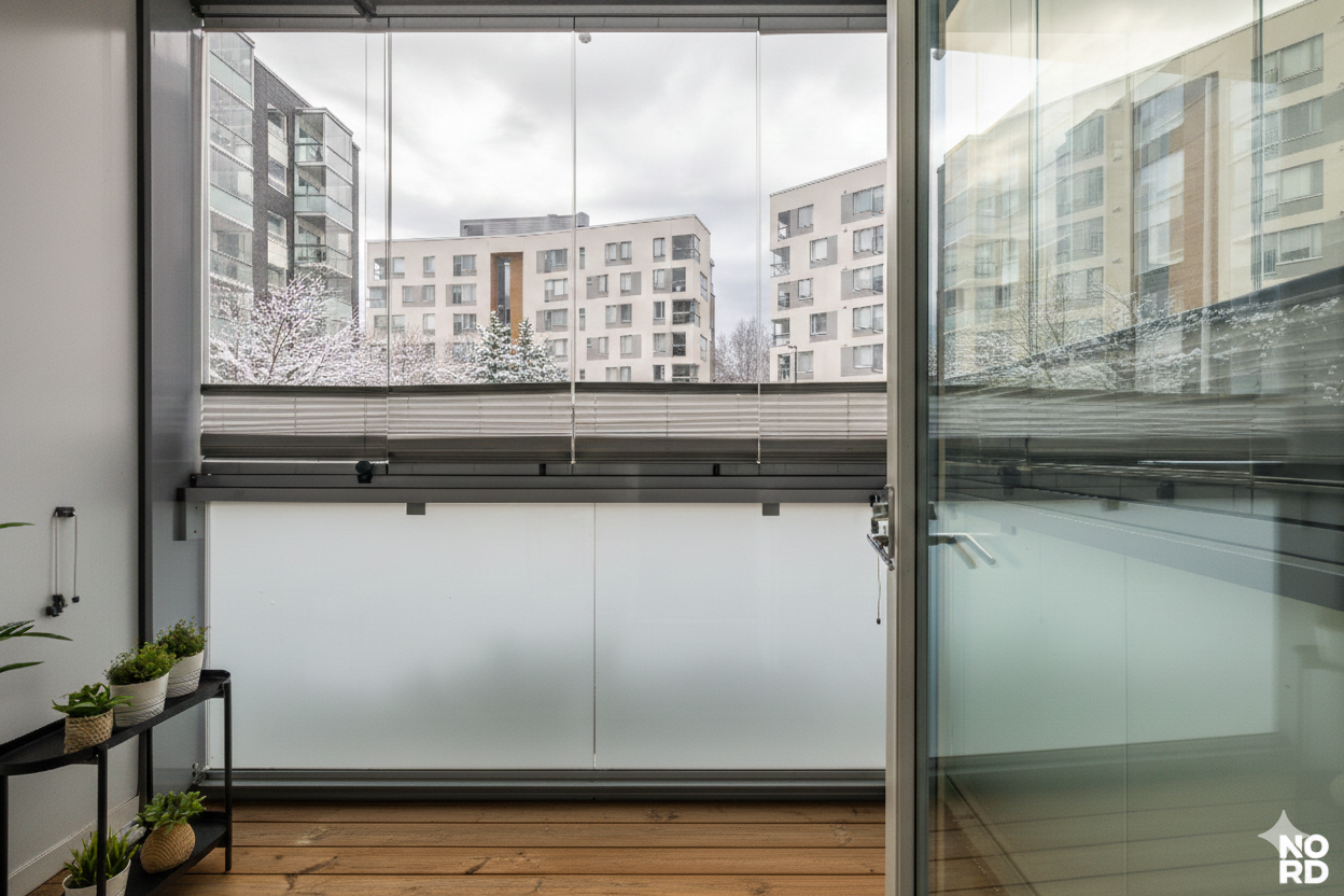 Etelään avautuva lasitettu parveke kaihtimineen tuo mukavasti lisätilaa. Ehdoton plussa on vuonna 2026 asennettu ilmalämpöpumppu, joka lisää asumismukavuutta erityisesti kesähelteillä.