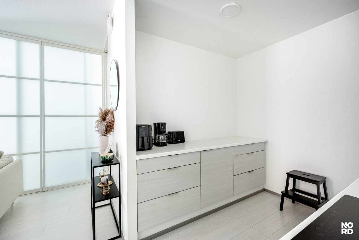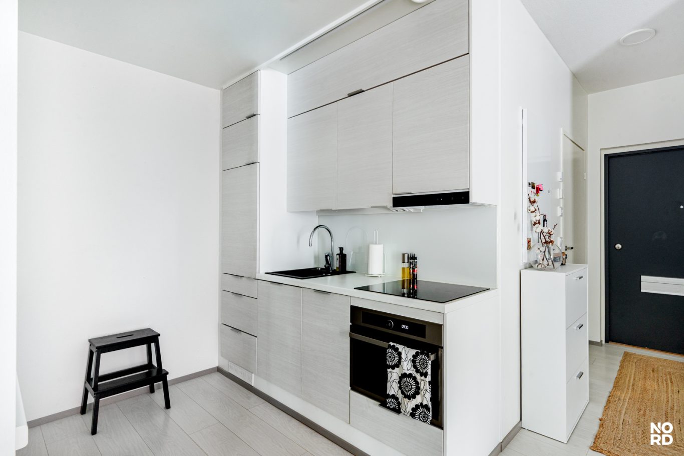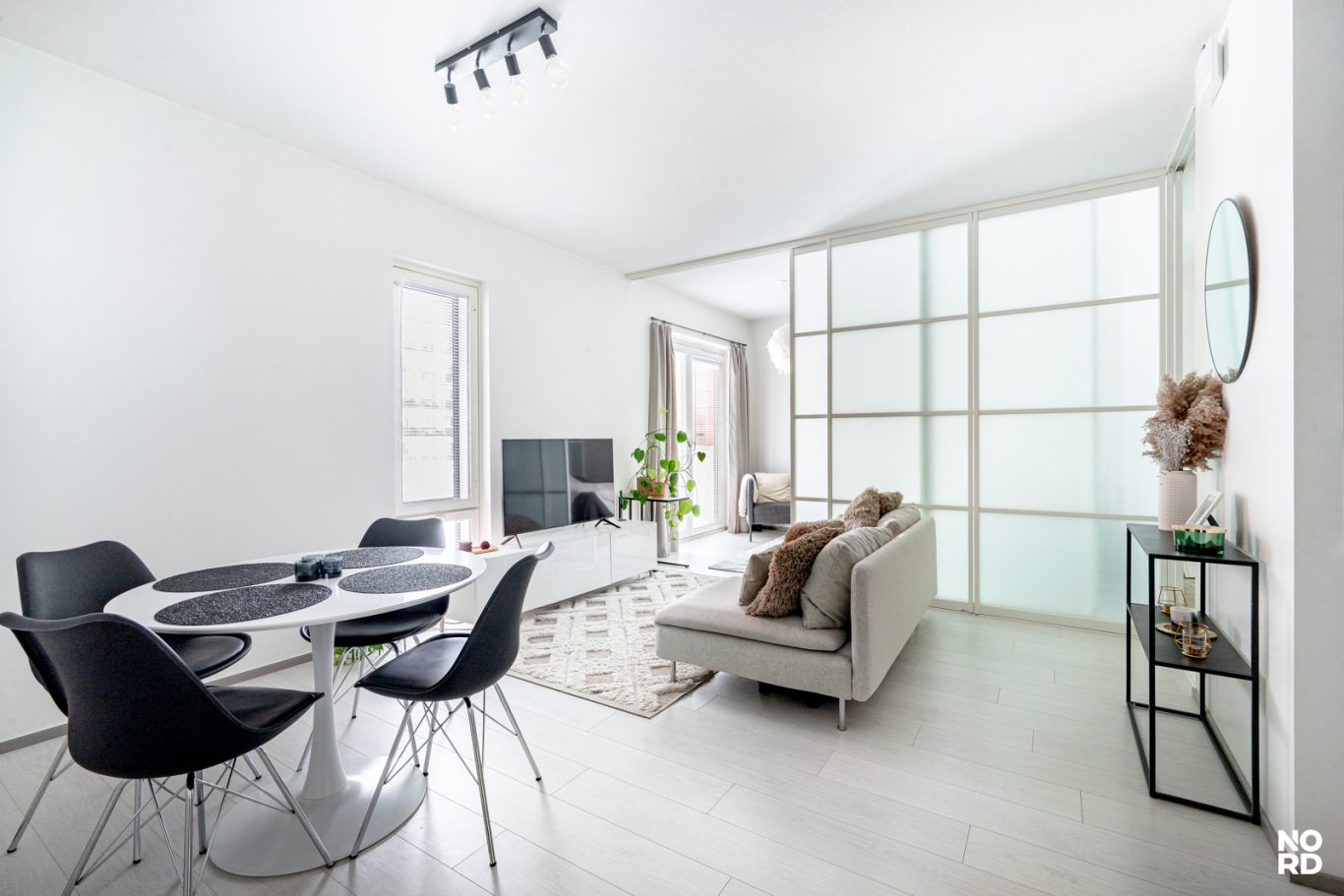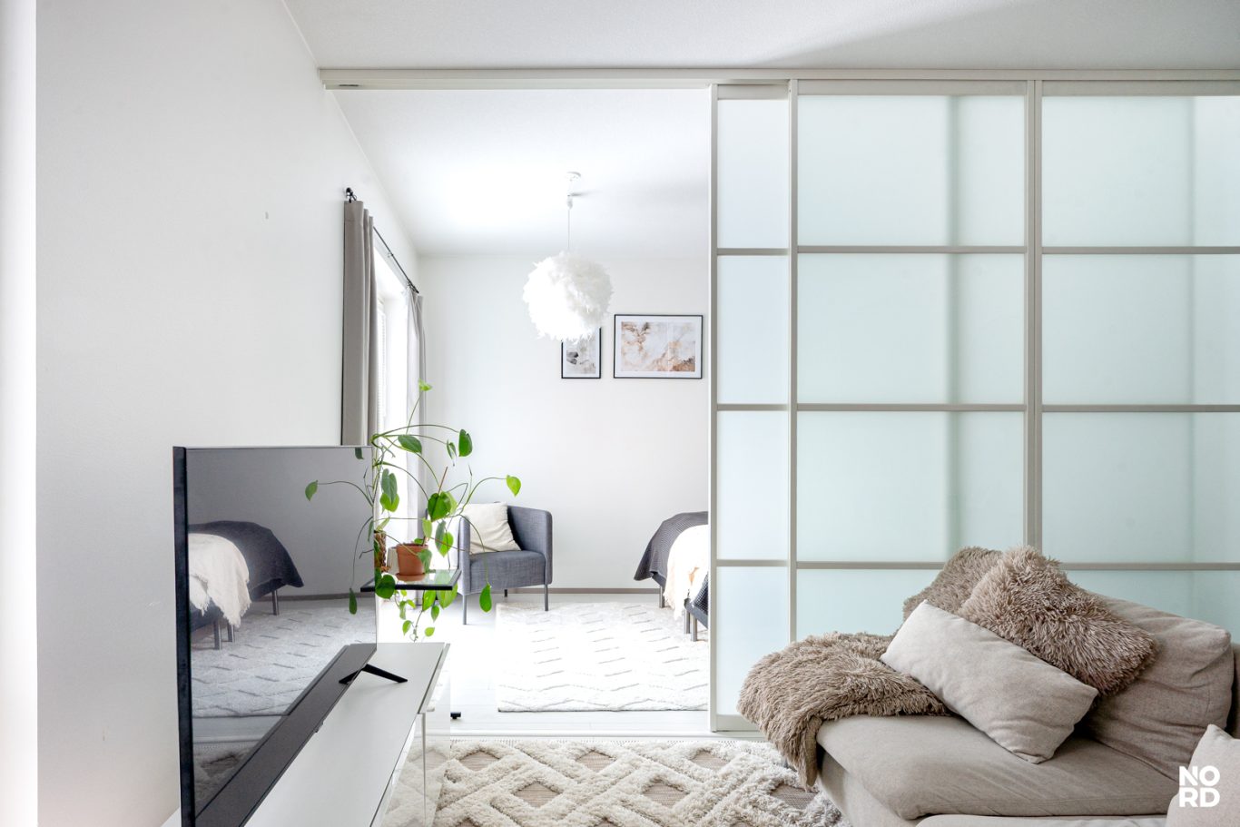 Unohda perinteiset yksiöt! Tämä koti määrittelee tilan käytön uudelleen. JV Doorsin tilanjakaja luo asuntoon hienostuneen huonejaon, joka taipuu tyylikkääksi kaksioksi ja erilliseksi työtilaksi.