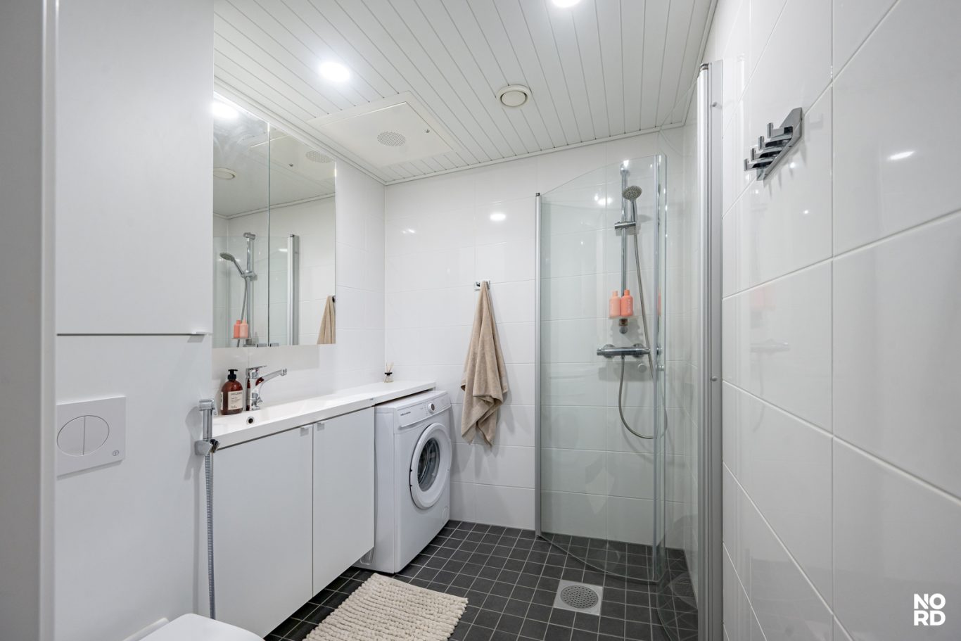 Integroidut koneet ja ylellinen lattialämmitys tuovat arkeen ripauksen hotellitason mukavuutta. Kylpyhuoneen moderni varustelu noudattaa asunnon linjakasta estetiikkaa.