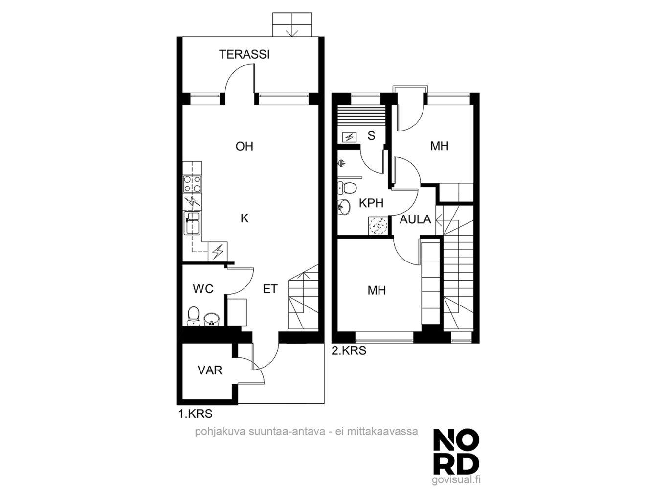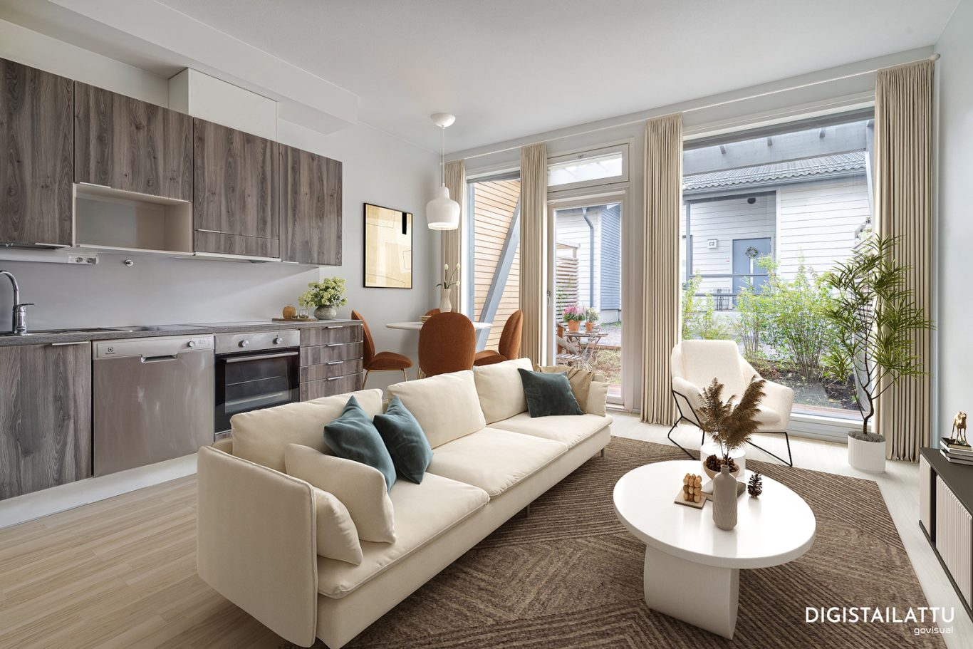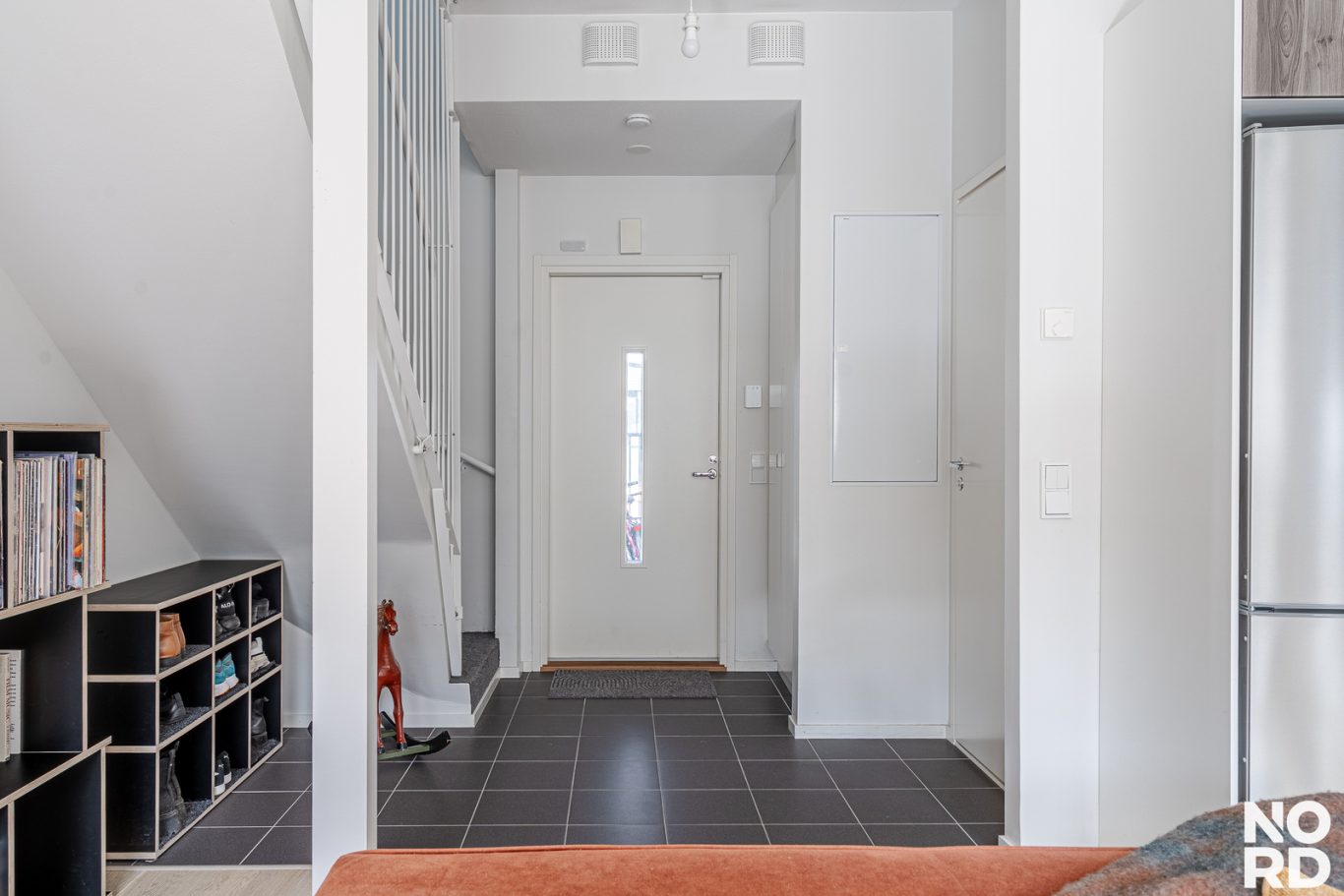 Sisääntulokerroksessa on avaraa tilaa olohuone-keittiössä. Näkymä ja käynti on pienelle terassipihalle, johon voit toteuttaa mieleisesi oleskelupaikan. Olohuoneessa on tilaa sohvalle ja TV-kalusteelle. Keittiö on uudenaikainen ja linjakas. Ruokailutilaan mahtuu neljän hengen ruokapöytä. Wc on reilun kokoinen ja käytännöllinen. Eteisessä on vaatekaappitilaa ulkovaatteille.