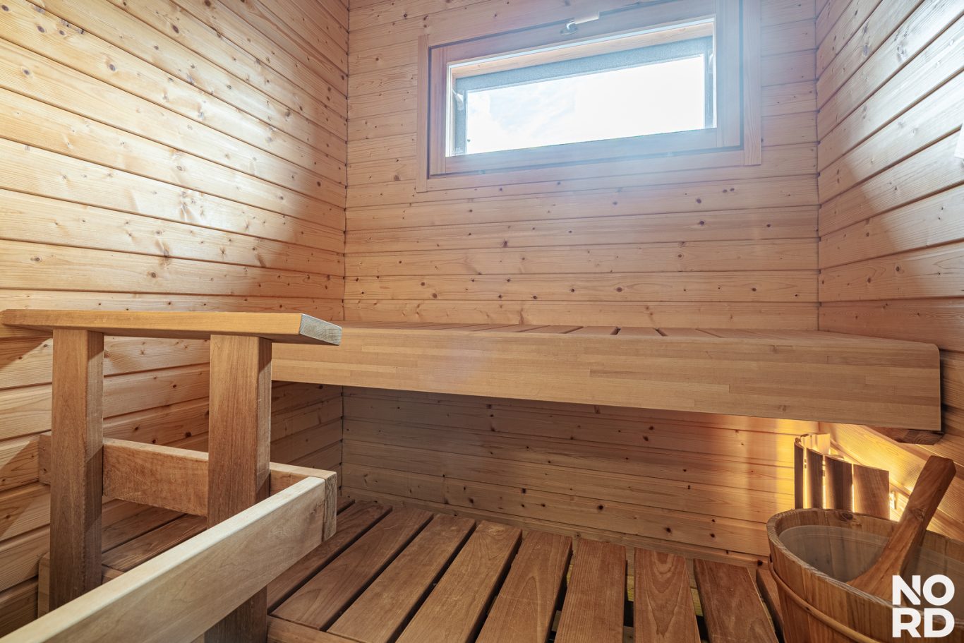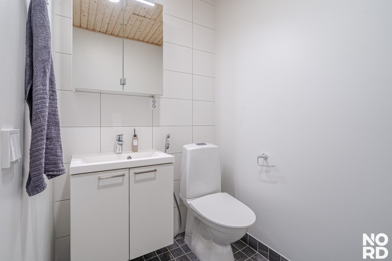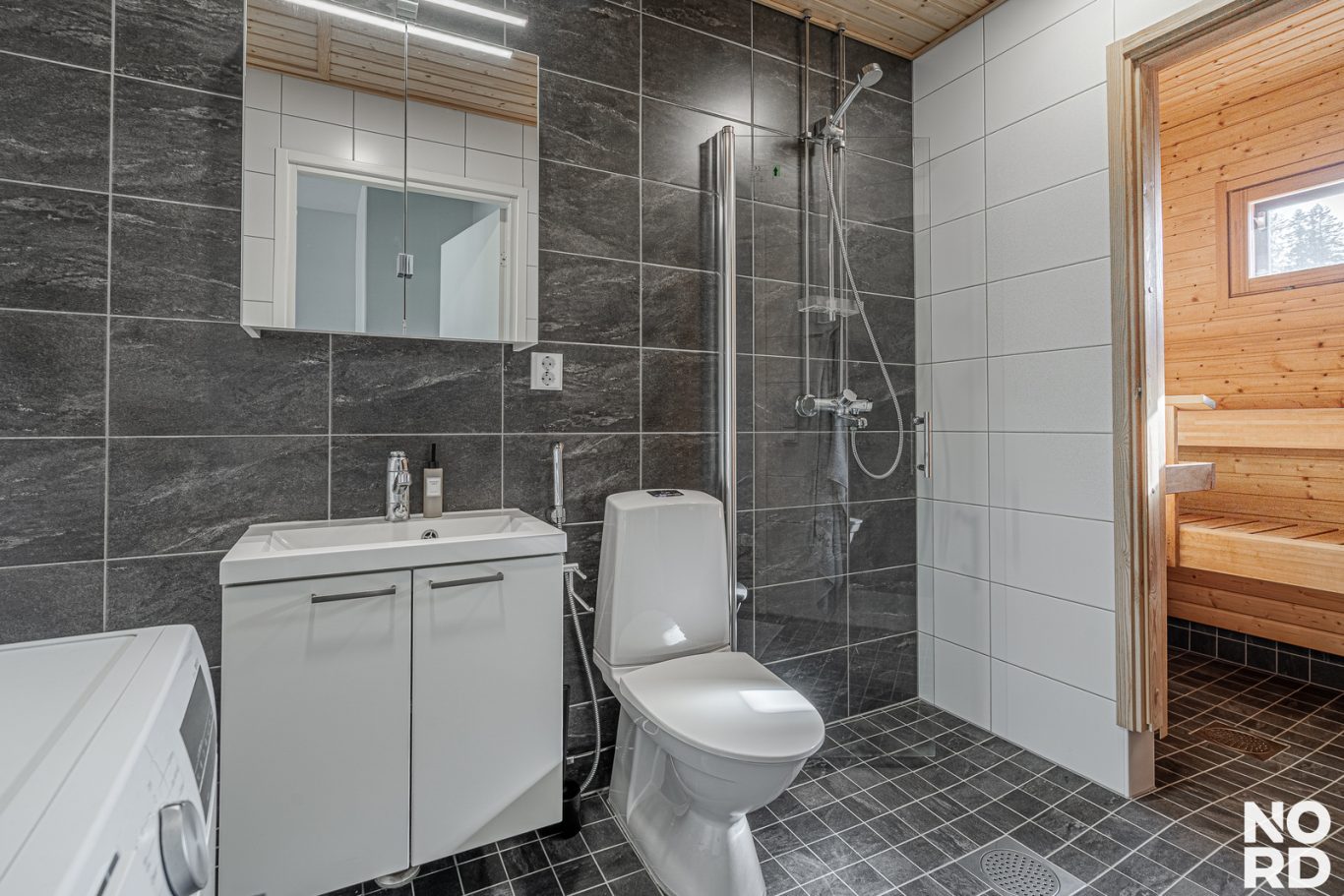 Yläkerrassa on kaksi makuuhuonetta sekä mitoitukseltaan hyvä saunaosasto. Tyylikkäässä kylpyhuoneessa on tilaa pesutornille. Sauna on ikkunallinen.