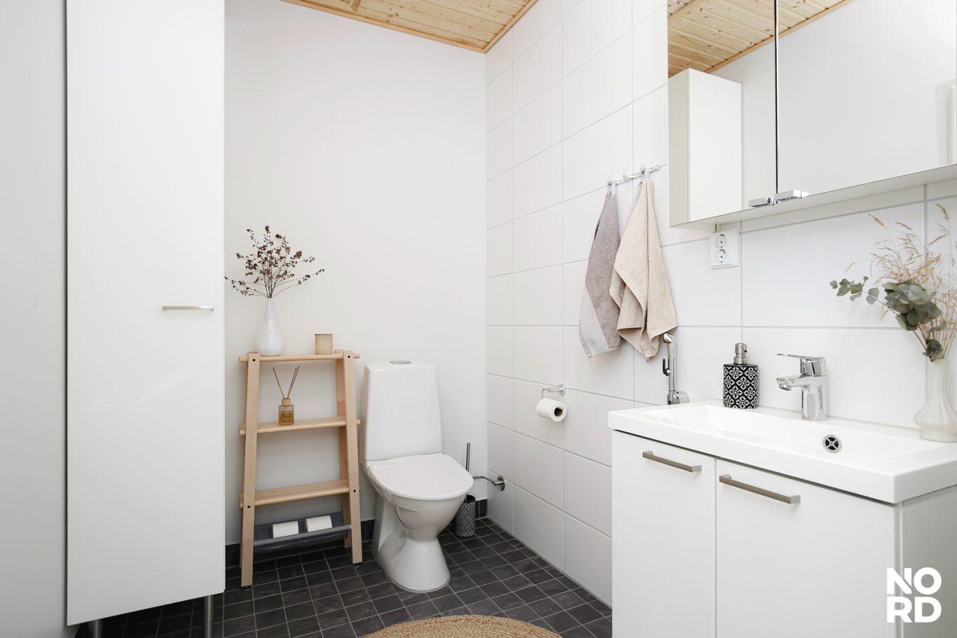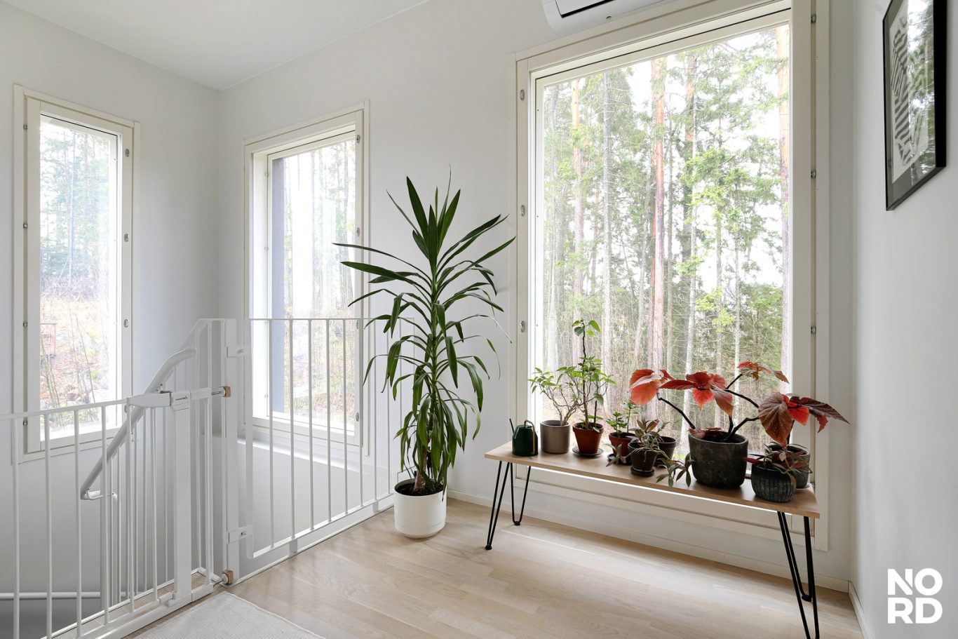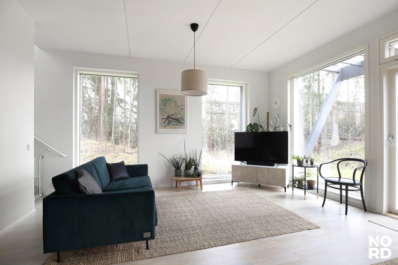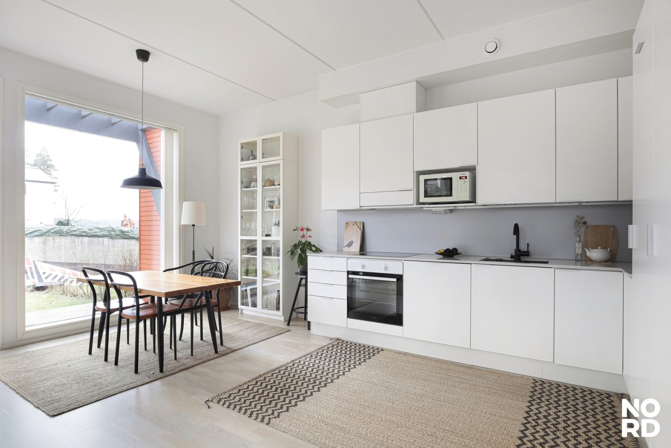 Sisään astuessa huomio kiinnittyy kaksi metriä korkeisiin ikkunoihin, jotka tulvivat valoa sisään ja kehystävät ympäröivän luonnon kuin vuodenaikojen mukaan muuttuvan maalauksen. Tupakeittiö toimii kodin sydämenä – avarana, viihtyisänä ja tyylikkäänä tilana, jossa arki ja ikimuistoiset illanvietot sulautuvat toisiinsa. Vaalea parketti, valkoinen kvartsitaso ja integroidut kodinkoneet viimeistelevät kokonaisuuden, jossa jokainen yksityiskohta on mietitty tarkkaan.