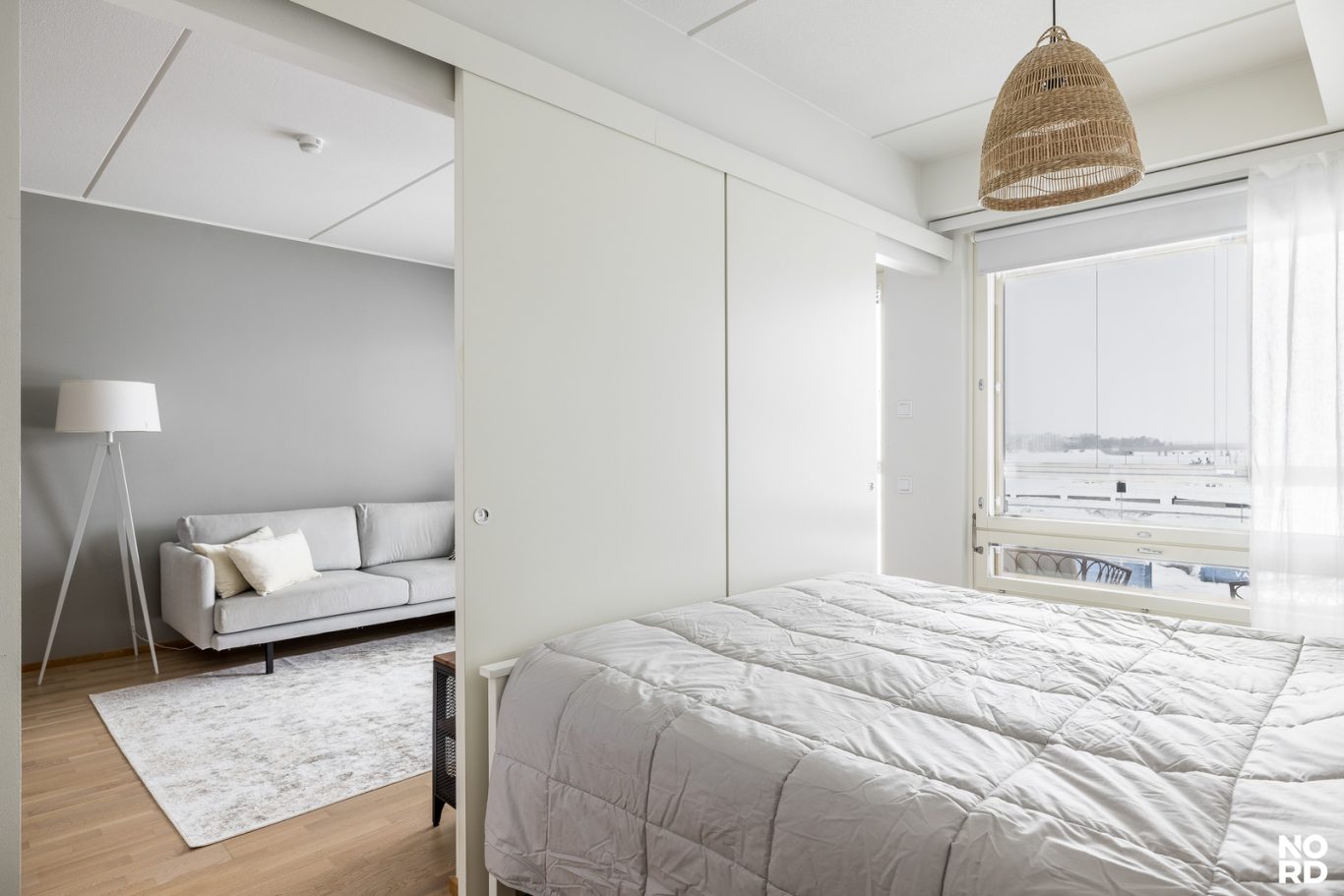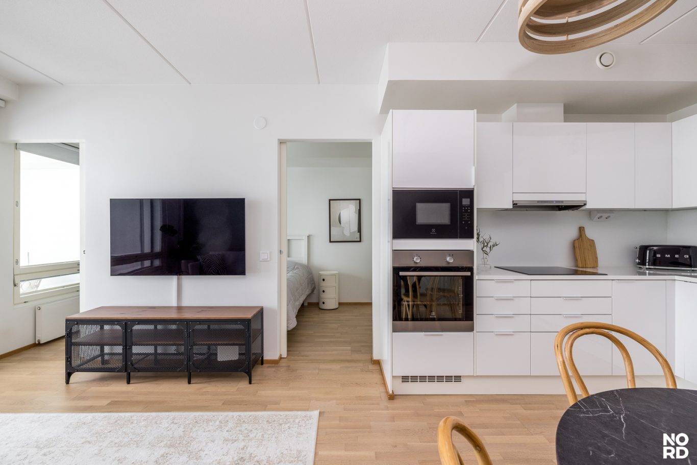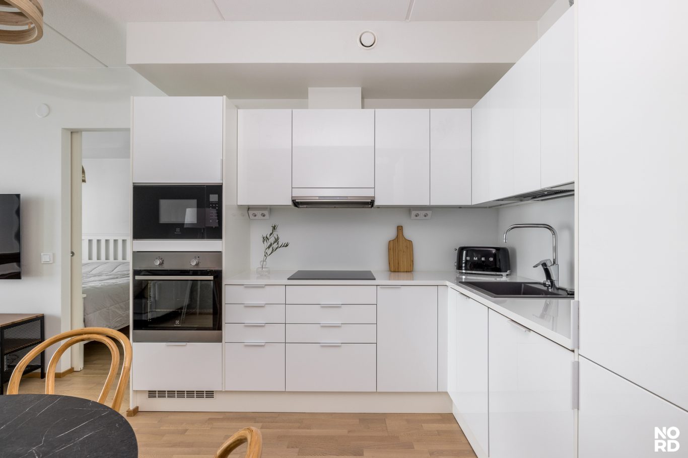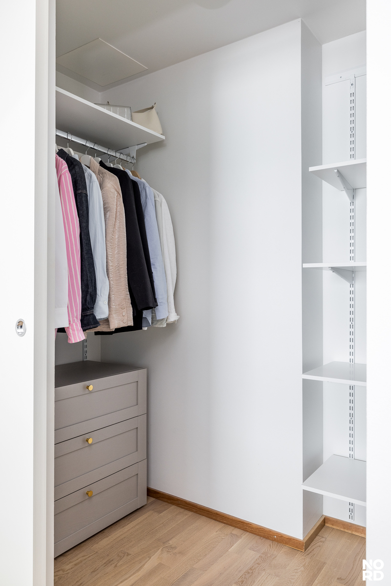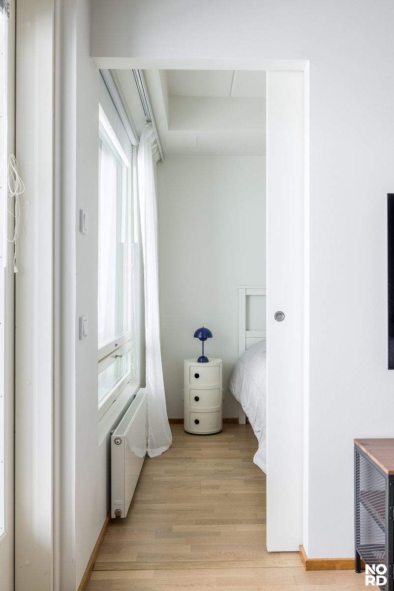 Kodin sydän on vaalea ja tyylikäs keittiö, joka yhdistyy saumattomasti oleskelutiloihin. Makuuhuoneessa arjen luksusta tuo liukuovellinen walk-in closet. Huoneistossa on myös kylpyhuone sekä sekä iso lasitettu parveke, josta maisevat toistuvat parhaiten.