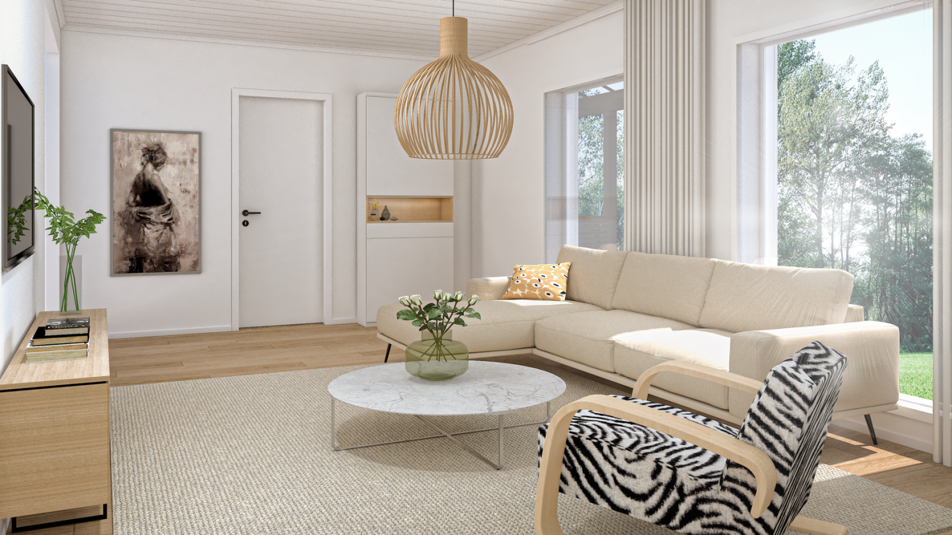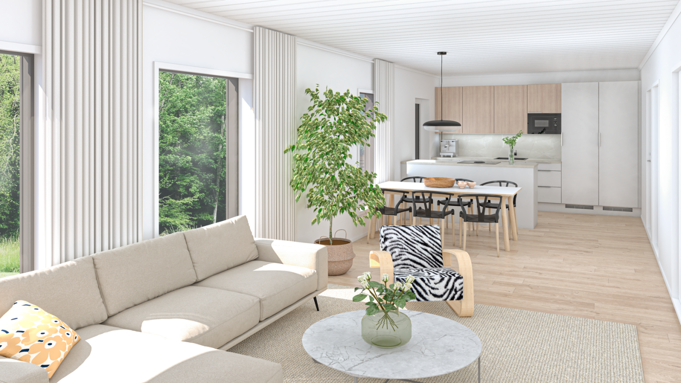 Tässä talossa on yhtenäistä olohuone-ruokailutila-keittiö-tilaa. Paljon ikkunoita. Tila on luonnonvalon valaisema ympärivuotisesti. Olohuone on mitoitukseltaan tilava ja sinne mahtuu kunnolliset huonekalut.