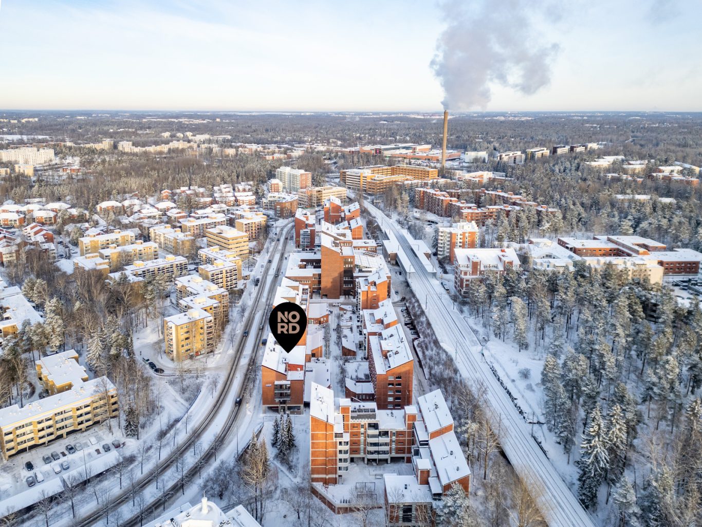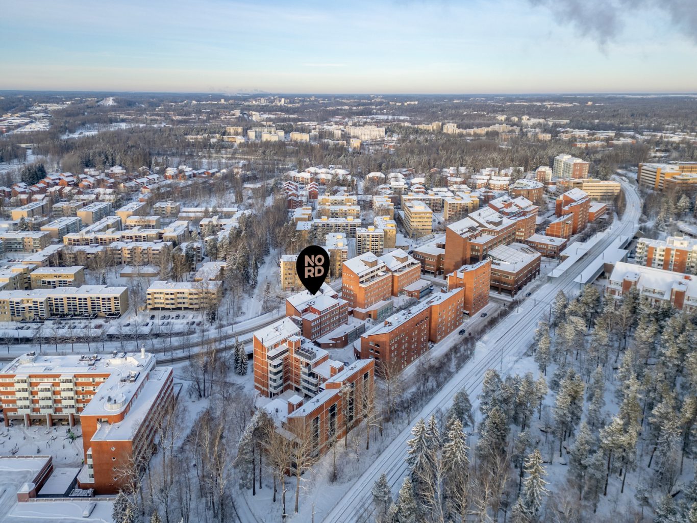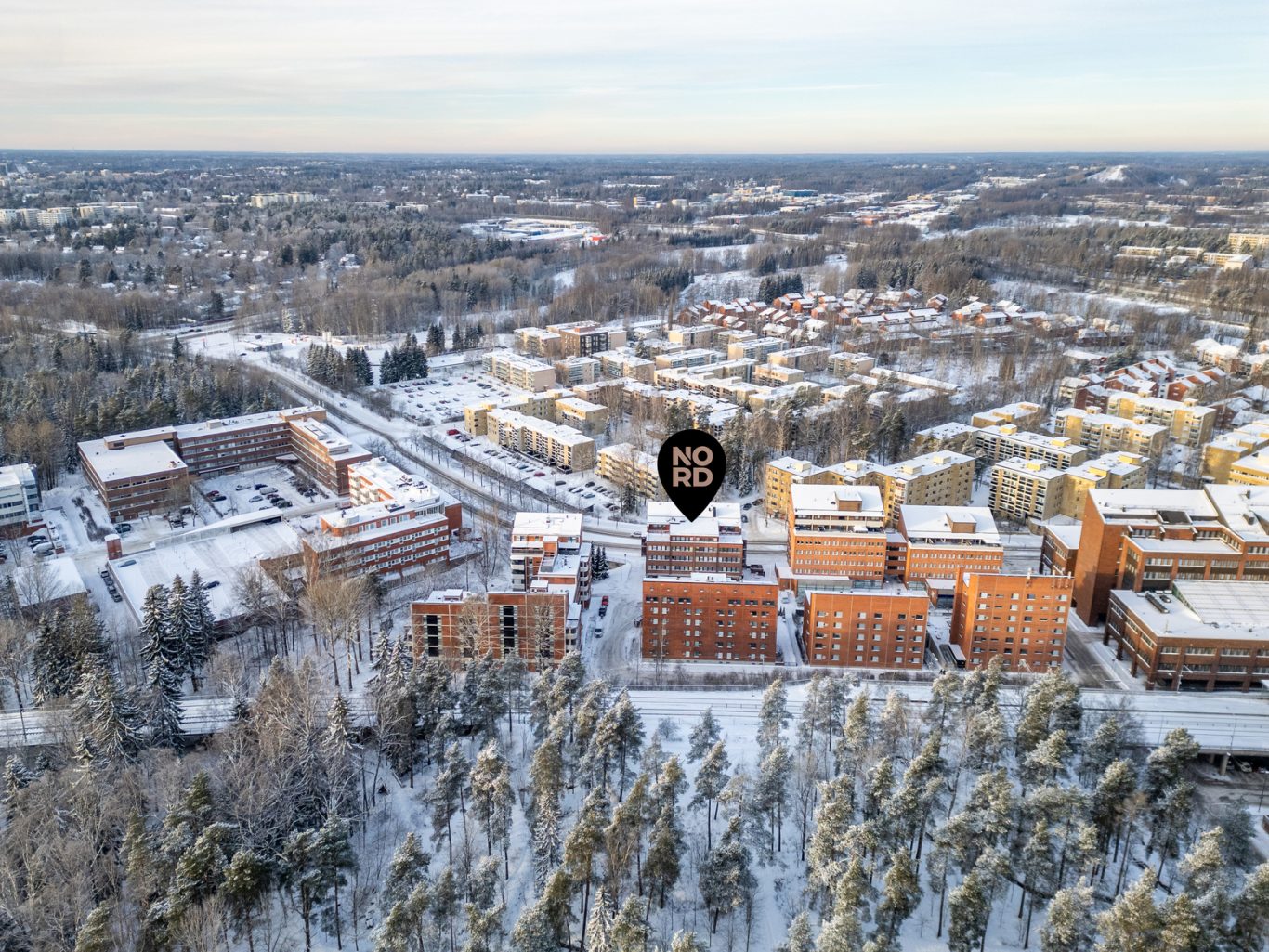 Sijainti on yksi asunnon suurimmista vahvuuksista: liikenneyhteydet ovat kaikin puolin erinomaiset, ja junalla hurauttaa keskustaan 12 minuutissa. Aivan lähistöltä löytyy kattava valikoima palveluita, kuten kauppa, apteekki, ravintoloita ja liikuntamahdollisuuksia, eikä luonnosta tarvitse tinkiä – monipuoliset ulkoilualueet alkavat melkein kotiovelta. Kauppakeskus Kaari kattavine palveluineenkin on vain kilometrin päässä