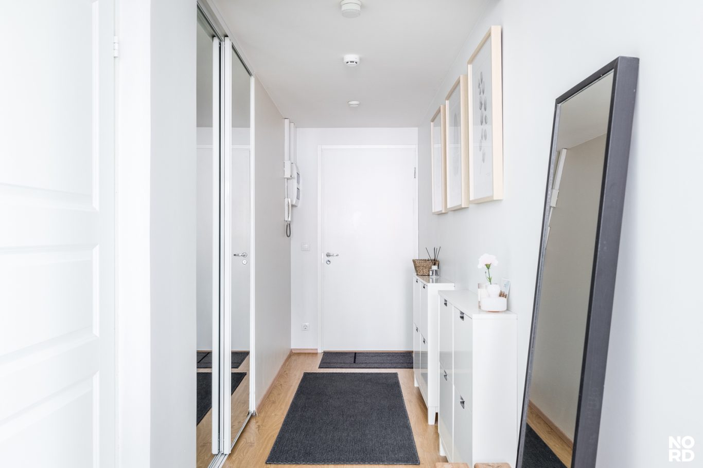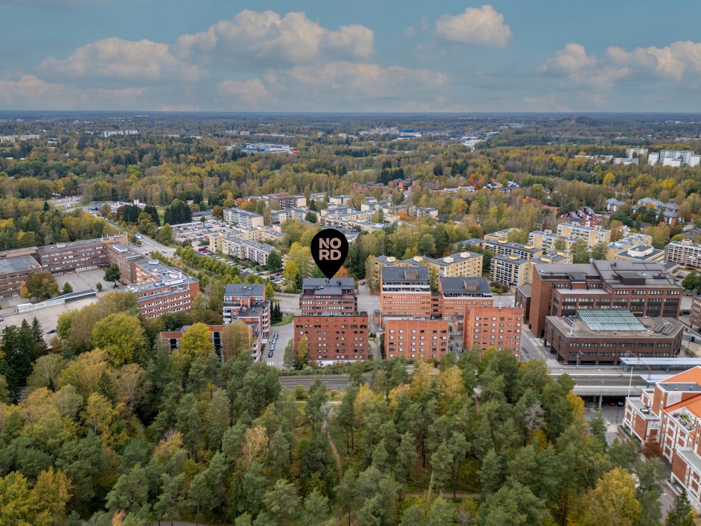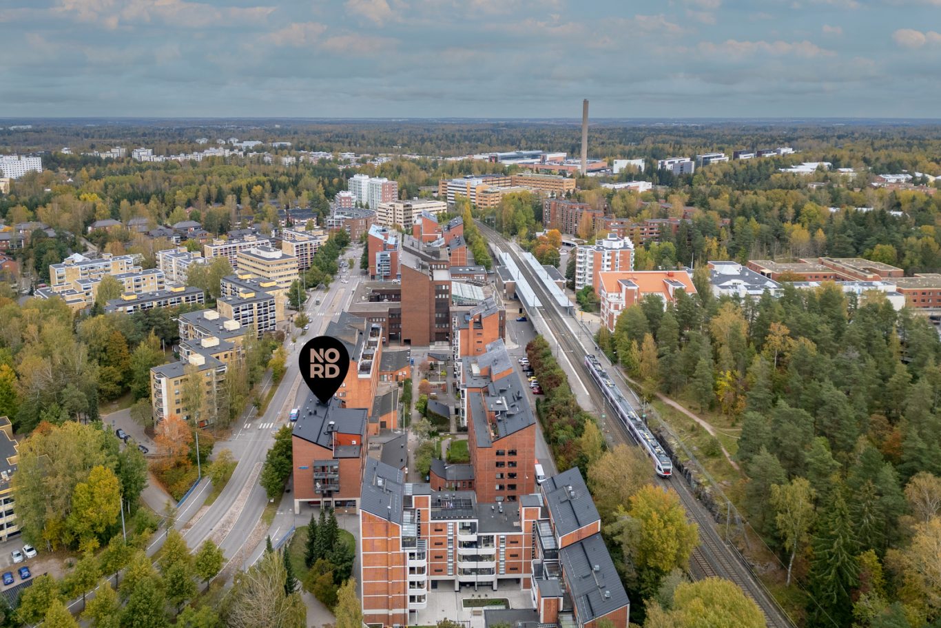 Sijainti on yksi asunnon suurimmista vahvuuksista: liikenneyhteydet ovat kaikin puolin erinomaiset, ja junalla hurauttaa keskustaan 12 minuutissa. Aivan lähistöltä löytyy kattava valikoima palveluita, kuten kauppa, apteekki, ravintoloita ja liikuntamahdollisuuksia, eikä luonnosta tarvitse tinkiä – monipuoliset ulkoilualueet alkavat melkein kotiovelta. Kauppakeskus Kaari kattavine palveluineenkin on vain kilometrin päässä.