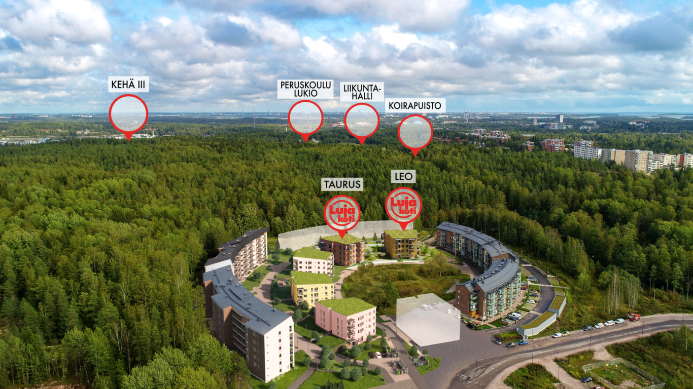 Lenkille pääsee suoraan pihakannelta Espoon keskuspuiston upeisiin maisemiin, jossa talvella latuja ja muina vuoden aikoina lenkkimaastoa riittämiin.