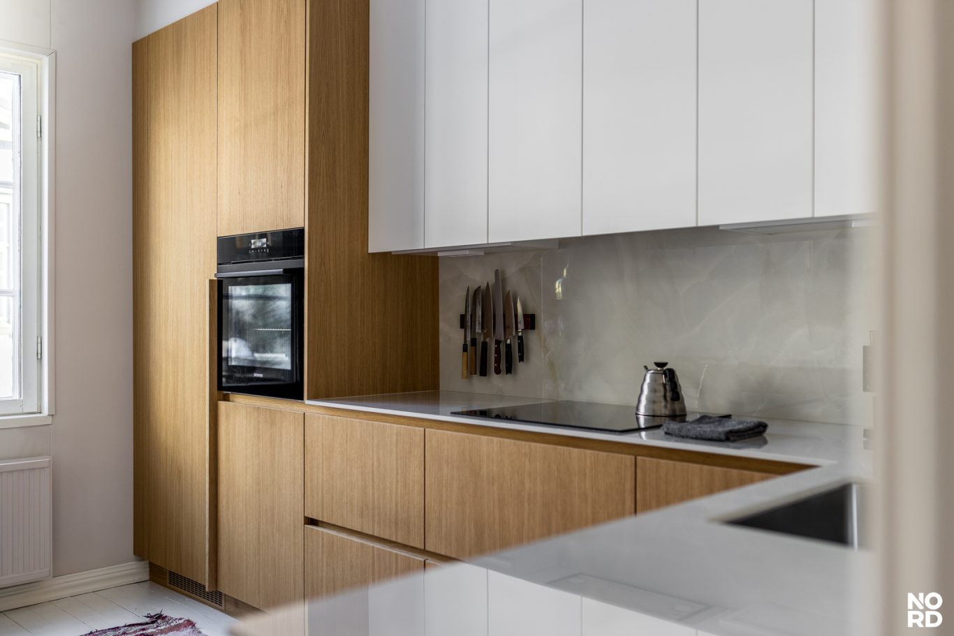 Tehdyt korjaukset | Arkkenin Suomessa seppien käsityönä valmistama keittiö 2024. Asunnossa uudistettiin kaikki sähkökalusteet ja asennettiin kolmivaihekiskot kattoon Edellisen omistajan aikana: Asunto on 2024 valmistunut kattavasta remontista: lattialaudat kunnostettiin ja maalattiin. Asuntoon tehtiin kattava pintaremontti, jonka yhteydessä keittiö ja kylpyhuone uusittiin täydellisesti. |