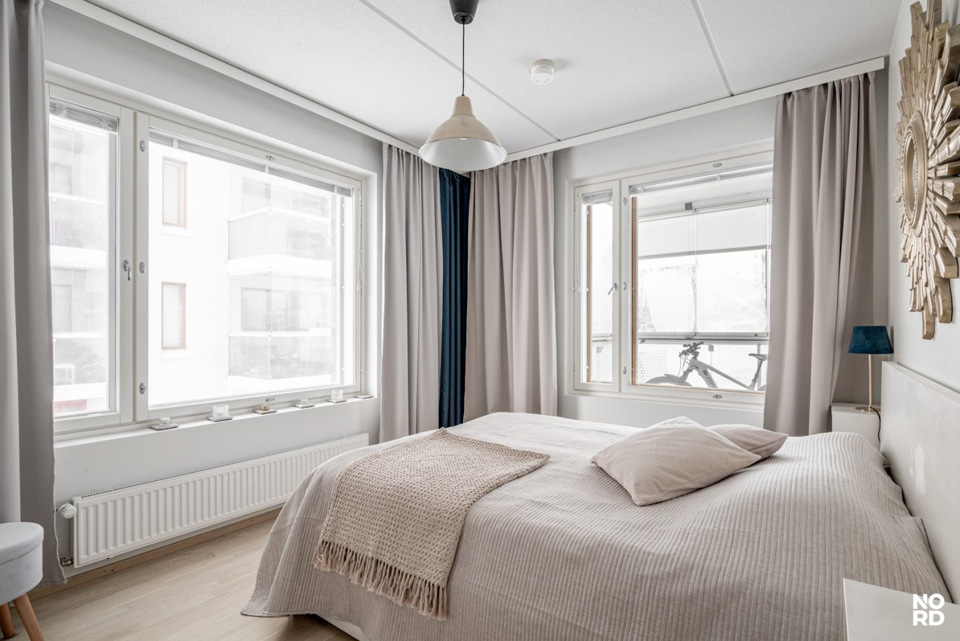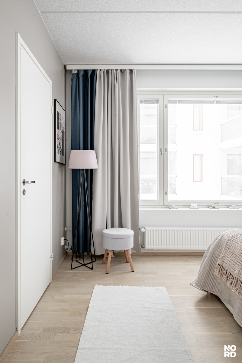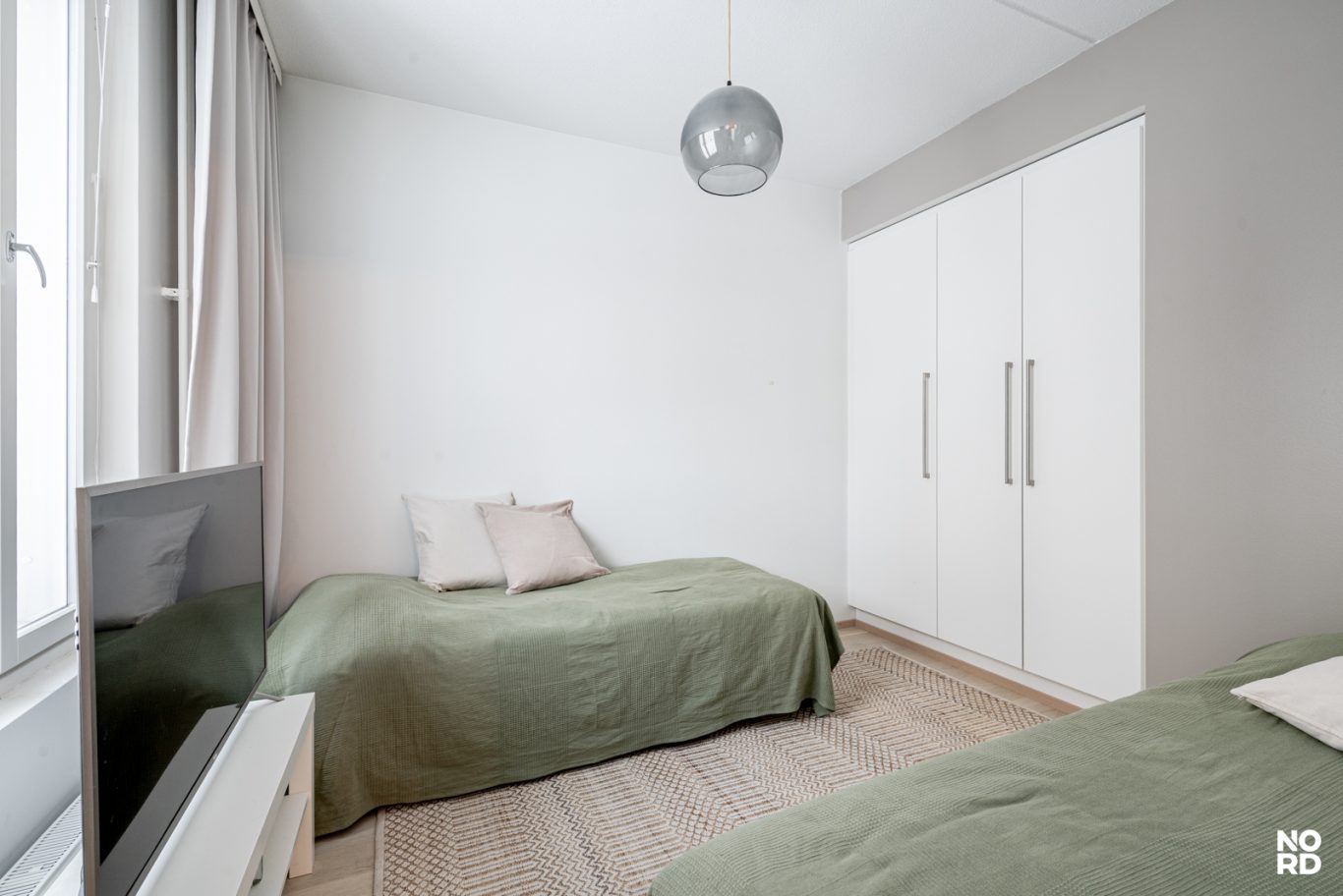 Kaksi makuuhuonetta eri puolilla asuntoa. Kylpyhuone, jossa toisella seinällä taso, jonka alle sopii hyvin pesukone, ja näin arjen pyykkihuolto hoituu kätevästi. Eteinen, josta käynti myös suoraan kylpyhuoneeseen.
