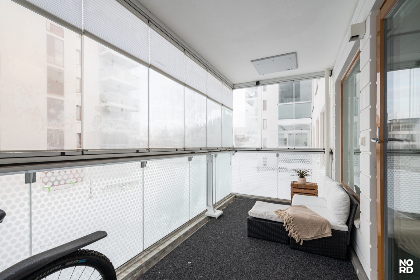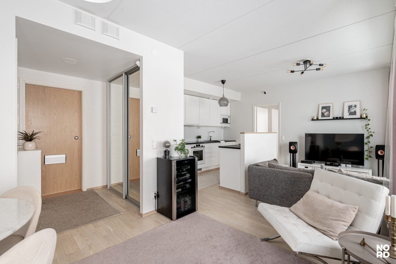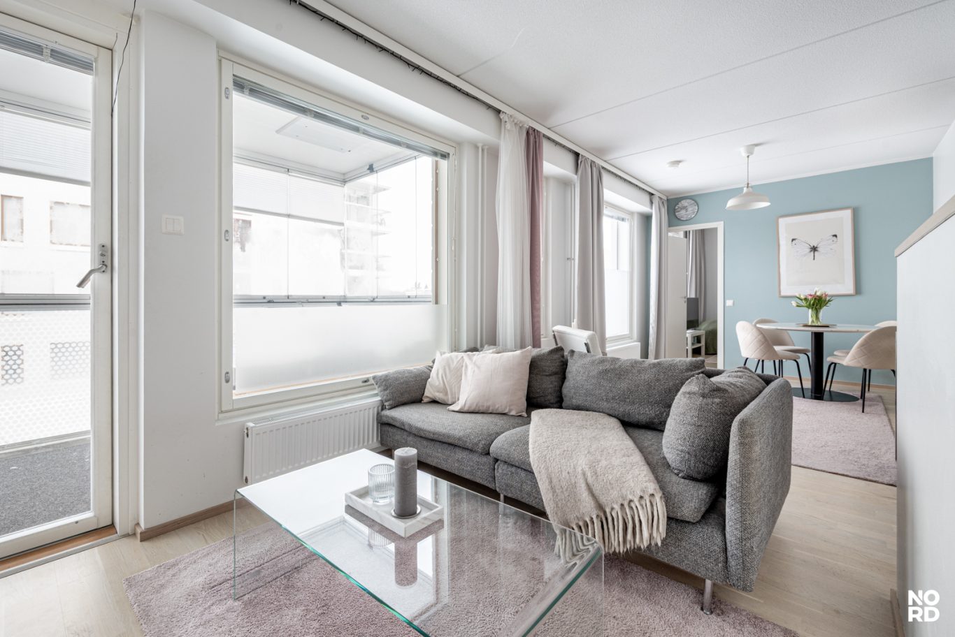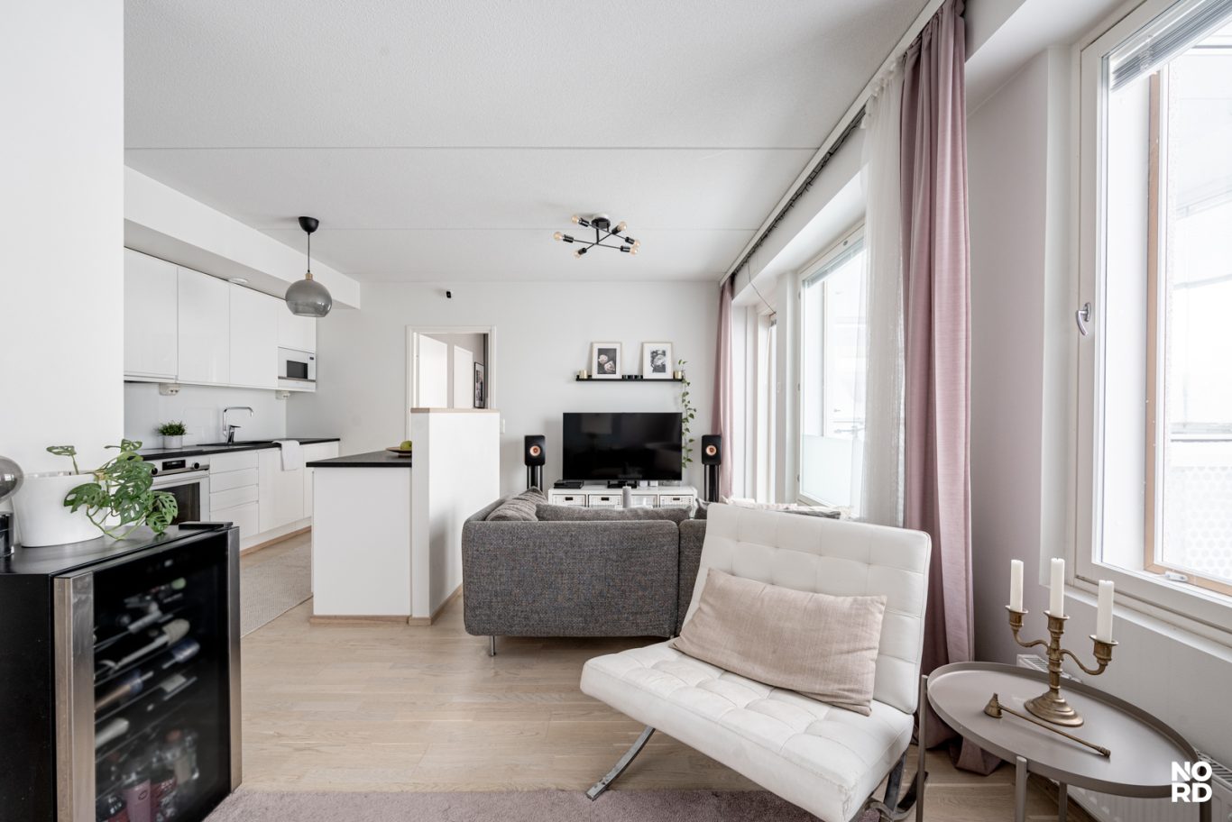 Pohjaratkaisu mahdollistaa sisustuksen eri tavoin, sillä avokeittiö on mukavasti huoneen reunalla. Valoisa olohuone, josta käynti tilavalle lasitetulle parvekkeelle sisäpihan näkymin.
