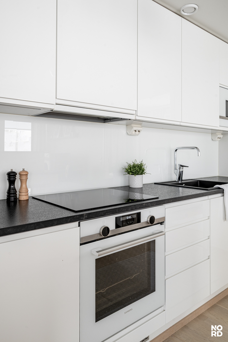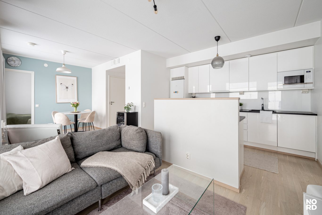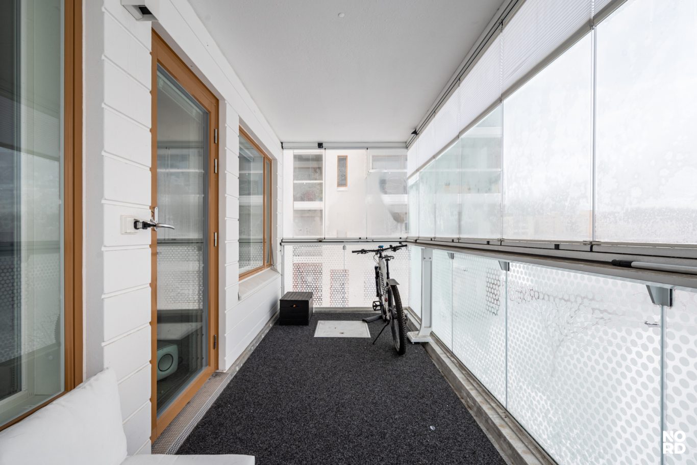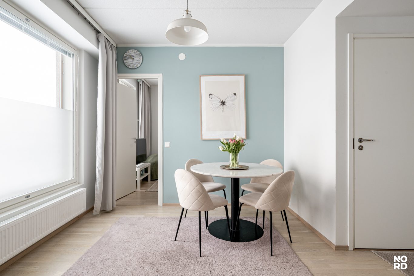 Pohjaratkaisu mahdollistaa sisustuksen eri tavoin, sillä avokeittiö on mukavasti huoneen reunalla. Valoisa olohuone, josta käynti tilavalle lasitetulle parvekkeelle sisäpihan näkymin.