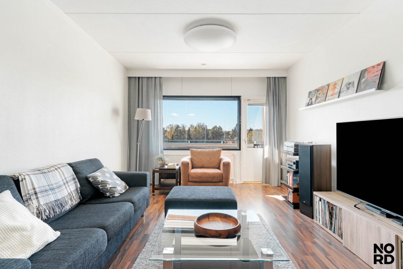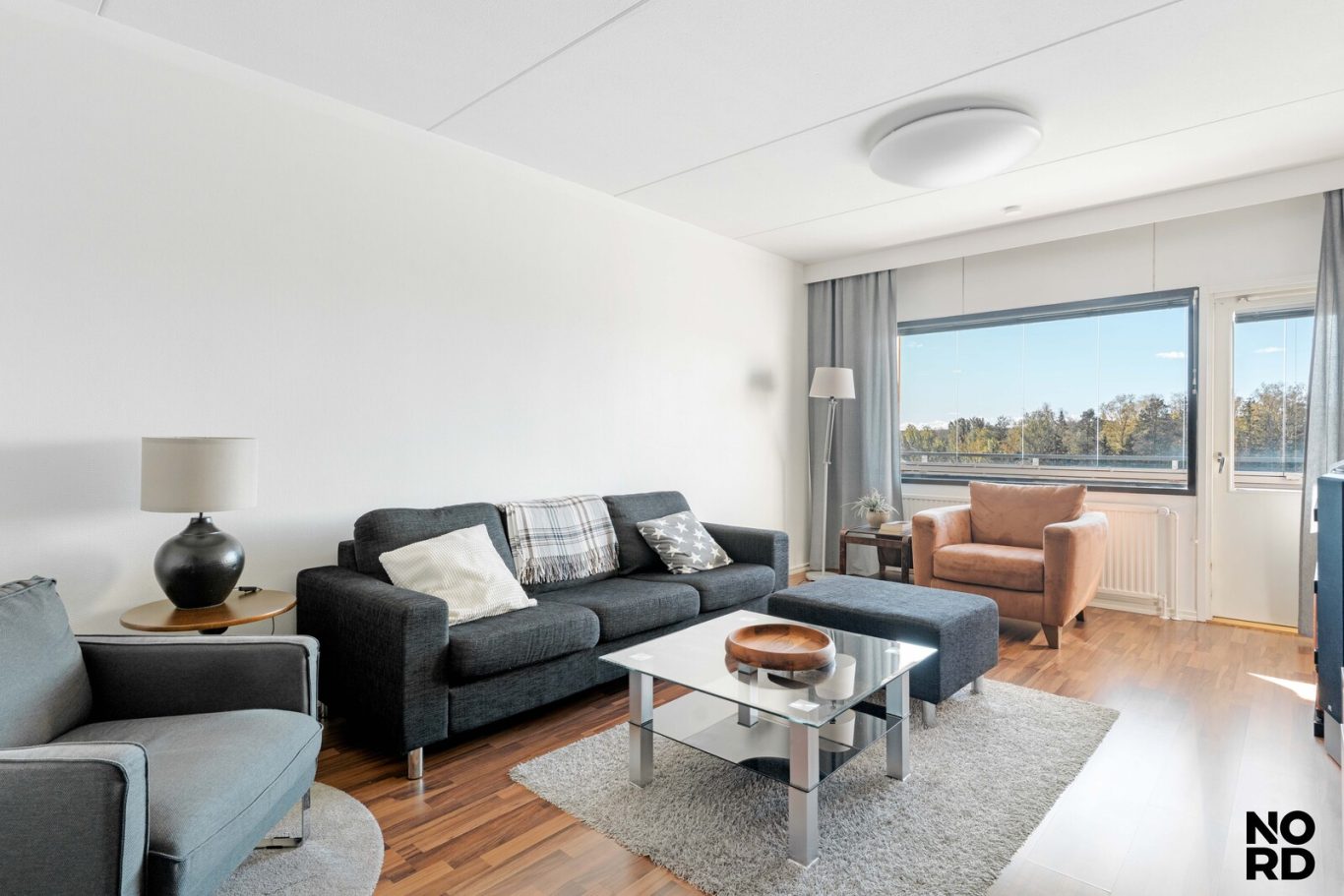 Asunnos on iso ja valoisa olohuone, johon mahtuu mukavasti kalusteita