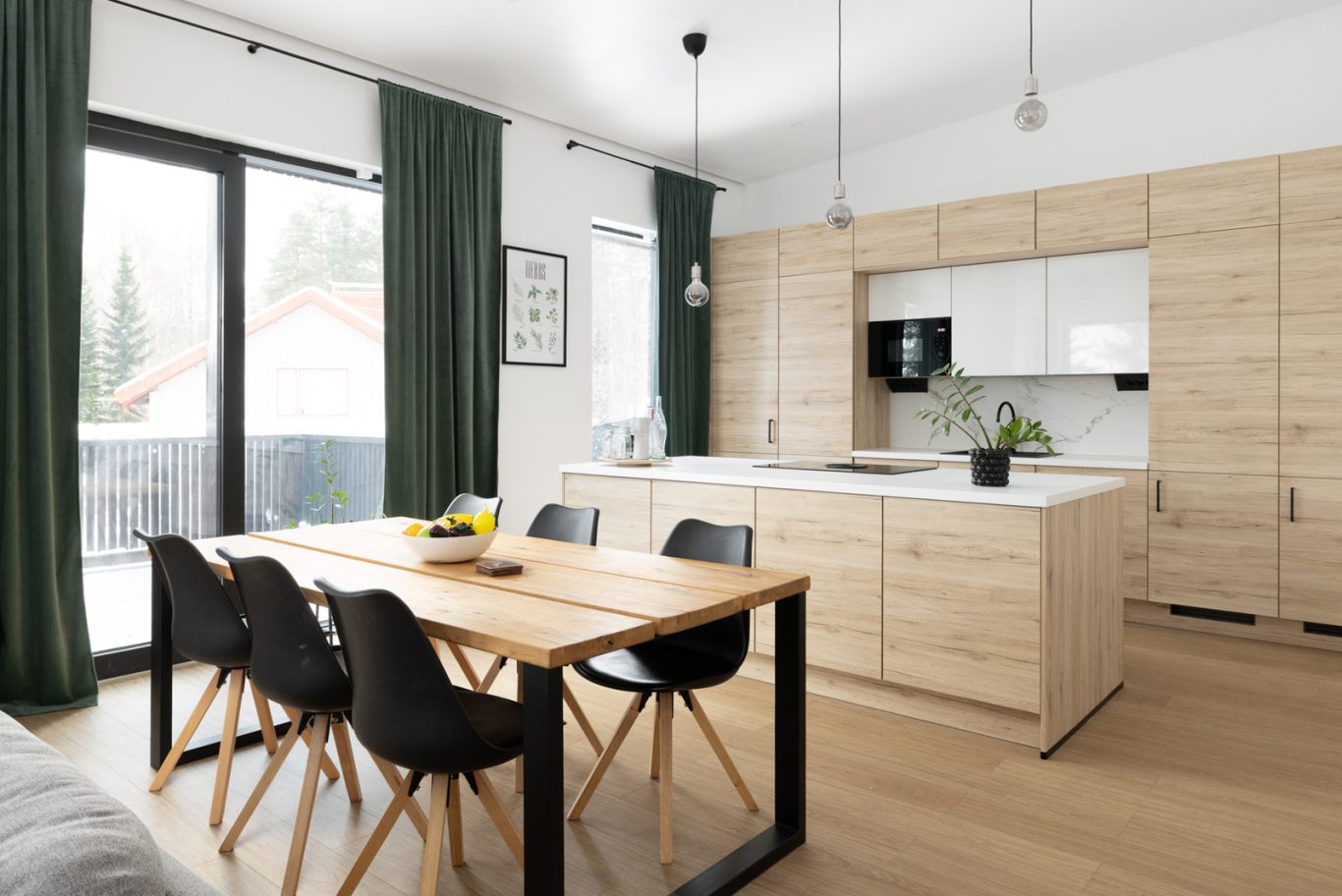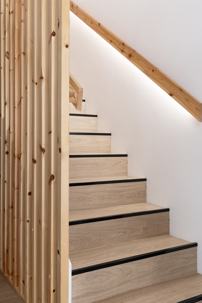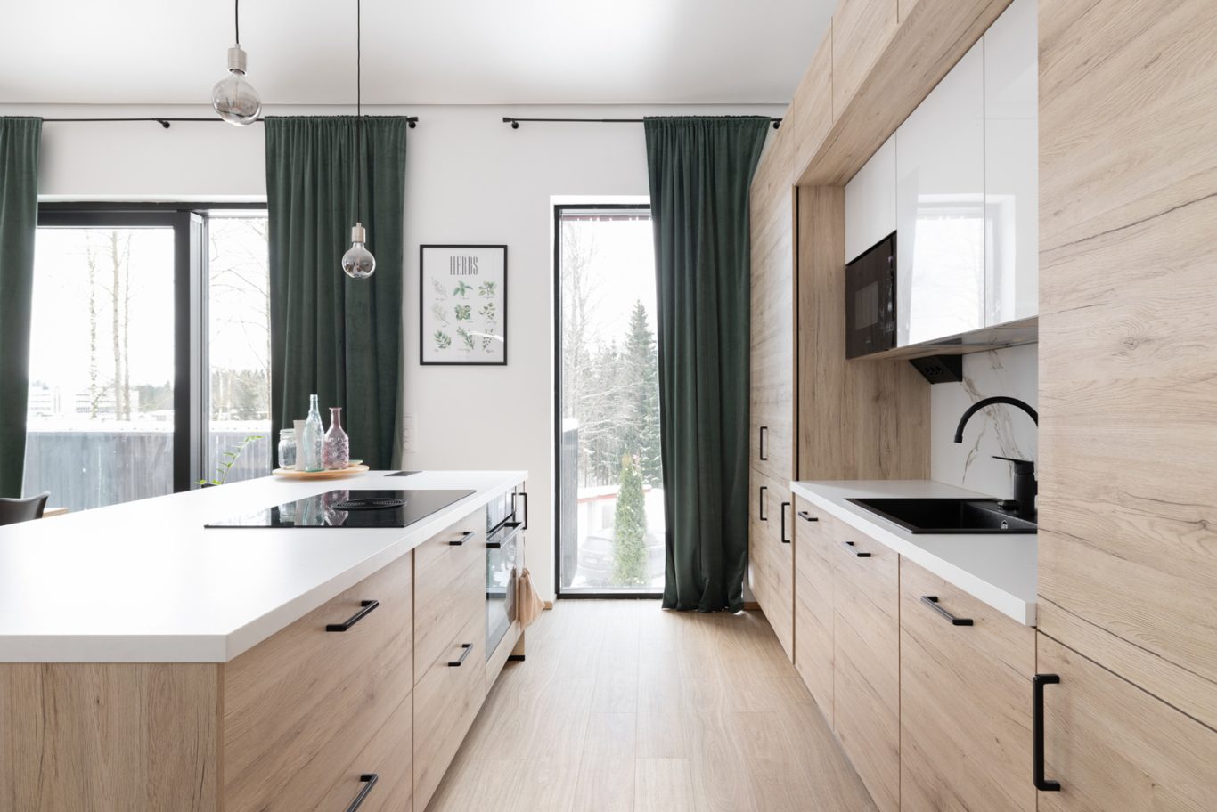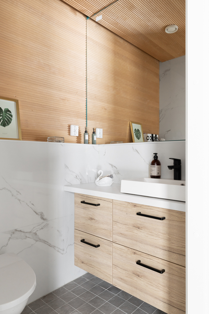 Yläkerran henkeäsalpaava, yhtenäinen oleskelutila ja keittiö muodostavat kodin sydämen. Lattiasta kattoon ulottuvat ikkunat tulvivat luonnonvaloa sisään, ja viistokatto nostaa huonekorkeuden vaikuttavaan yli neljään metriin. Tyylikäs Noblessa-keittiö erillisellä jääkaapilla ja pakastimella tarjoaa runsaasti säilytystilaa, ja integroidulla liesituulettimella varustettu liesi viimeistelee modernin kokonaisuuden. Keittiön ovien tammikuosi toistuu kodin muissa tiloissa luoden harmonisen ja ajattoman ilmeen.