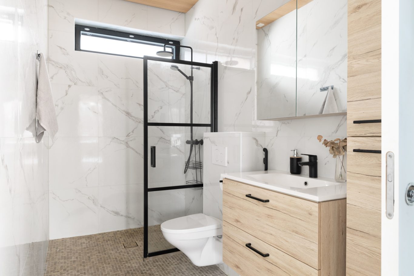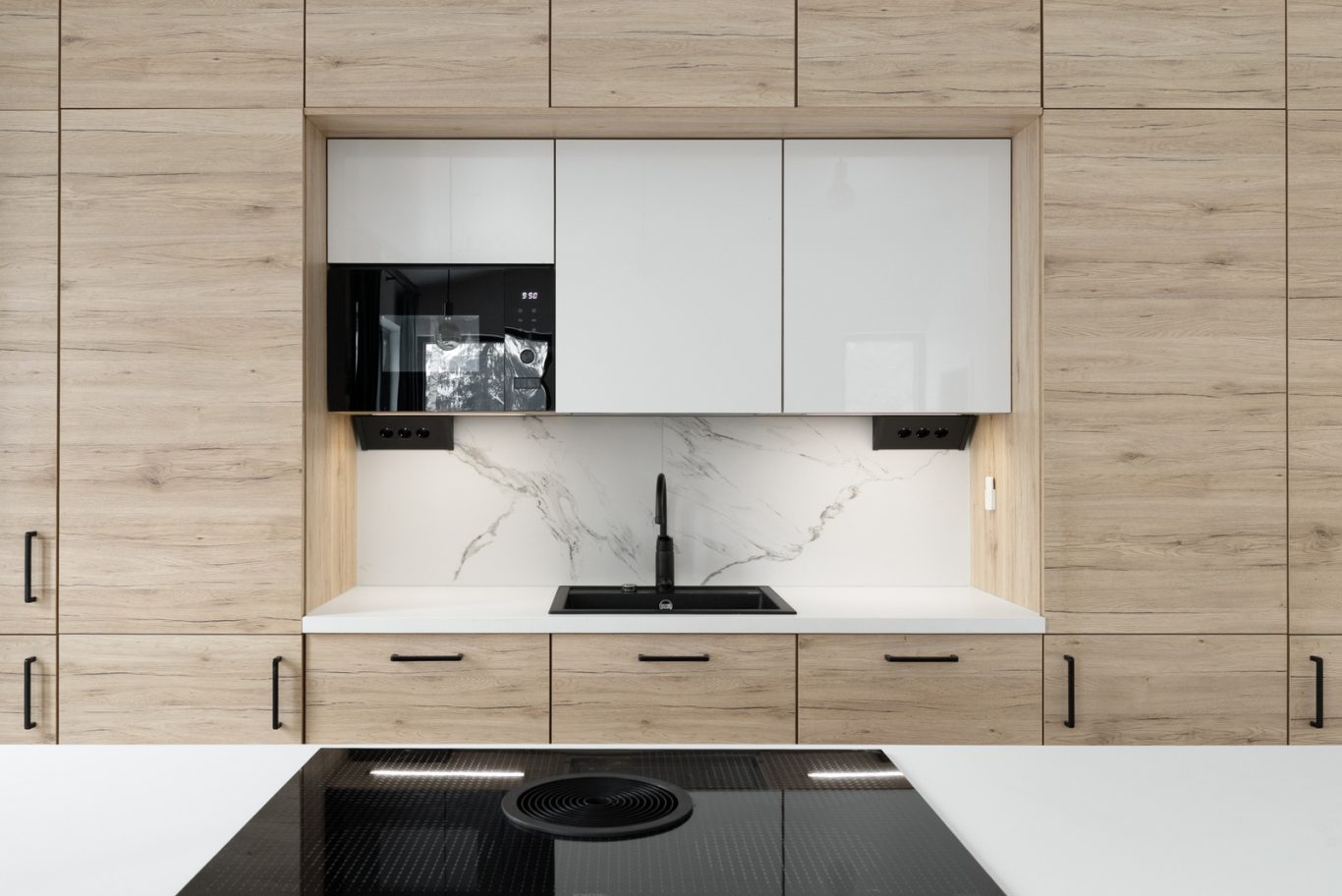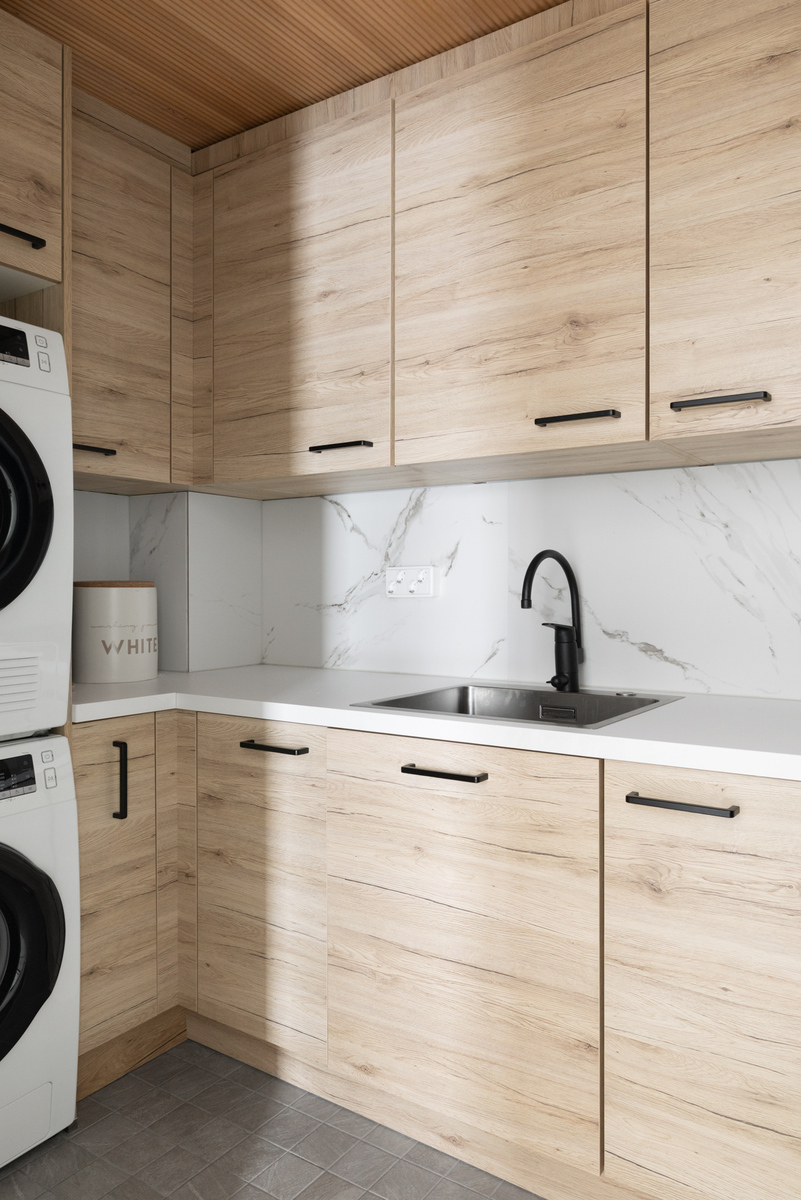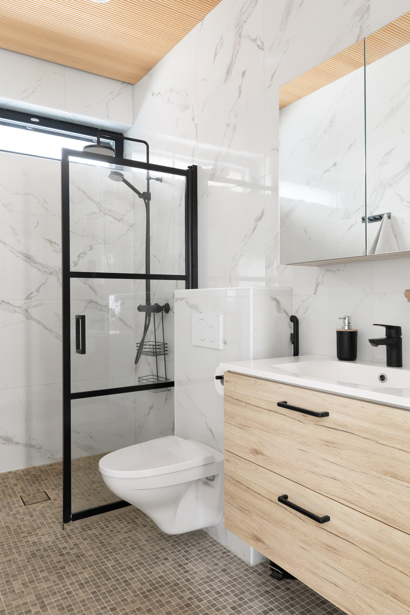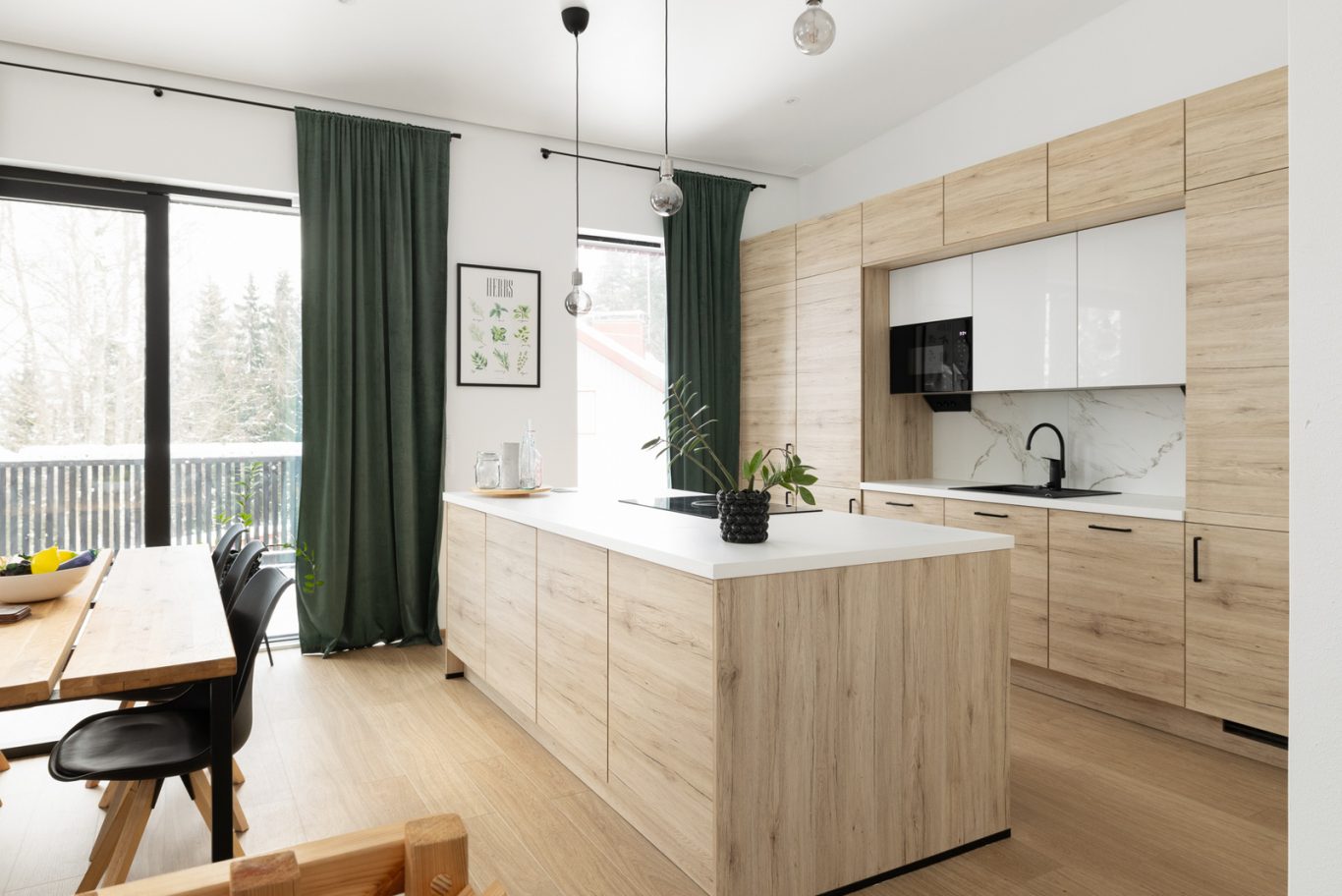 Yläkerran henkeäsalpaava, yhtenäinen oleskelutila ja keittiö muodostavat kodin sydämen. Lattiasta kattoon ulottuvat ikkunat tulvivat luonnonvaloa sisään, ja viistokatto nostaa huonekorkeuden vaikuttavaan yli neljään metriin. Tyylikäs Noblessa-keittiö erillisellä jääkaapilla ja pakastimella tarjoaa runsaasti säilytystilaa, ja integroidulla liesituulettimella varustettu liesi viimeistelee modernin kokonaisuuden. Keittiön ovien tammikuosi toistuu kodin muissa tiloissa luoden harmonisen ja ajattoman ilmeen.