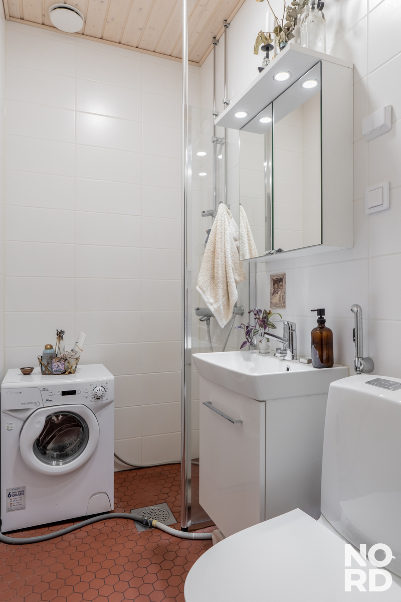 Tässä kodissa saa rahoilleen todella hyvin vastinetta. Korkea huonekorkeus tekee tilasta neliöitään suuremman tuntuisen, ja tilava parvi mahdollistaa alakerran käytön kokonaan olohuoneena ja avokeittiönä. Kylpyhuone on reilun kokoinen ja sinne mahtuu helposti pyykinpesukone. Eteisessä on myös hyvin säilytystilaa.