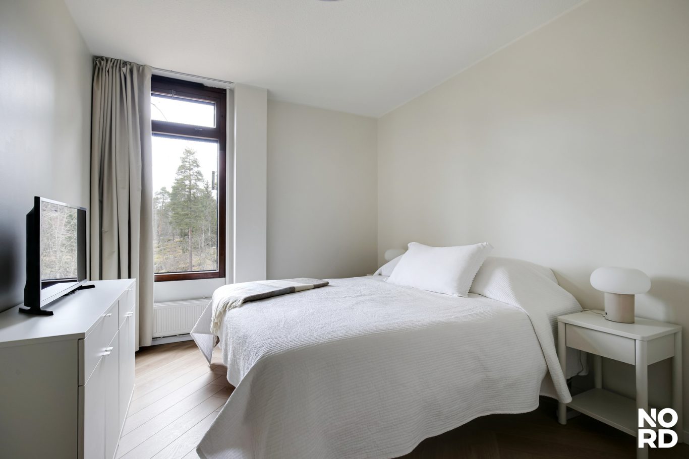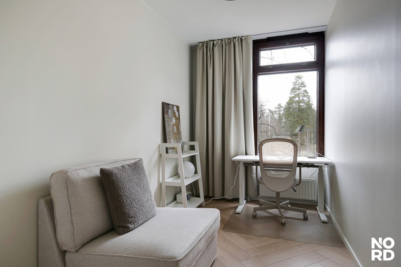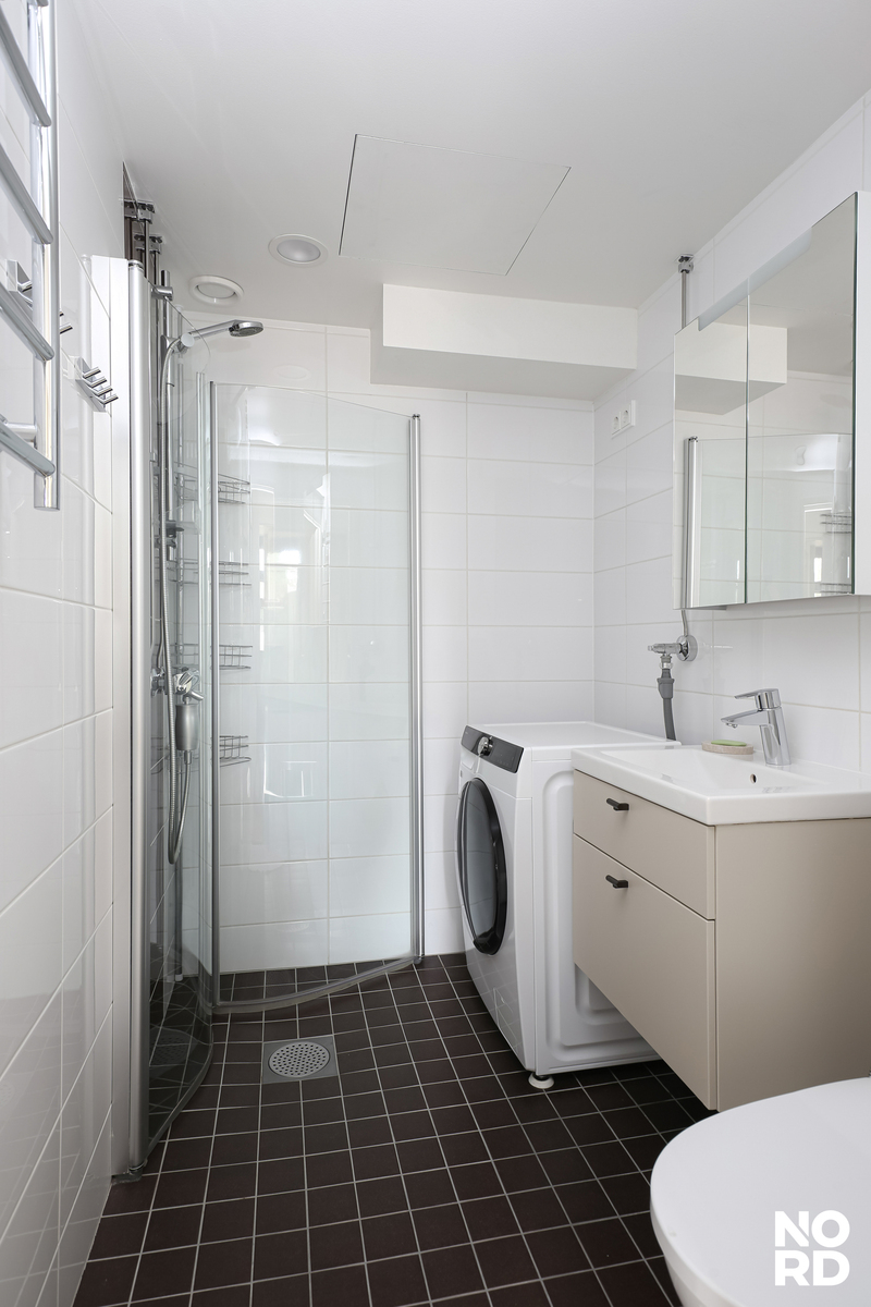 Päämakuuhuone on reilu niin nukkumiseen kuin etätyöskentelyynkin. Myös toinen makuuhuone on viihtyisiä. Molemmista makuuhuoneista avarat ja vehreät ikkunanäkymät. Makuuhuoneiden lähellä on raikkaalla ja hyvällä maulla toteutettu kylpyhuone/wc, jossa on tilaa pyykinpesukoneellekin.