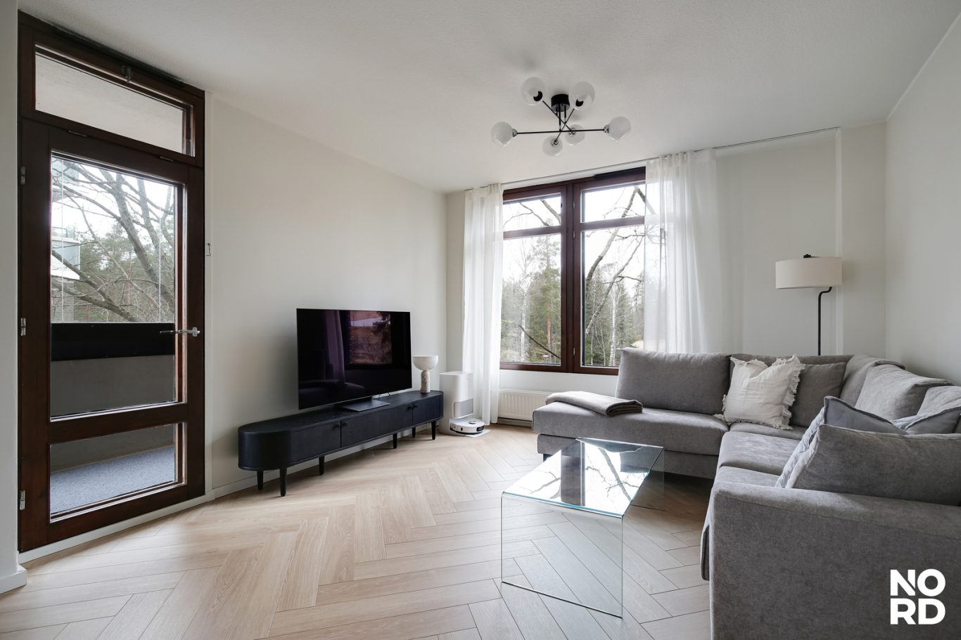 Myös olohuone on mitoitukseltaan hyvä ja sinne mahtuu kunnolliset kalusteet. Olohuoneesta on käynti viihtyisälle lasitetulle länsiparvekkeelle. Asunnon lattiat ovat kylpyhuonetta lukuun ottamatta toteutettu kestävällä Parador-julkisivulaminaatilla tyylikkäällä kalanruotoladonnalla.