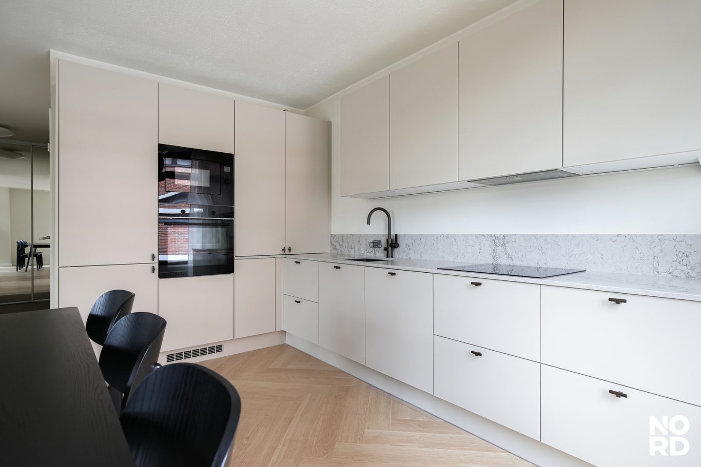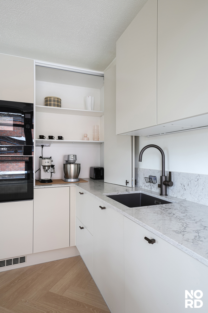Hieno cafe latten-värinen Parma-keittiö on suunniteltu arkielämän käytännön tarpeet huomioon ottaen. Keittiöön on haluttu valita arvokkaitakin tuotteita kuten aamiaiskaappi, pyrolyysiuuni ja puristekiveä olevat tasot, jotka jatkuvat osin välitilaankin. Ruokailutilaan mahtuu kuuden tai jopa kahdeksan henkilön ruokailuryhmä ilman ahtauden tunnetta.