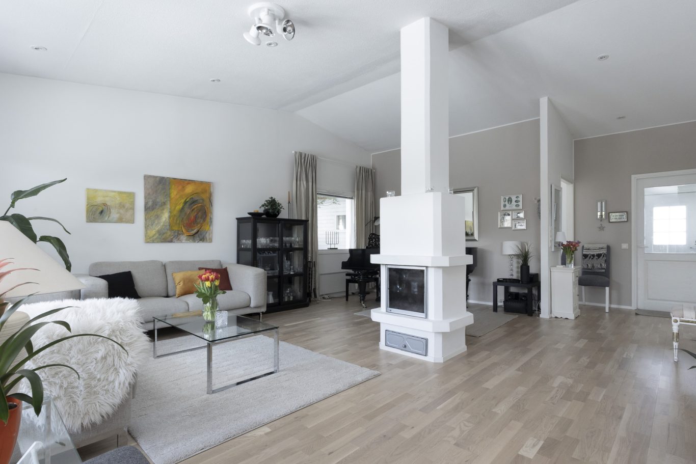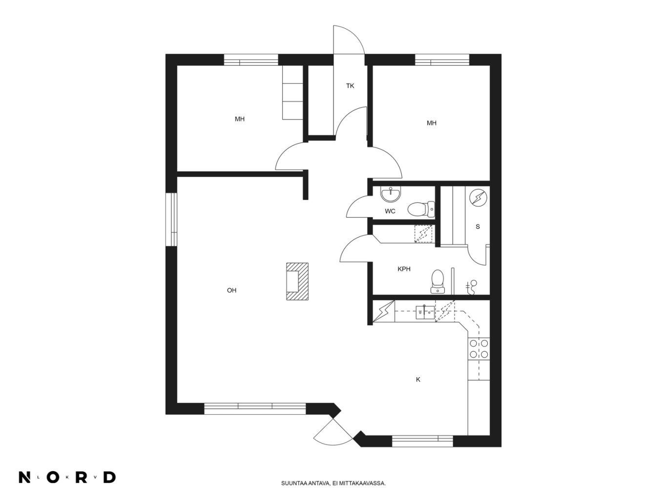 Tämän jykevän kivitalon pohjaratkaisu on yhdessä tasossa ja poikkeuksellisen toimiva. Alkuperäinen pohja on ollut 4h+k, mutta yksi makuuhuone on poistettu, jotta olohuoneesta on saatu erityisen avara ja valoisa. Tarvittaessa huone on myös mahdollista palauttaa helposti takaisin makuuhuonekäyttöön.