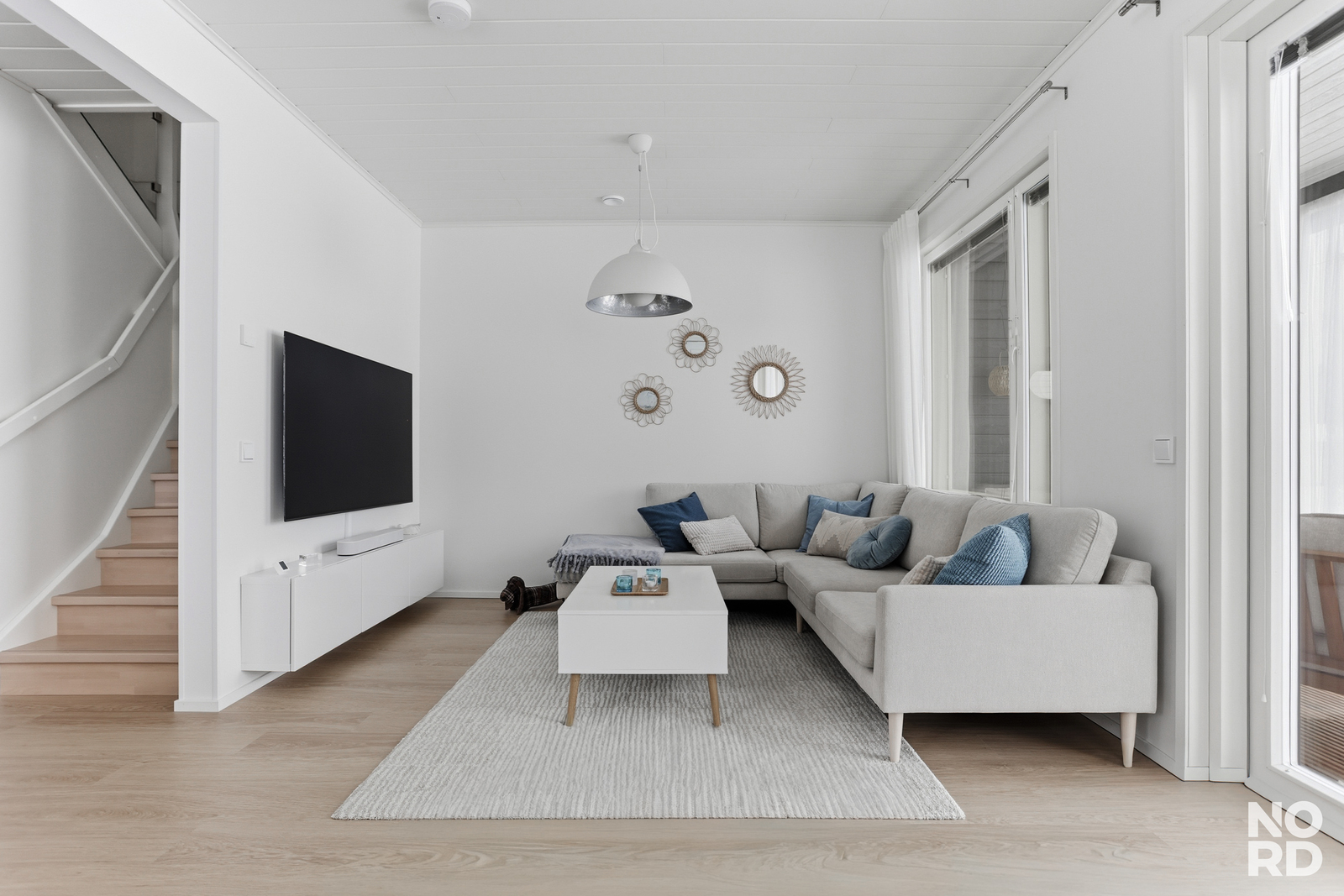 Avara oleskelutila ja suuret ikkunat tuovat runsaasti luonnonvaloa. Maalämpö ja vesikiertoinen lattialämmitys pitävät asumiskulut kurissa, ja ilmalämpöpumppu tuo lisämukavuutta kesään.