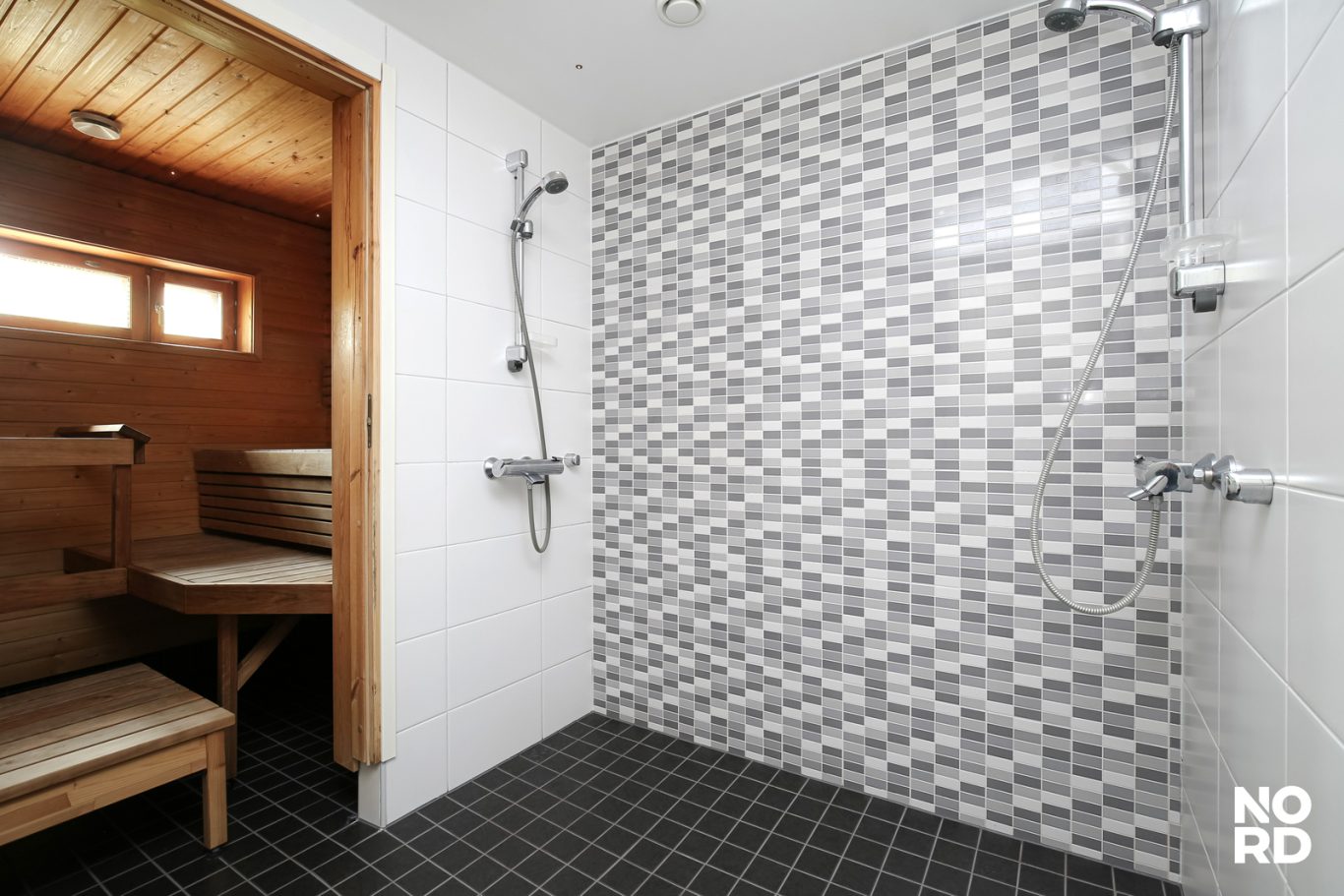 Asunnon pohjaratkaisu on käytännöllinen ja hyvin suunniteltu. Kummassakin kerroksessa on wc- ja suihkutilat. Yläkerrassa on tilava kylpyhuone/wc yhdellä suihkulla ja alakerrassa saunan pesuhuoneessa on kaksi suihkua sekä erillis-wc. Kodinhoitohuoneessa on sopivasti tilaa pyykkihuollolle ja pyykkitornille. Eteisen isoissa peililiukuovikomeroissa on runsaasti säilytystilaa niin vaatteille kuin siivoustarvikkeillekin.