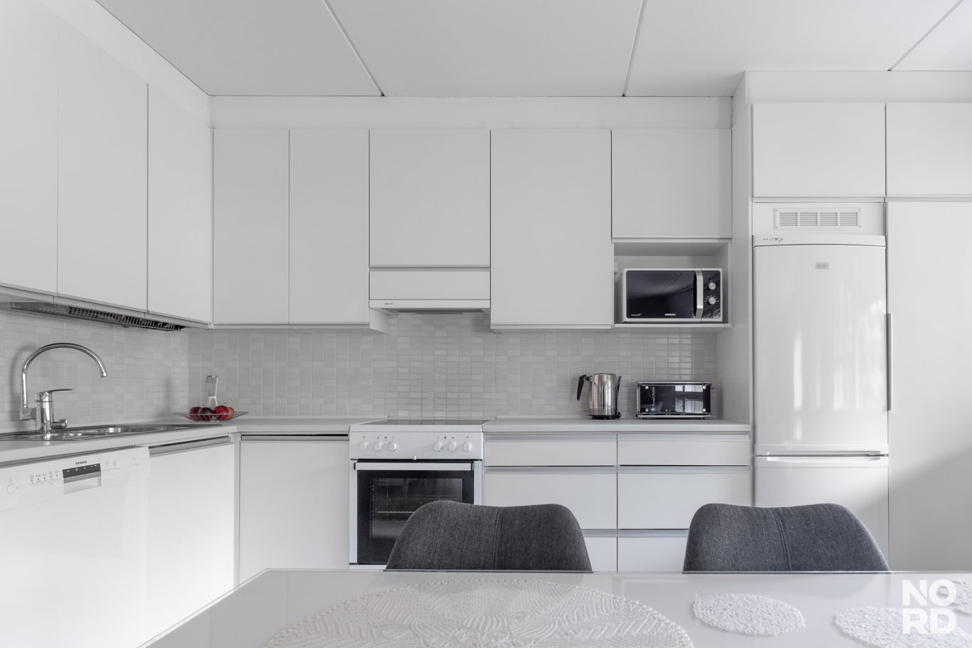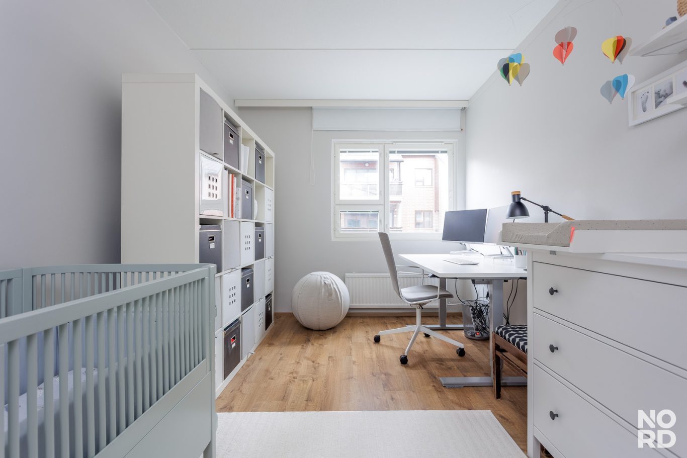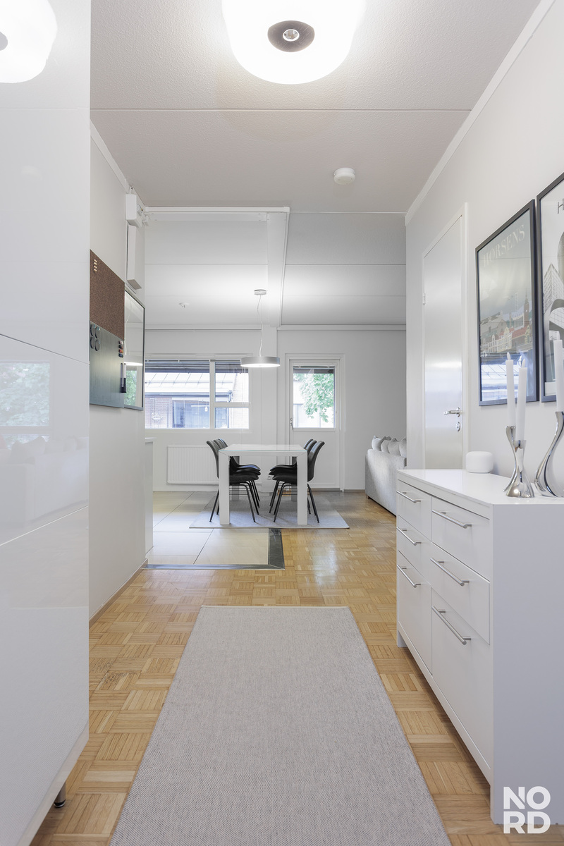 Kaunis vaalea avokeittiö tilavan olohuoneen yhteydessä. Kaksi hyvän kokoista makuuhuonetta, säilytystilana kaapistot sekä vaatehuone.