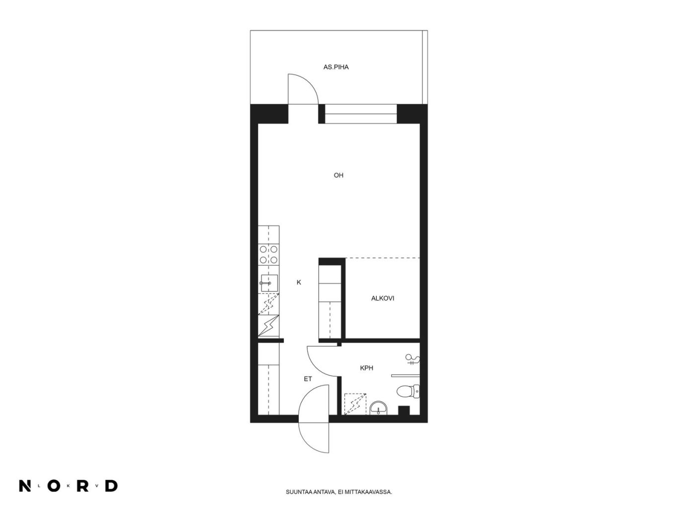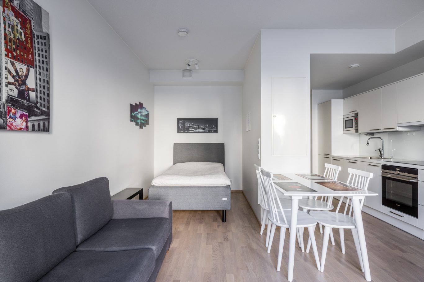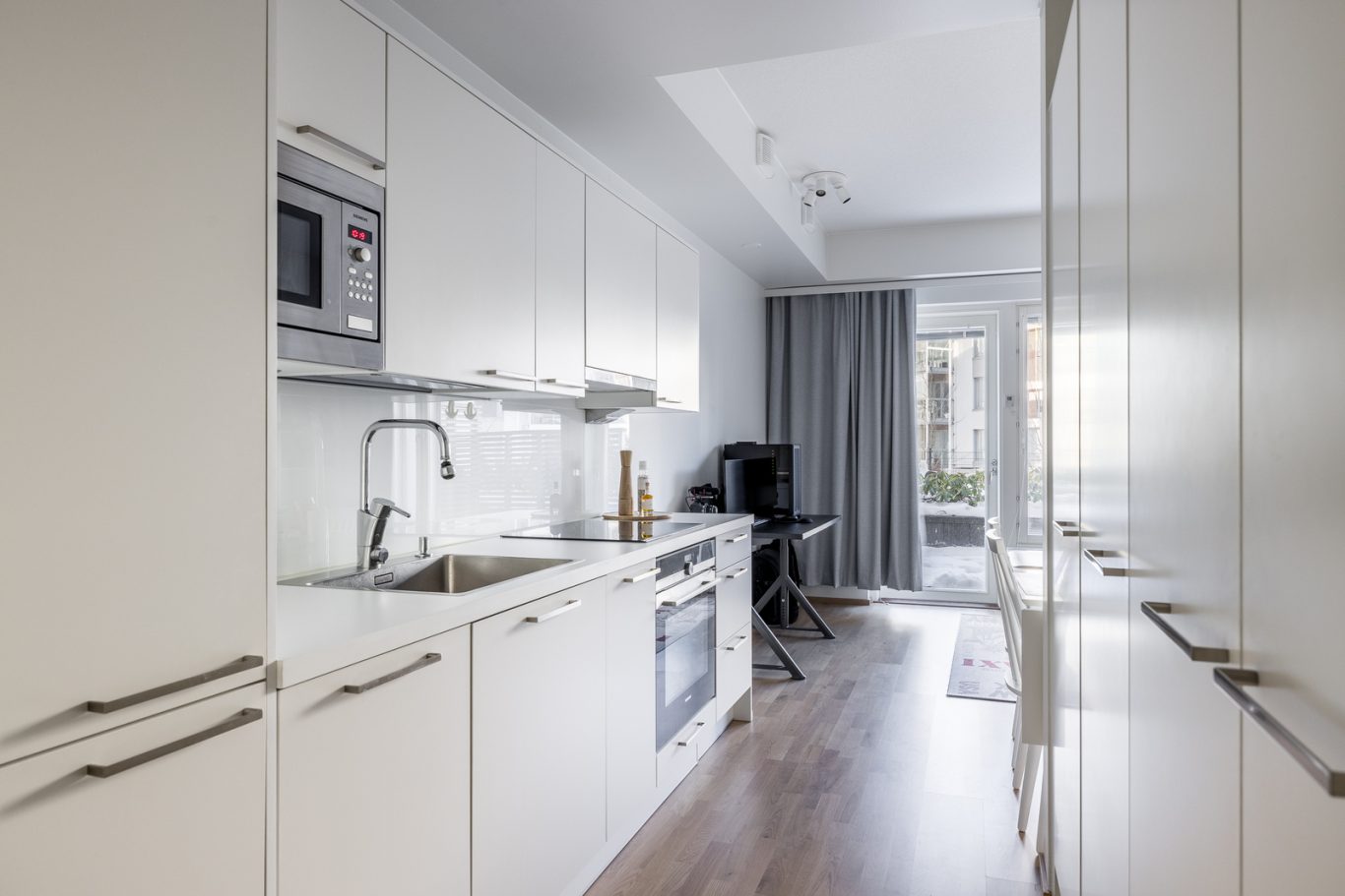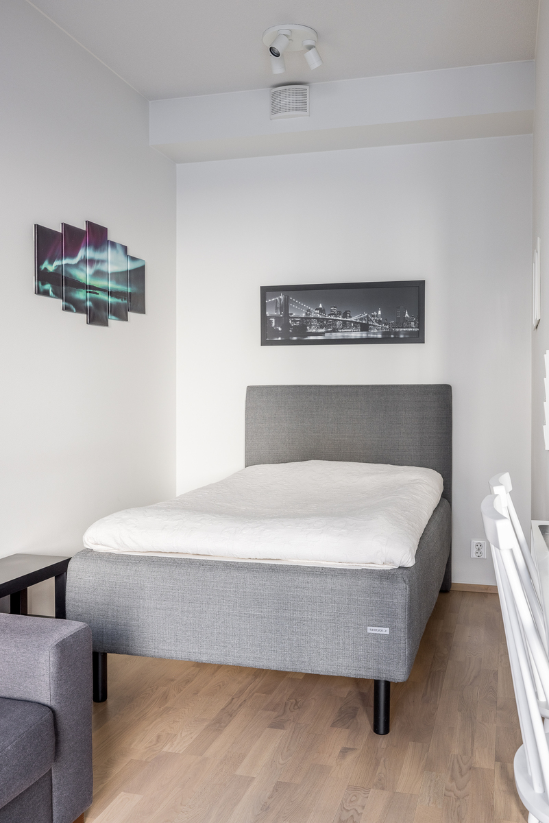 Sisustamista helpottaa alkovi, johon mahtuu hyvin suurempikin parisänky. Säilytystilaa asunnosta löytyy runsaasti eteisen liukuovikaapistoista sekä tilanjakajanakin toimivasta kiinteästä kaapistosta.