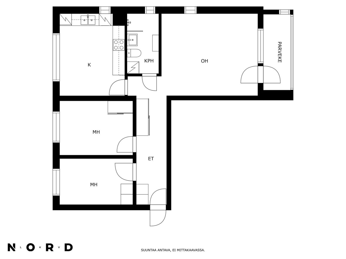 Tämä koti yhdistää kaikin puolin toimivan pohjaratkaisun ja kodikkaan tunnelman. Ikkunoita on kolmeen suuntaan, joten huoneisto on valoisa pitkin päivää. Kodin sydän on olohuone, jonka jatkeena oleva parveke avautuu suojaisalle ja vehreälle sisäpihalle. Hyvin varustetussa keittiössä on runsaasti lasku- ja kaappitilaa sekä paikka ruokapöydälle.