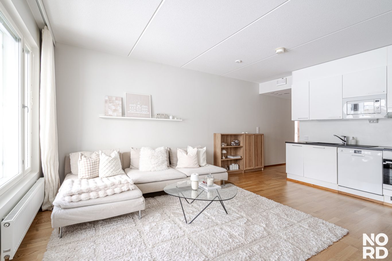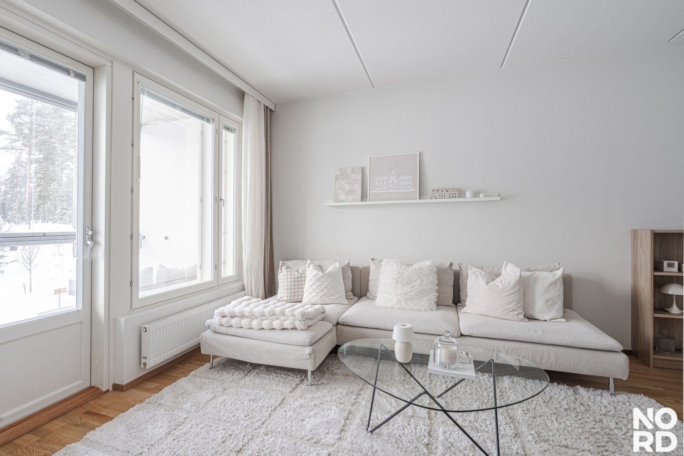Tilava olohuone jossa suuret ikkunat länteen, kaksi makuuhuonetta josta toinen on suurempi päämakuuhuone.