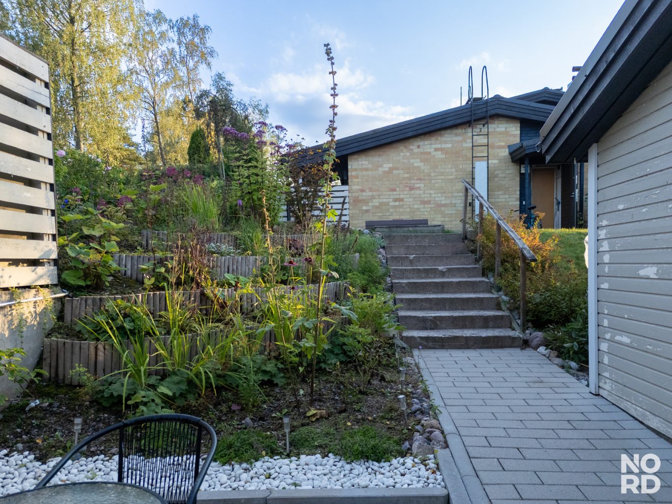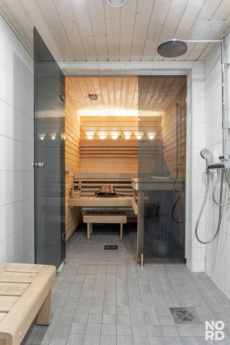 Kylpyhuoneen yhteydessä on oma sauna ja toimiva kodinhoitotila. Sisäänkäynnin vieressä sijaitseva varasto tekee arjesta sujuvampaa, varaston sekä talon väliin rakennettu valokate luo suojaisan ja kodikkaan laatoitetun oleskelualueen, täydellisen paikan ulkohetkiin säällä kuin säällä.