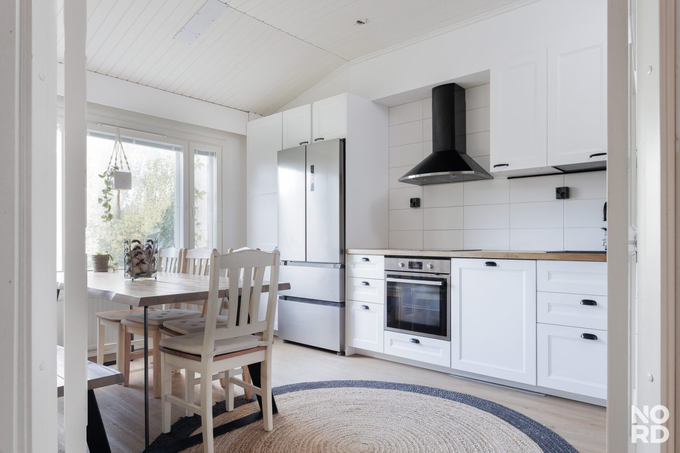 Kodikas, valoisa keittiö on kodin sydän. Siellä on runsaasti kaappi- ja työskentelytilaa, joten niin arkikokkailut kuin suuremmatkin illalliset sujuvat helposti ilman ahtauden tunnetta. Ruokailutilaan mahtuu hyvin ruokailuryhmä. Alakerrasta avautuu kulku helppohoitoiselle, vehreälle takapihalle, jossa pihan kokoinen patio tarjoaa viihtyisän paikan rentoutua ja ihailla rauhallisia, avaria peltomaisemia.