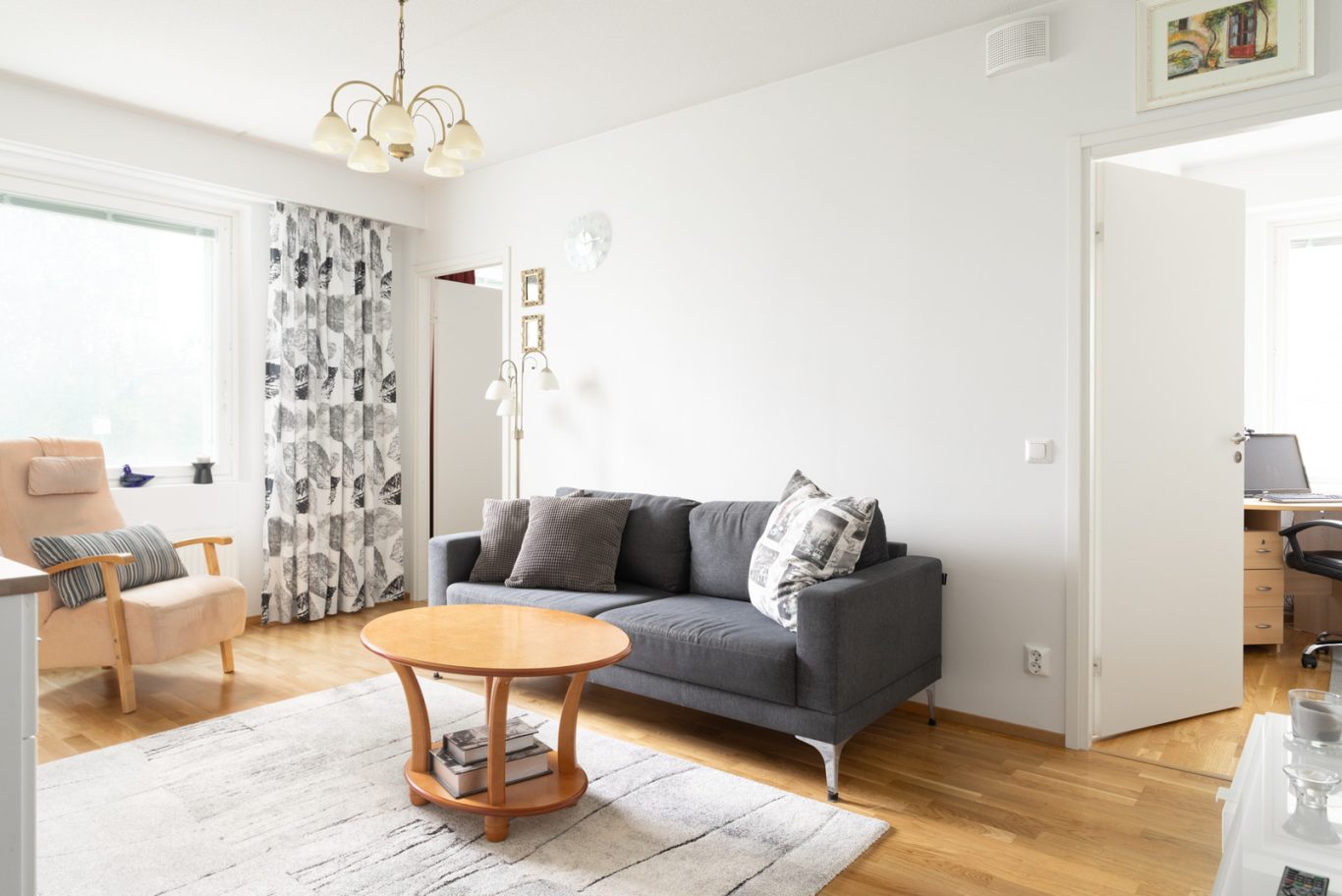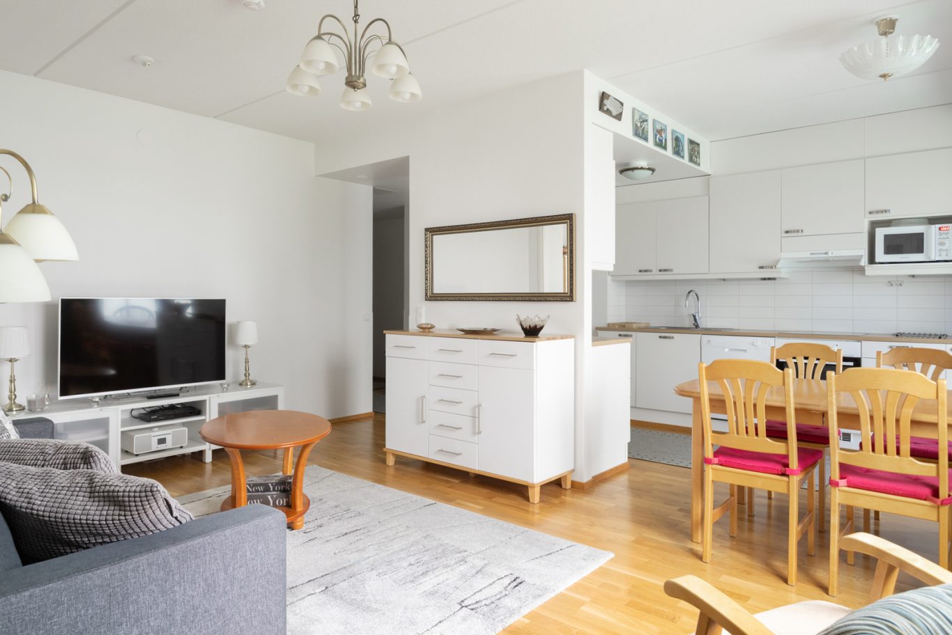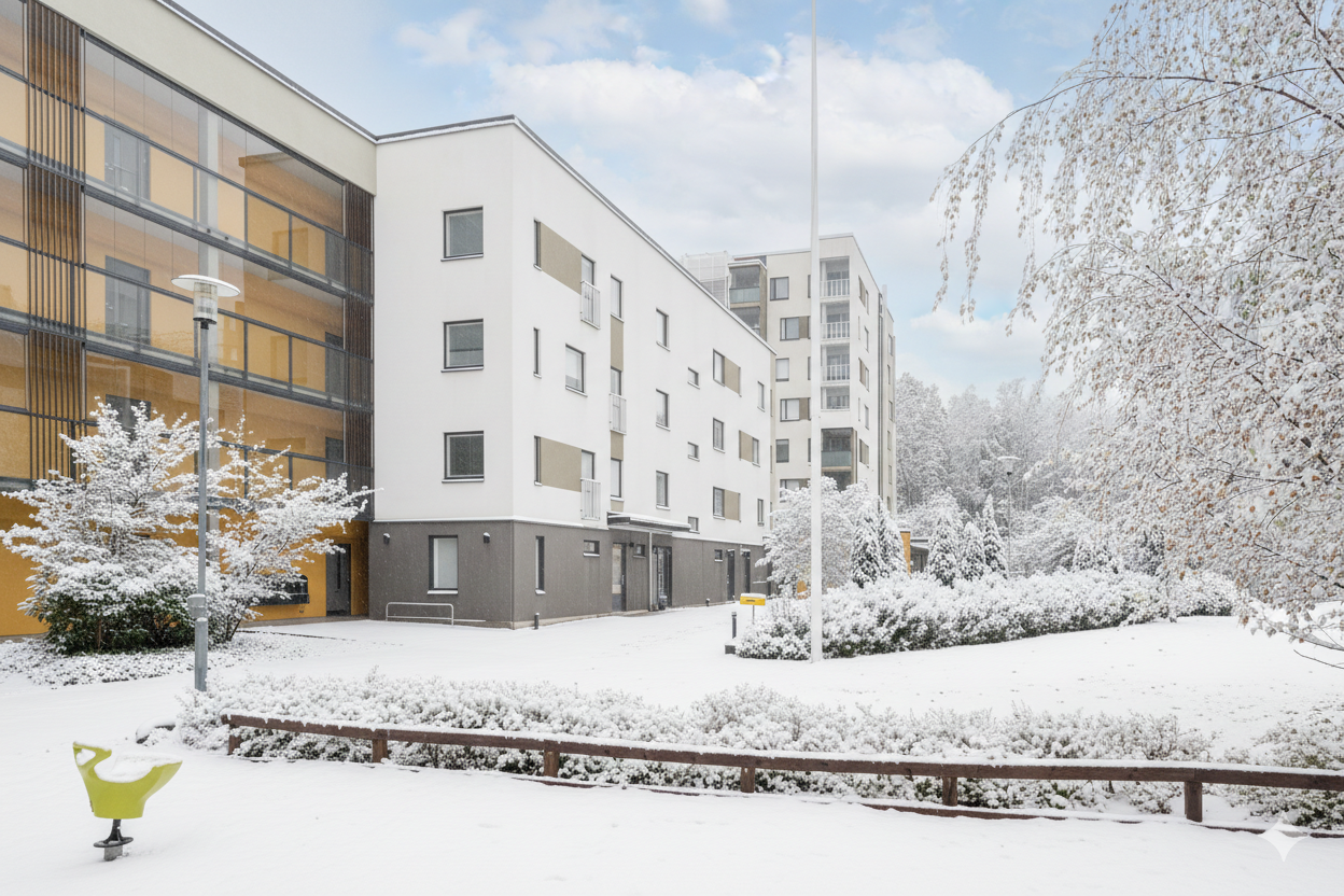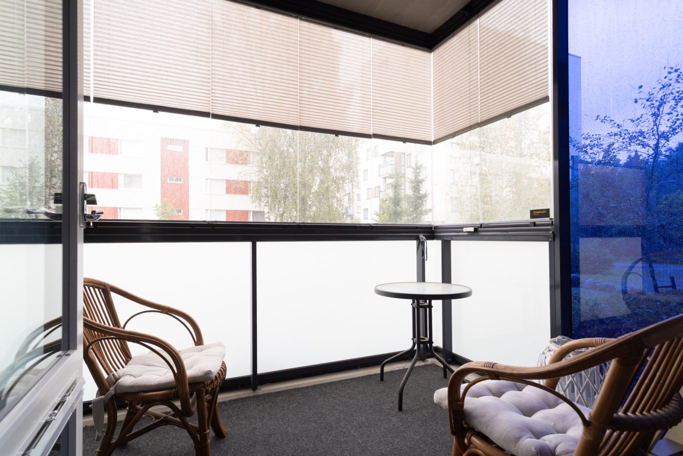 Asunnon sydän on valoisa olohuone ja toimiva keittiö, josta on käynti lasitetulle parvekkeelle. Parvekkeelta avautuu viihtyisä näkymä taloyhtiön suojaiselle sisäpihalle. Oma sauna tuo arkeen ripauksen luksusta, ja modernit materiaalit takaavat asumismukavuuden ilman remonttihuolia.