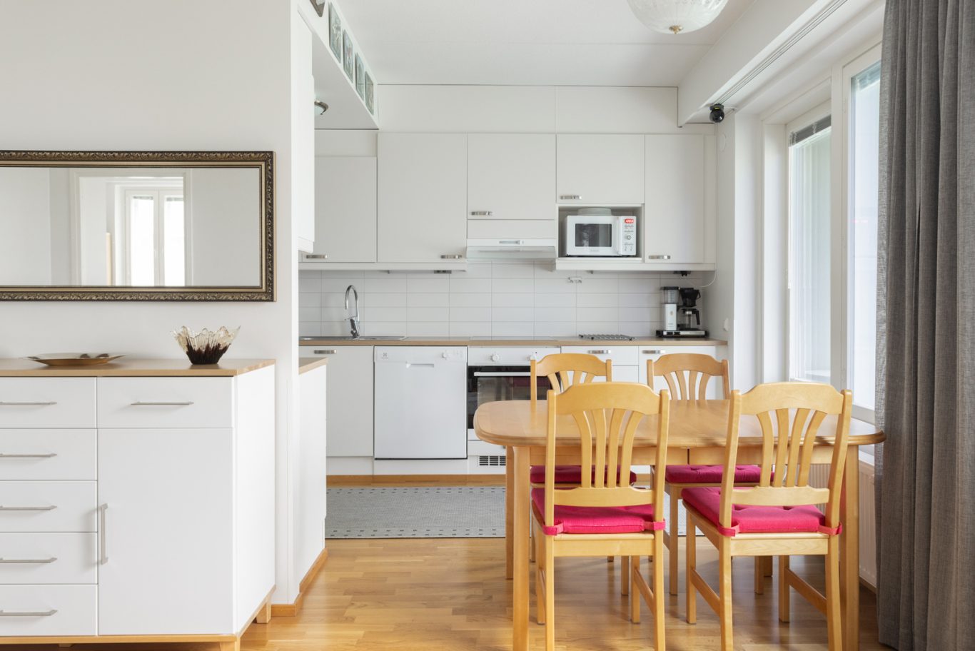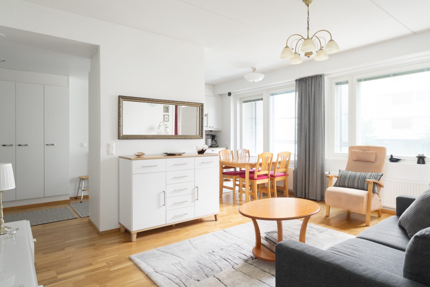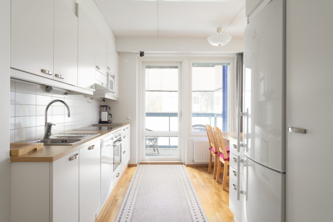Asunnon sydän on valoisa olohuone ja toimiva keittiö, josta on käynti lasitetulle parvekkeelle. Parvekkeelta avautuu viihtyisä näkymä taloyhtiön suojaiselle sisäpihalle. Oma sauna tuo arkeen ripauksen luksusta, ja modernit materiaalit takaavat asumismukavuuden ilman remonttihuolia.