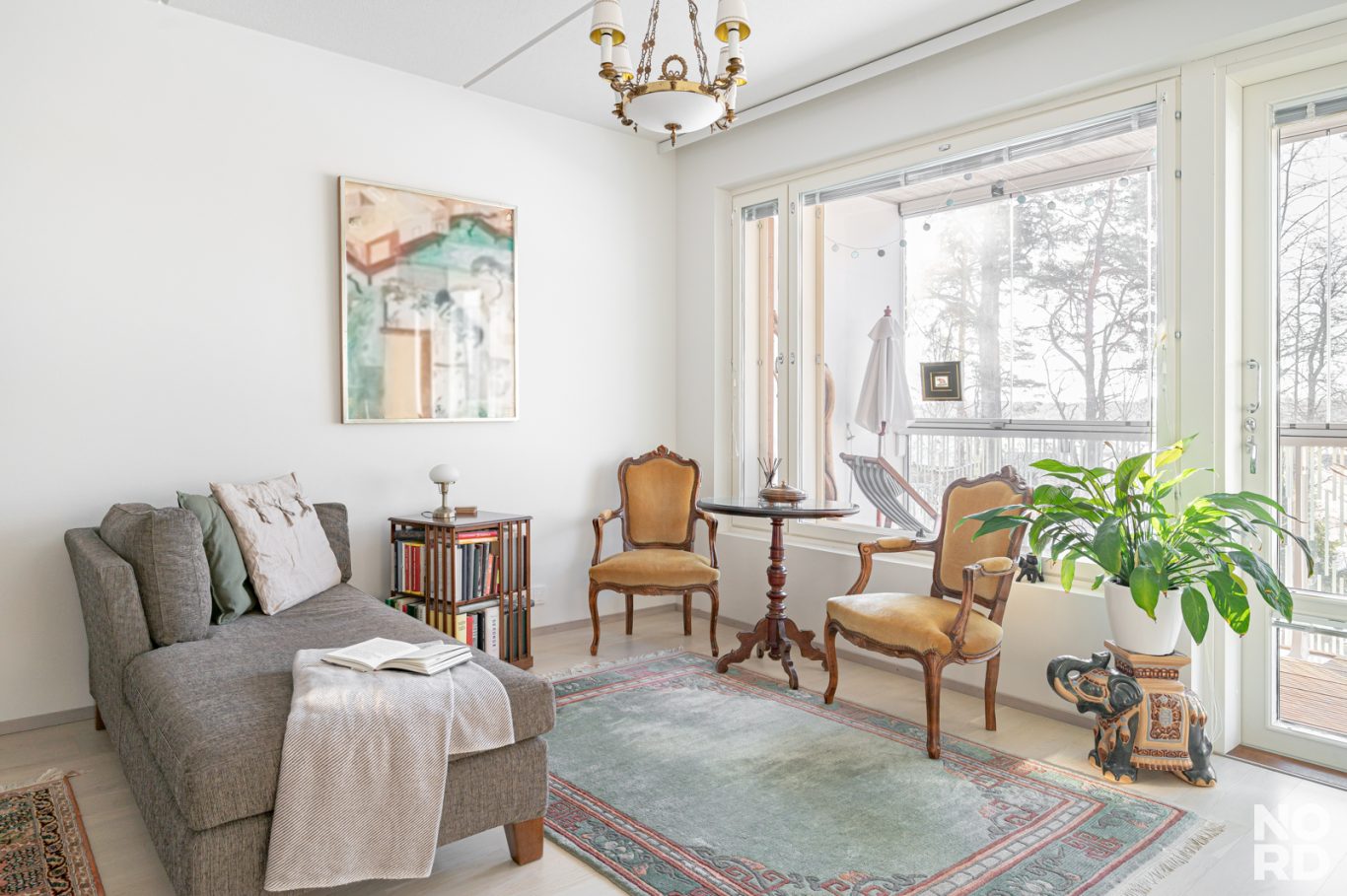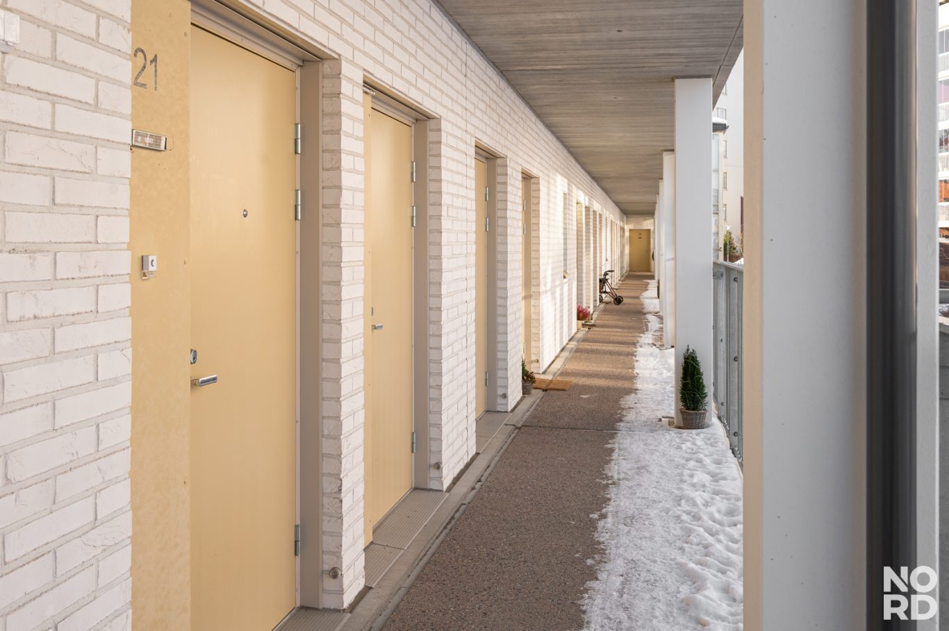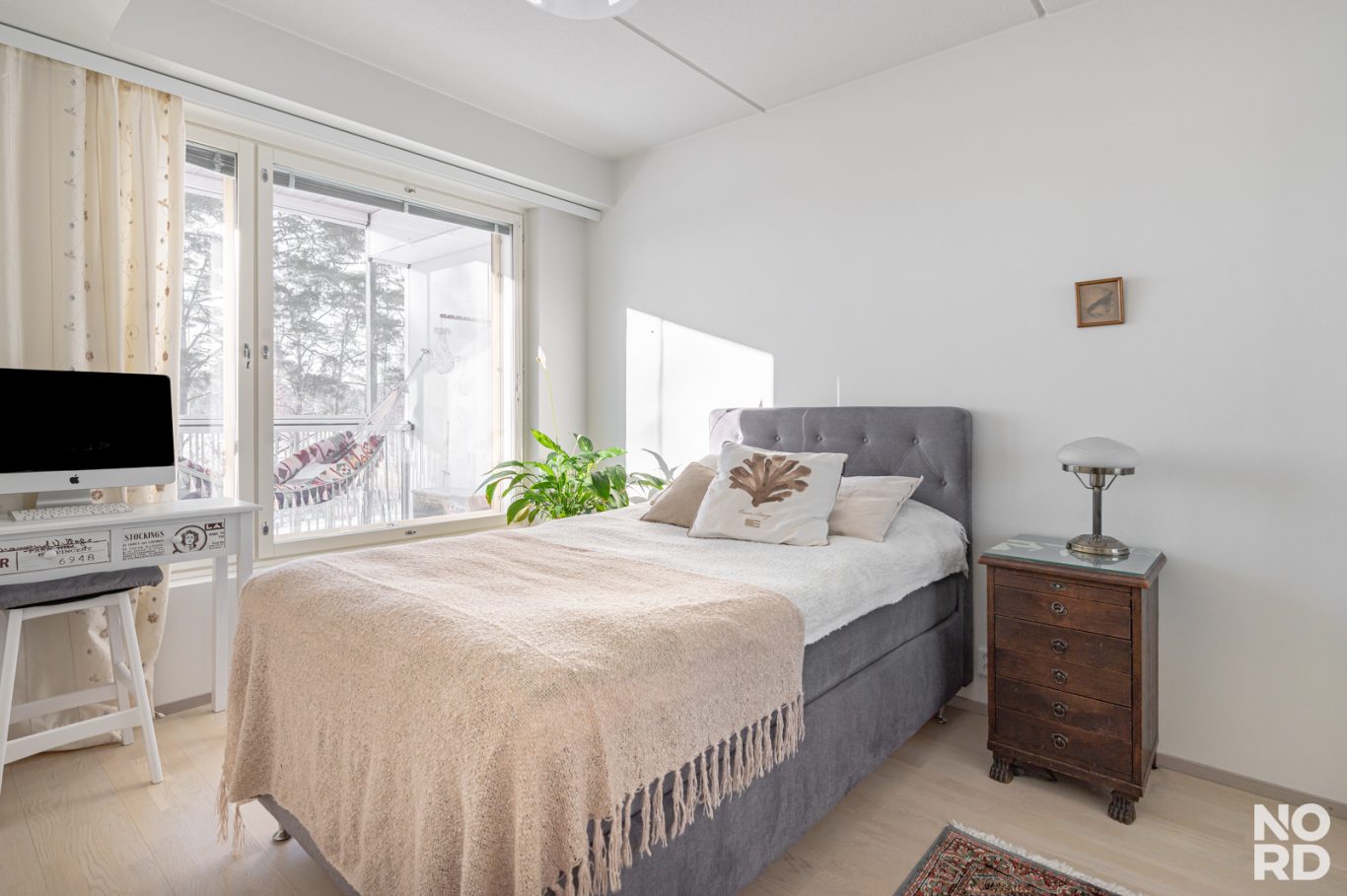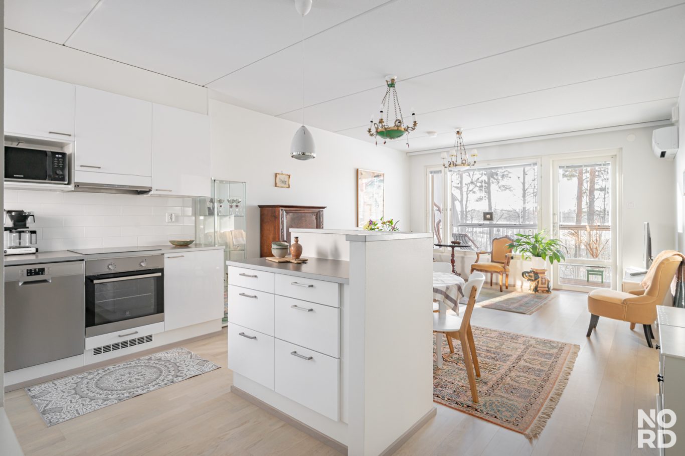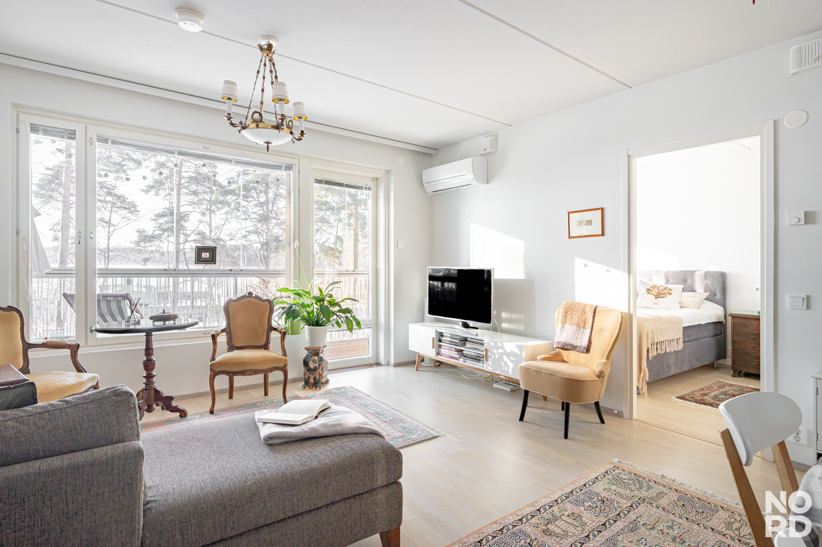 Kaunis ja hyvin pidetty läpitalon kaksio. Olohuone on tilava, ja helppo sisustaa eri tavoin. Toisessa päässä huonetta on avokeittiö, jonka ääreen sopii ruokapöytä. Olohuoneessa ilmalämpöpumppu, joka lisää asumismukavuutta kesähelteillä. Olohuoneesta käynti koko asunnon levyiselle lasitetulle parvekkeelle, joka meren suuntaan. Makuuhuoneeseen mahtuu parisängyn lisäksi vaikka työpiste. Tilava kylpyhuone, jonne mahtuu hyvin pesukone sekä kuivausrumpu, ja näin arjen pyykkihuolto hoituu kätevästi. Eteinen, ja sisäänkäynnin vieressä lisäksi asunnolle oma lämmin varasto.