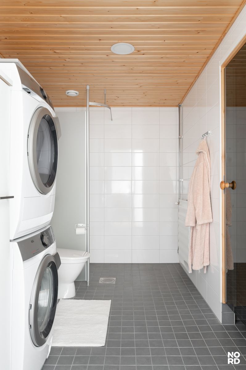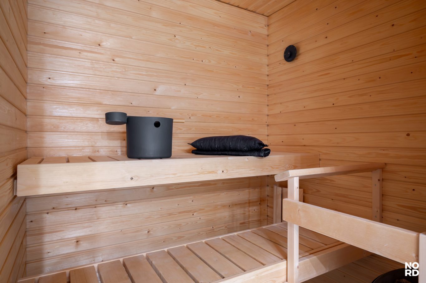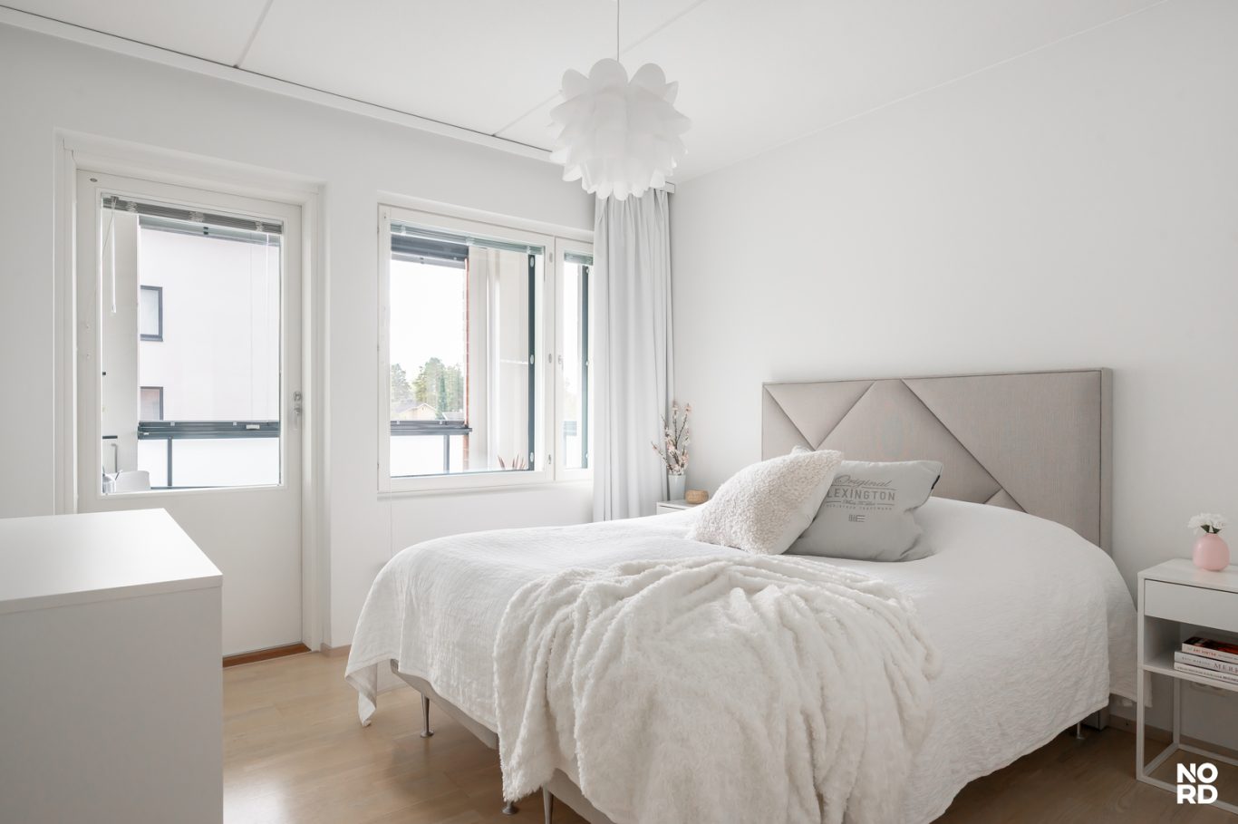 Makuuhuone on niin ikään reilun kokoinen ja sen yhteydessä on tilava vaatehuone. Makuuhuoneesta on käynti lasitetulle parvekkeelle. Kylpyhuone on tilava ja siellä on myös tilaa pesutornille. Oma sauna kuuluu myös asunnon mukavuuksiin.