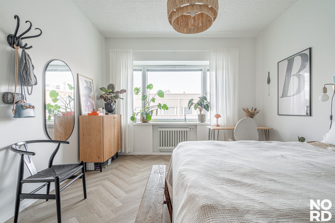 Keittiössä on hyvin työskentely- ja säilytystilaa. Makuuhuoneet sijaitsevat eri puolilla asuntoa ja molemmissa makuuhuoneissa on runsaasti kaappitilaa. Toisessa makuuhuoneessa on viehättävä ranskalainen parveke.