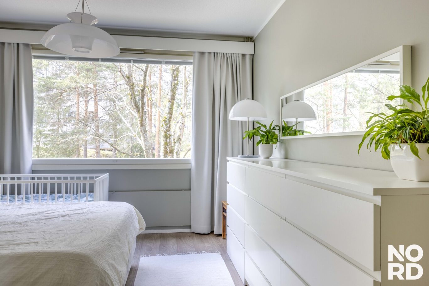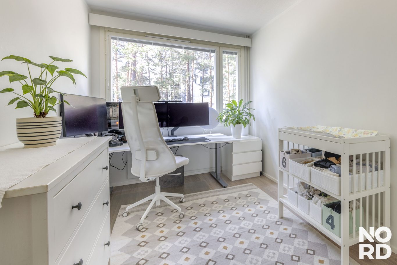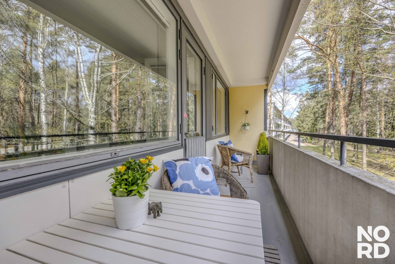 Asunnossa on pihan puolella kolme tilavaa makuuhuonetta, ja olohuone sekä keittiö rajoittuvat asunnon levyiseen parvekkeeseen. Näkymät ovat siis rauhoittavan kauniit ja metsäiset ympäri vuoden, sillä asunto sijaitsee vehreän männikkömaiseman äärellä. Tämän talon piha-alue on erityisen suojaisa ja siinä on mukava leikkialue, joka ei kuitenkaan ole tämän asunnon ikkunoiden alla.