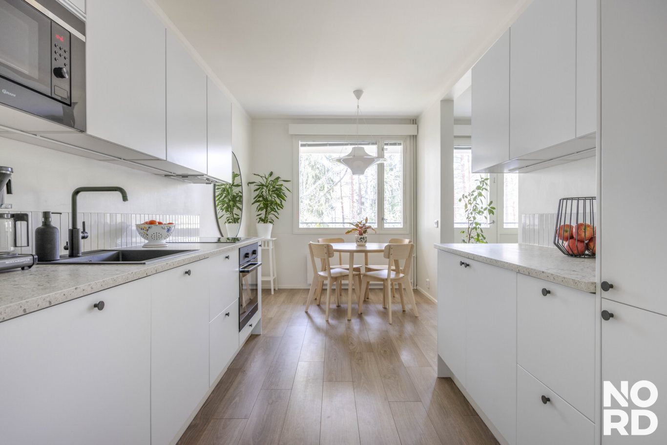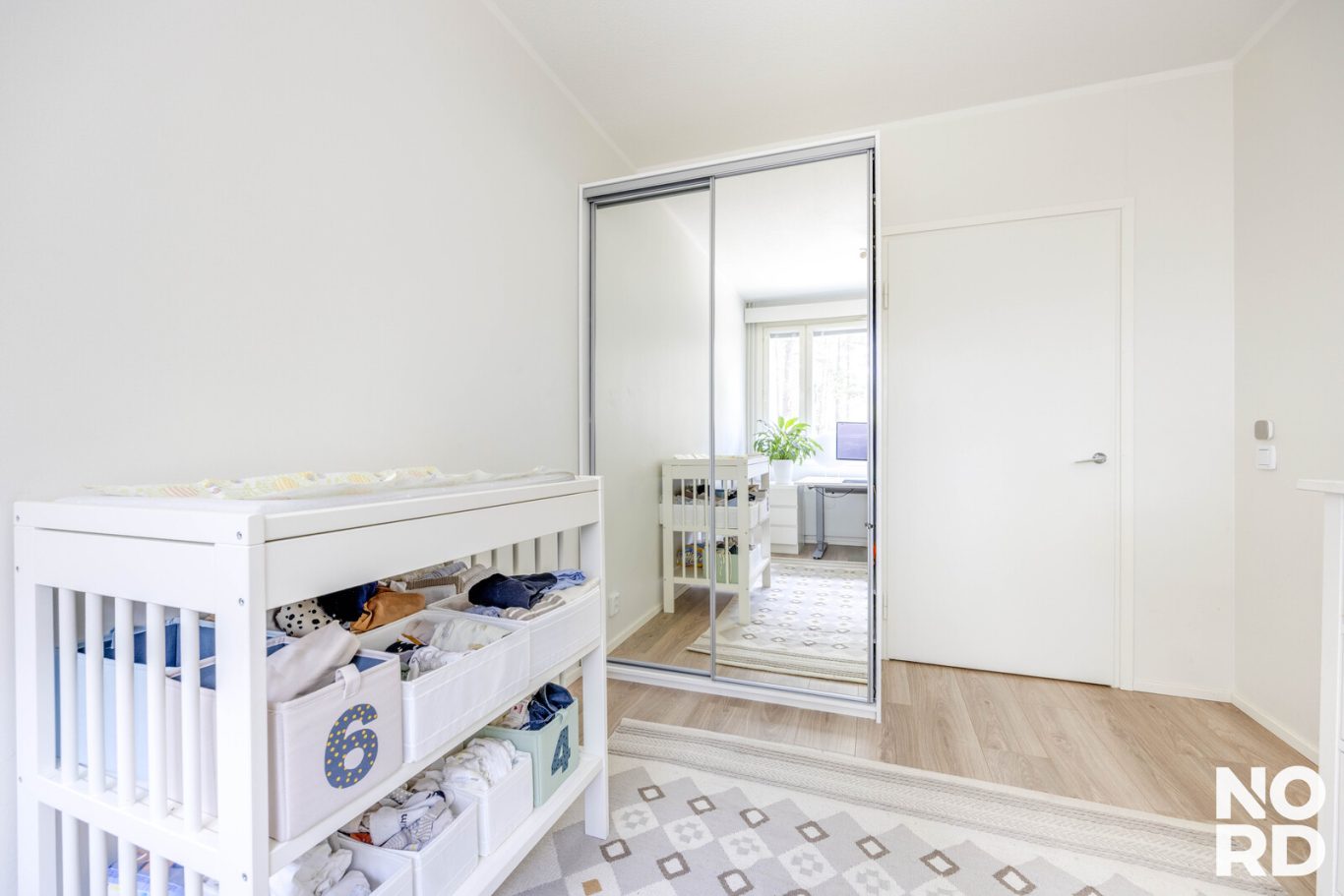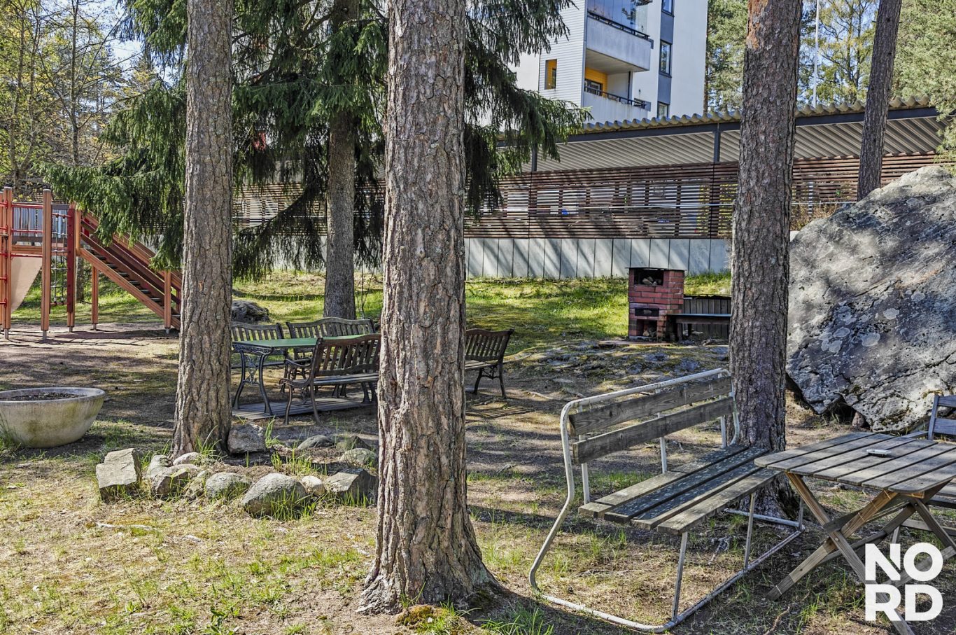 Asunnossa on pihan puolella kolme tilavaa makuuhuonetta, ja olohuone sekä keittiö rajoittuvat asunnon levyiseen parvekkeeseen. Näkymät ovat siis rauhoittavan kauniit ja metsäiset ympäri vuoden, sillä asunto sijaitsee vehreän männikkömaiseman äärellä. Tämän talon piha-alue on erityisen suojaisa ja siinä on mukava leikkialue, joka ei kuitenkaan ole tämän asunnon ikkunoiden alla.