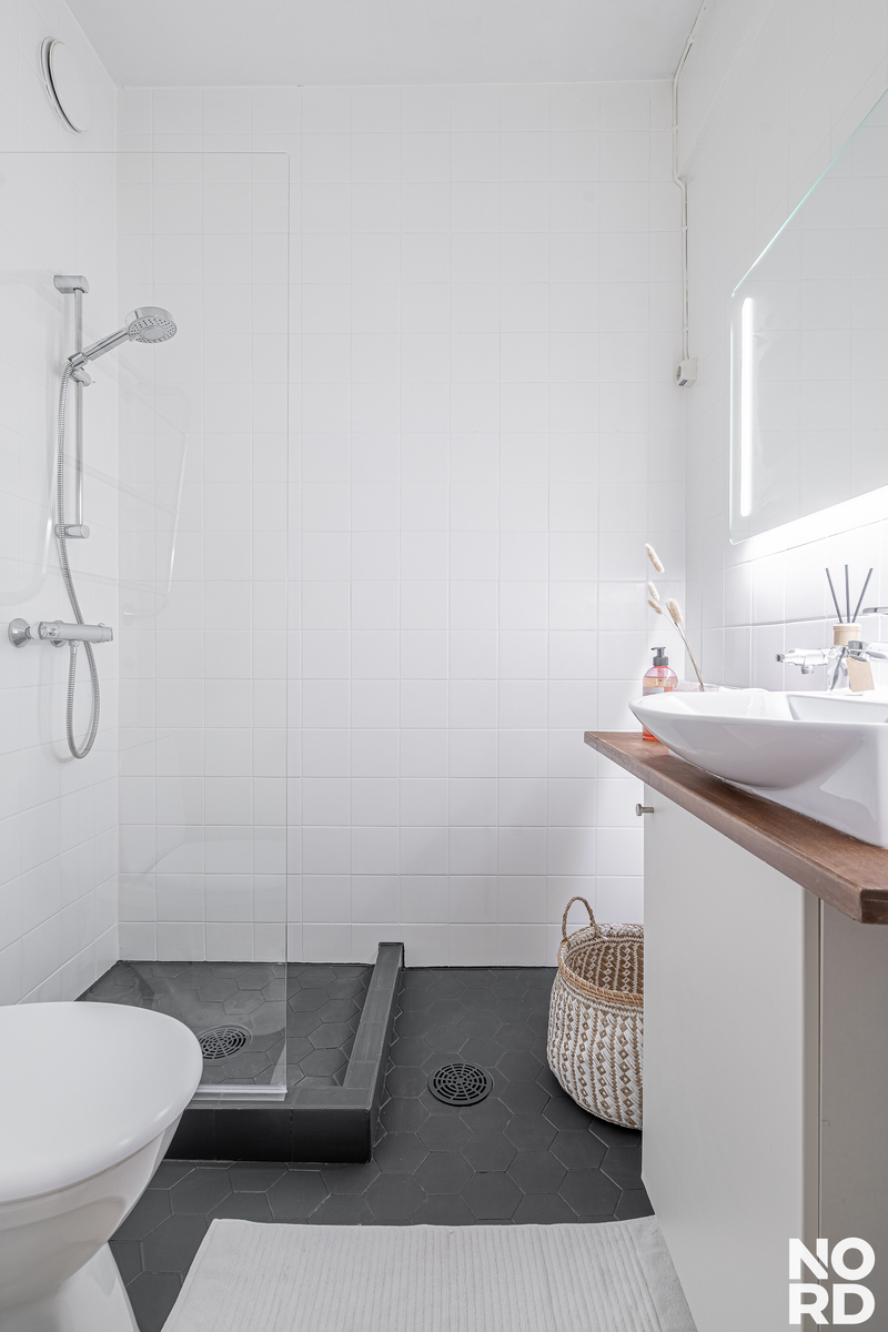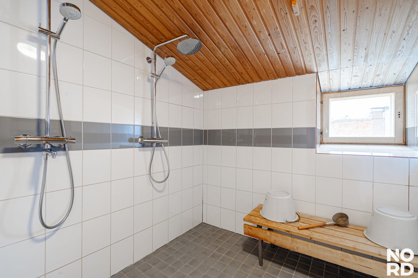 Tyylikkäässä kylpyhuoneessa on paikka pesukoneelle, ja asunnossa on runsaasti säilytystilaa, kuten neljä vaatekaappia. Lisäksi huoneistokohtaiset vintti- ja kellarikomerot. Taloyhtiön ullakolle on rakennettu tunnelmallinen saunaosasto takkahuoneella, unohtamatta katolla sijaitsevaa aurinkoterassia.