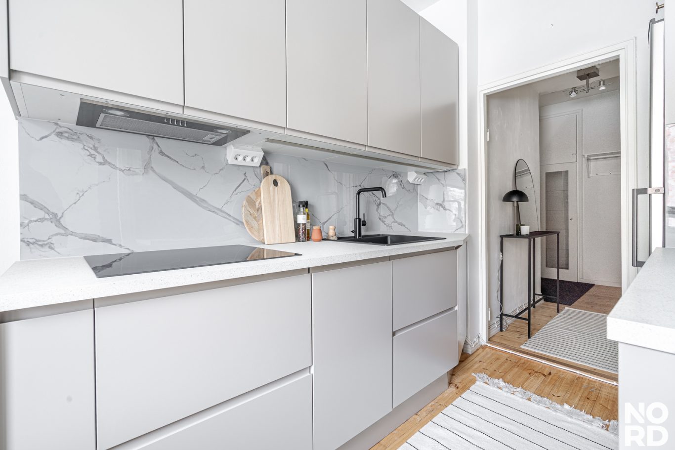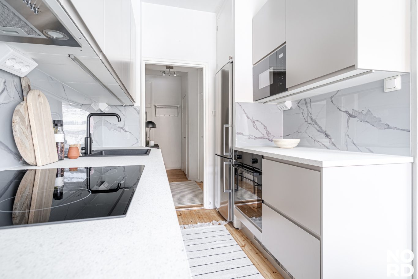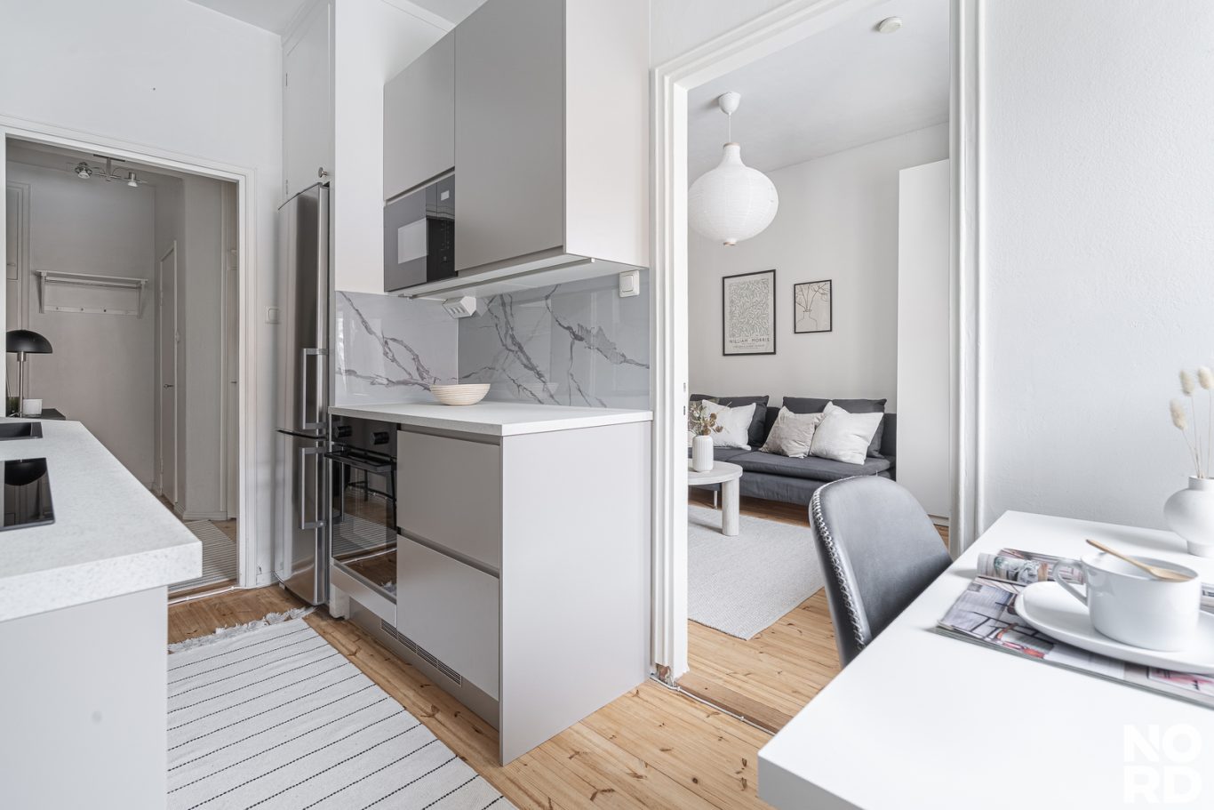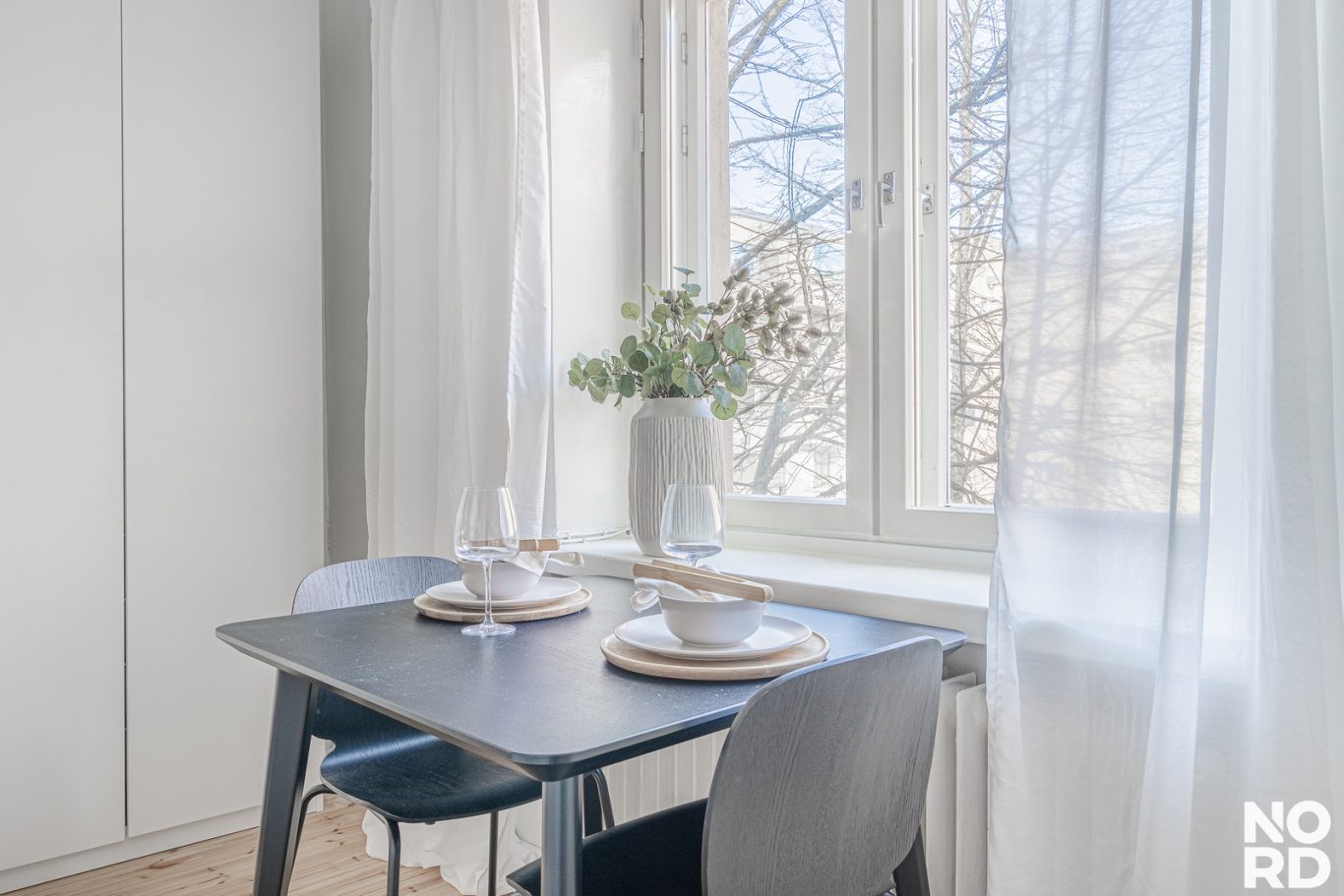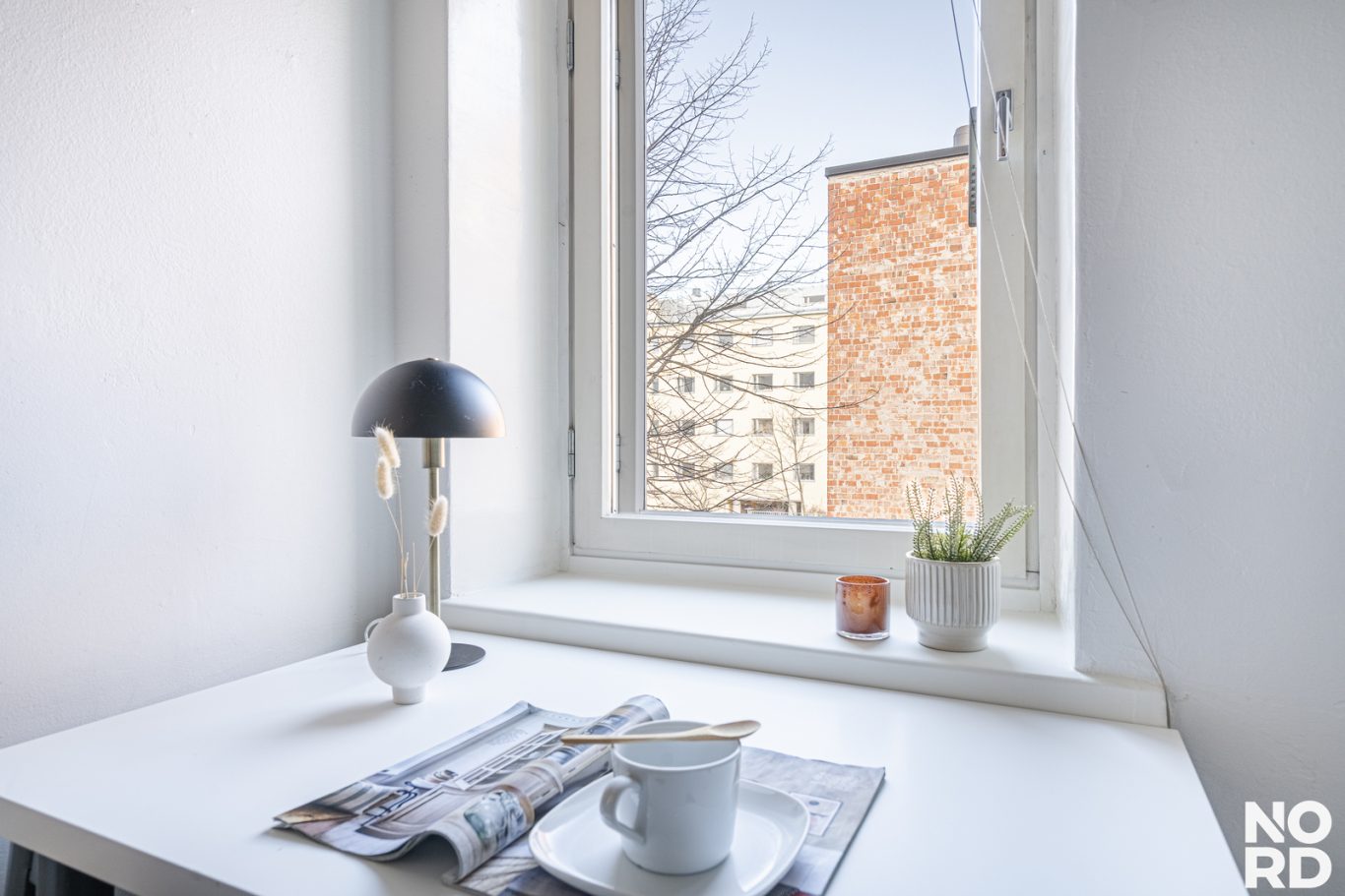 Asunnon pohjaratkaisu on toimiva ja tilava. Juuri remontoidussa keittiössä on runsaasti säilytys- ja laskutilaa sekä paikka pienelle ruokailuryhmälle. Suuren olohuoneen ikkuna avautuu vehreälle sisäpihalle ilman vastakkaisia ikkunoita. Olohuoneen yhteydessä oleva lasisin liukuovin varustettu alkovi tarjoaa tilaa parisängylle.