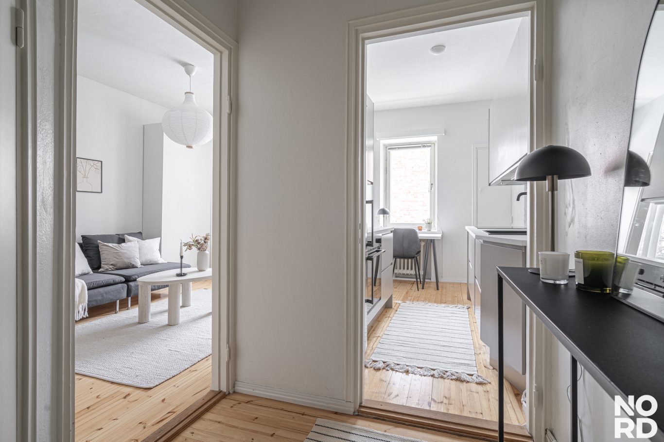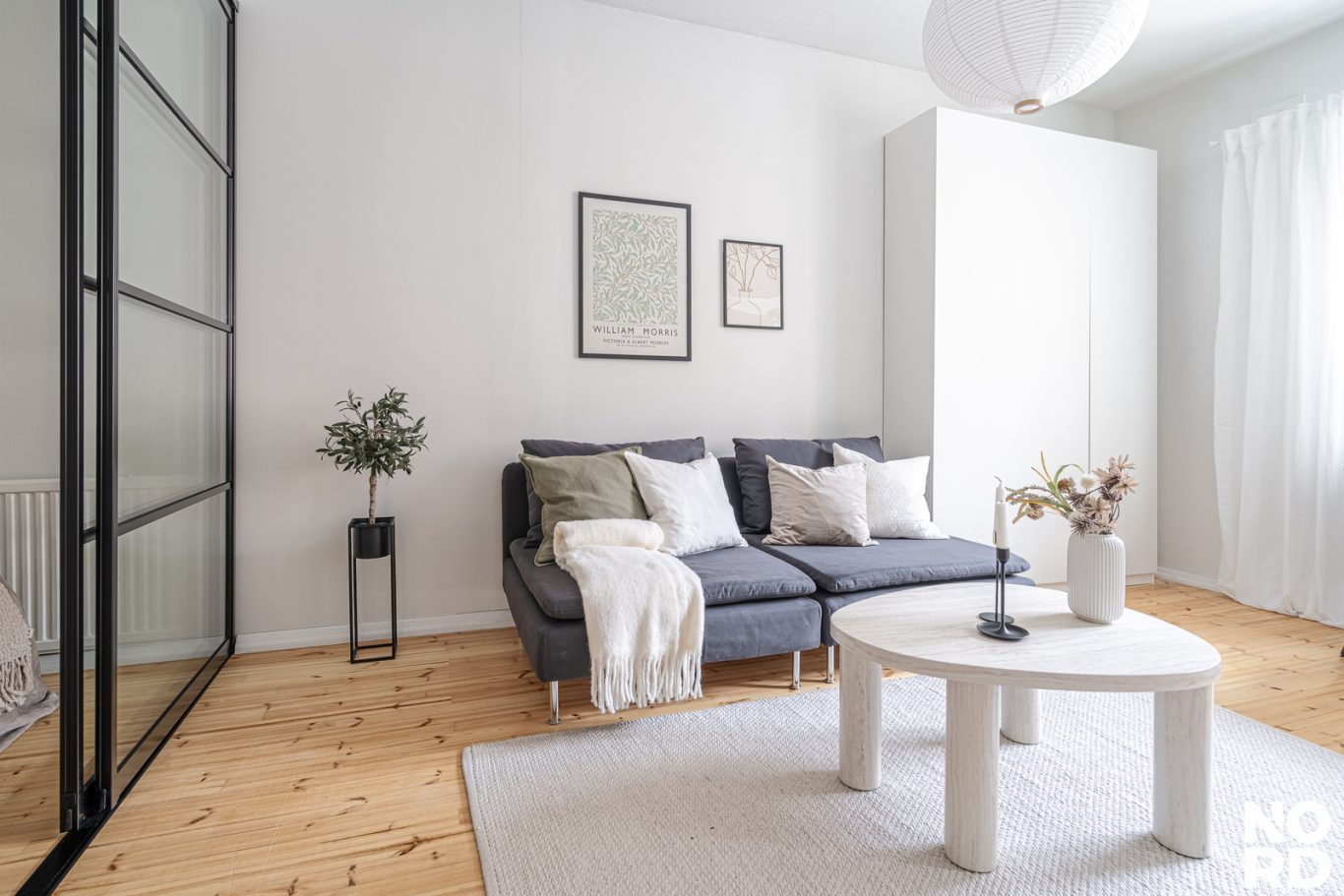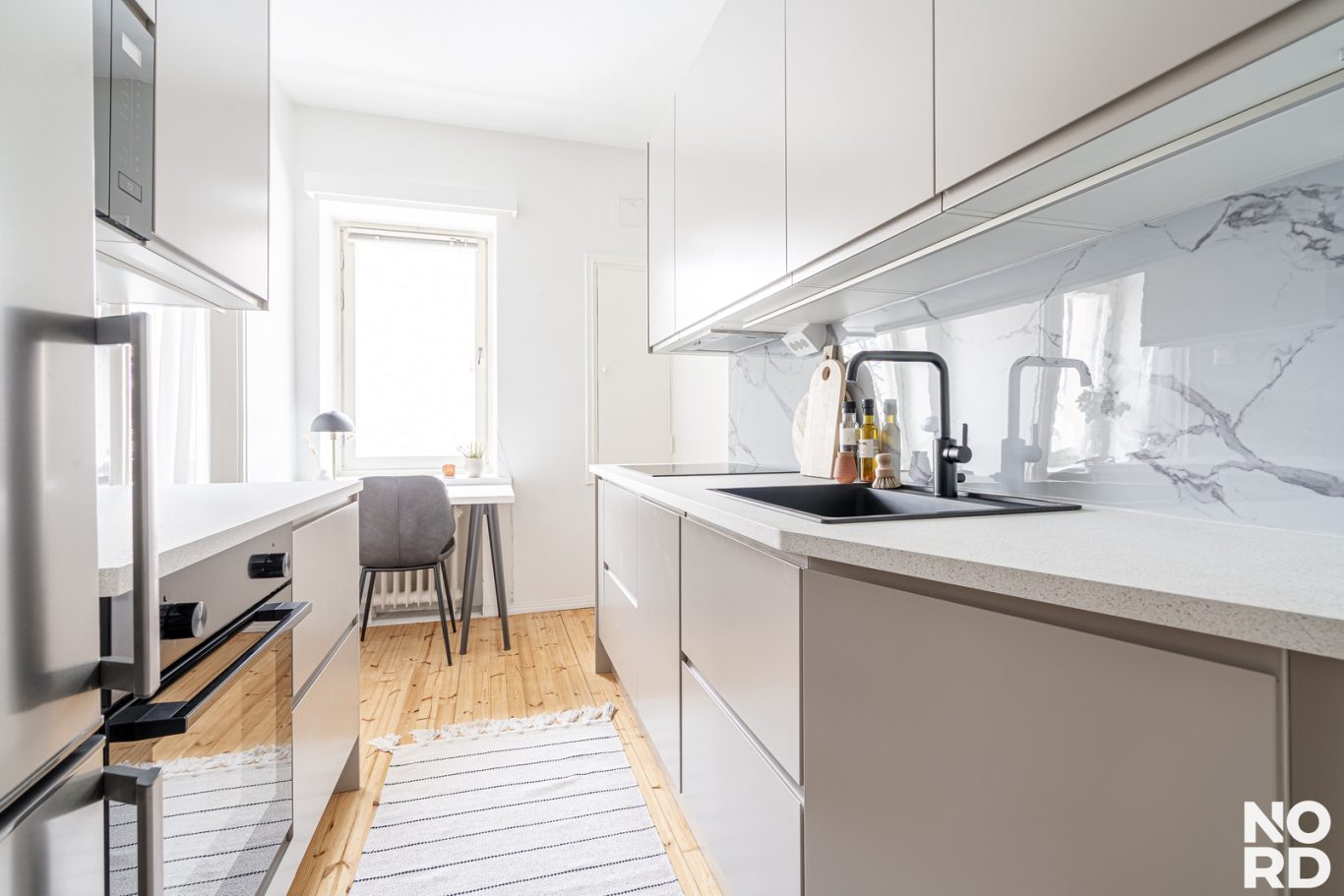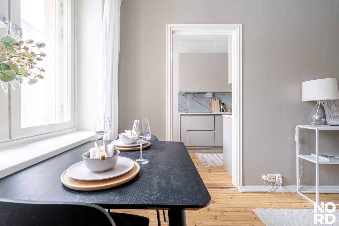 Asunnon pohjaratkaisu on toimiva ja tilava. Juuri remontoidussa keittiössä on runsaasti säilytys- ja laskutilaa sekä paikka pienelle ruokailuryhmälle. Suuren olohuoneen ikkuna avautuu vehreälle sisäpihalle ilman vastakkaisia ikkunoita. Olohuoneen yhteydessä oleva lasisin liukuovin varustettu alkovi tarjoaa tilaa parisängylle.