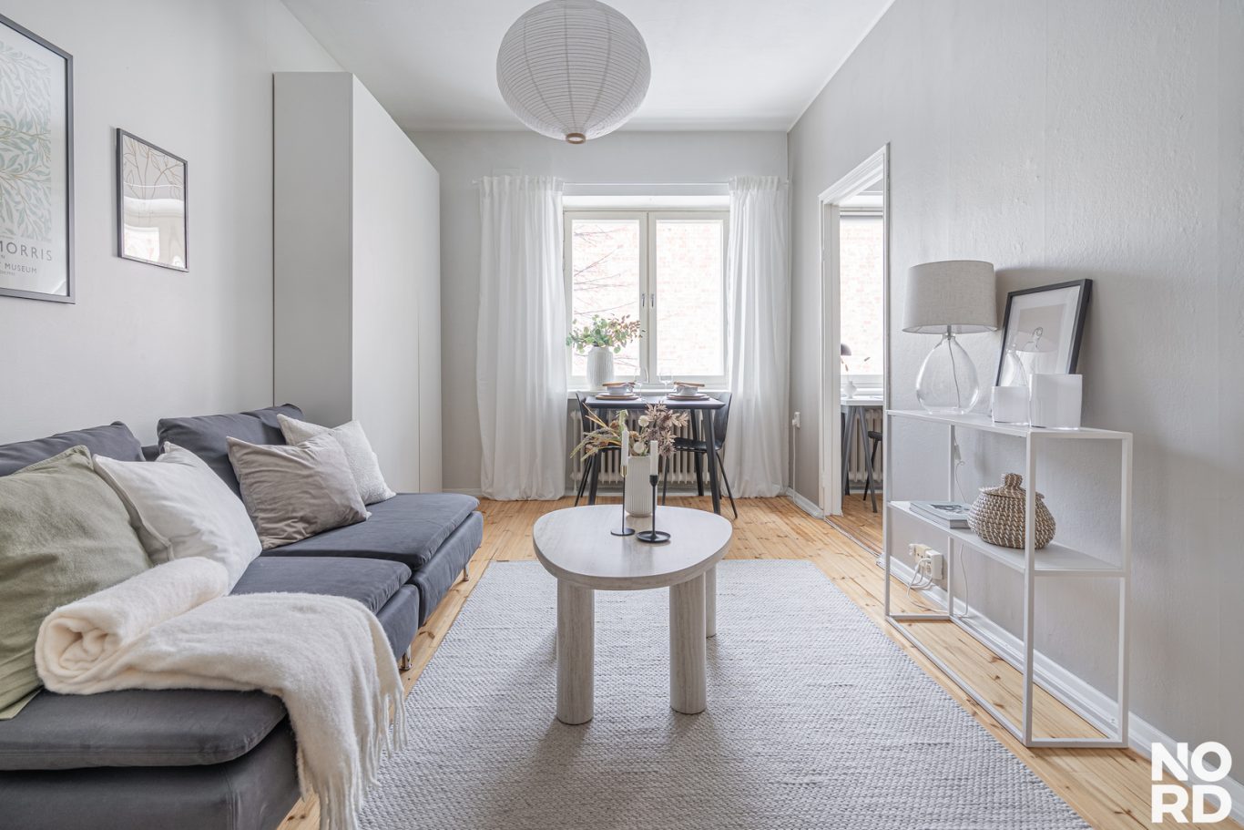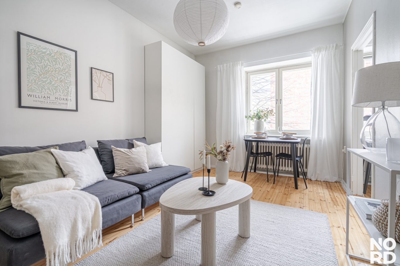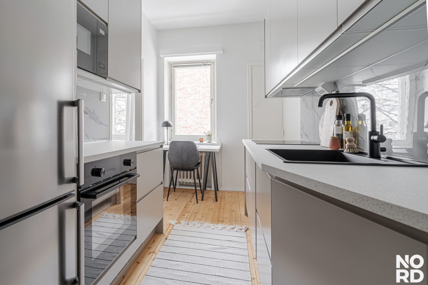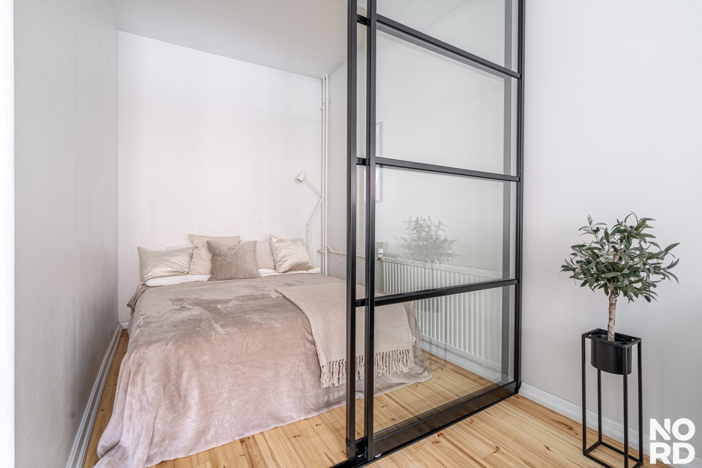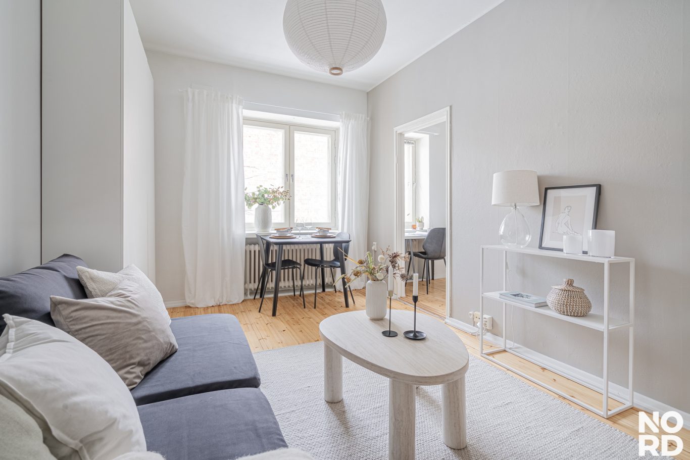 Asunnon pohjaratkaisu on toimiva ja tilava. Juuri remontoidussa keittiössä on runsaasti säilytys- ja laskutilaa sekä paikka pienelle ruokailuryhmälle. Suuren olohuoneen ikkuna avautuu vehreälle sisäpihalle ilman vastakkaisia ikkunoita. Olohuoneen yhteydessä oleva lasisin liukuovin varustettu alkovi tarjoaa tilaa parisängylle.