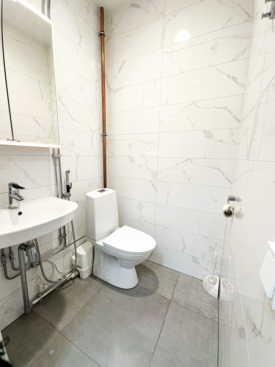 Tilassa on siisti, uusittu WC, ja pinnat on remontoitu huolellisesti. Lisäksi tilassa on muutama pieni tuuletusikkuna, jotka tuovat ilmanvaihtoa ja lisäävät viihtyisyyttä.