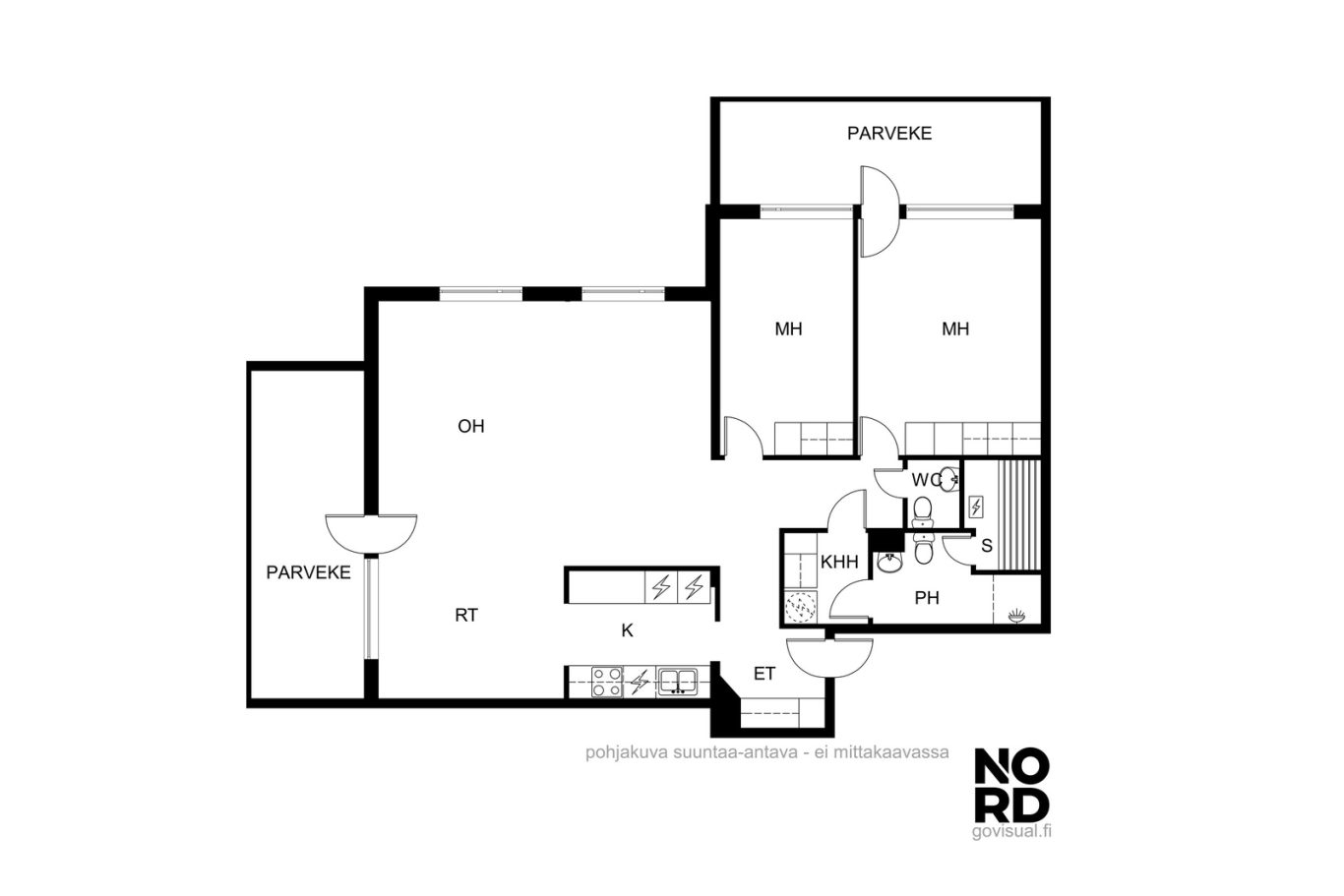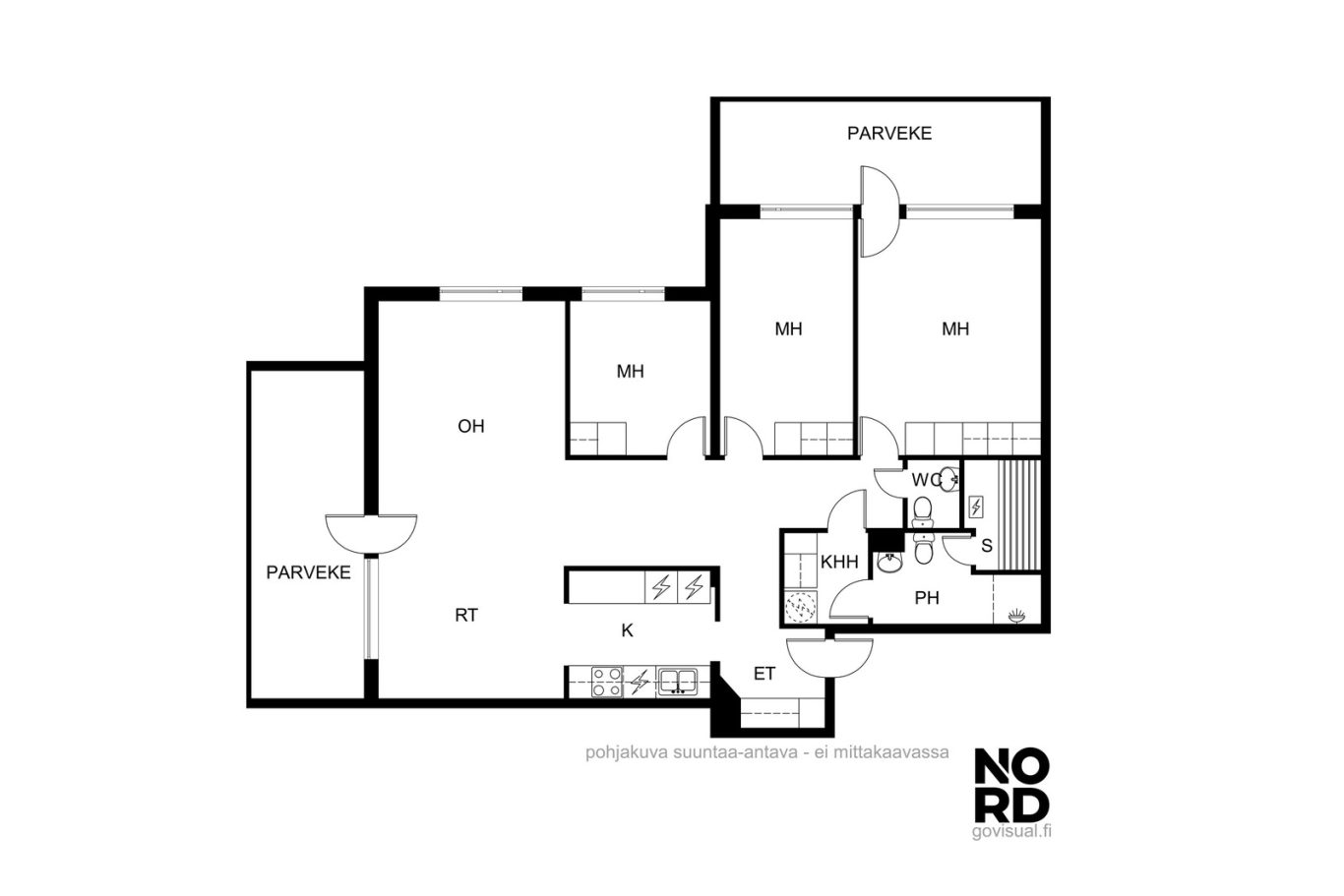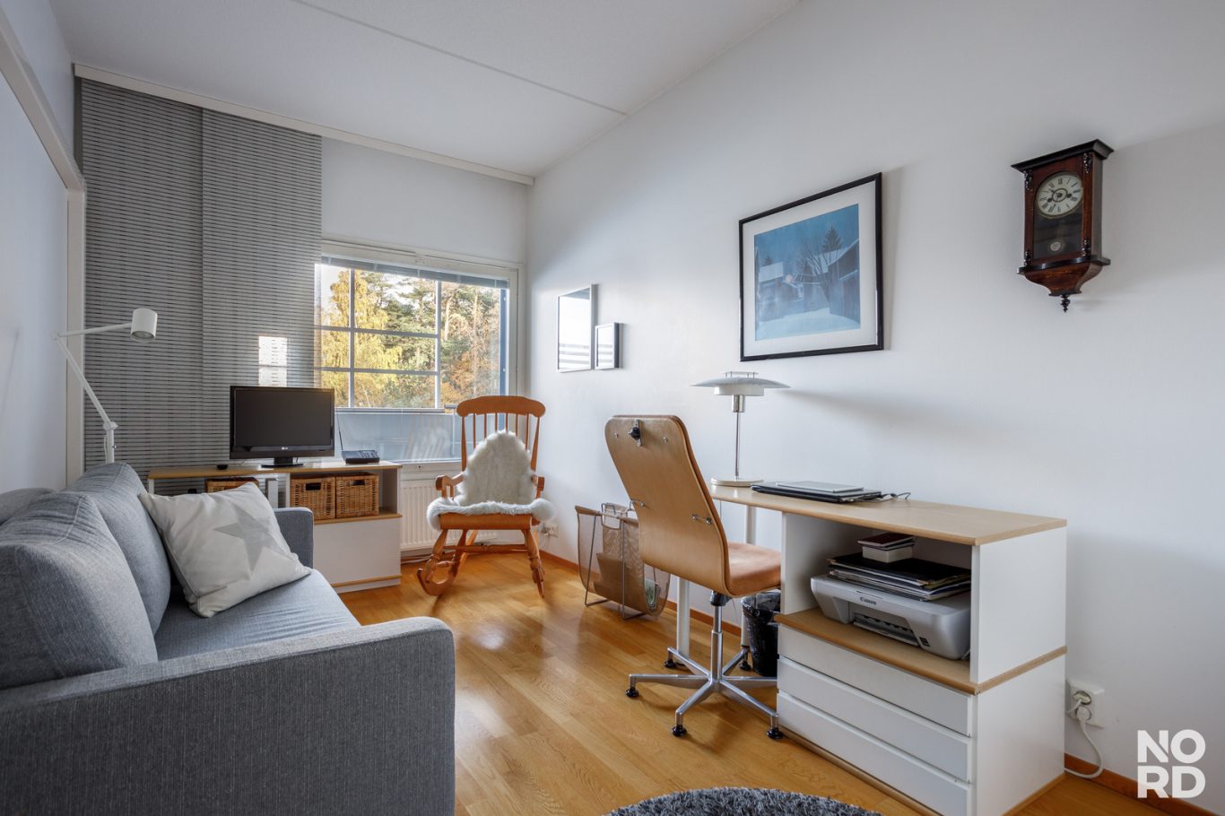 Yhtiöjärjestyksen mukaan asunto on 4h + k, mutta se on tällä hetkellä toteutettu kolmen huoneen ratkaisuna, joka on helppo muuttaa takaisin kolmen makuuhuoneen asunnoksi. Avarassa olohuoneessa ja keittiössä on mukavasti tilaa ja ilmalämpöpumppu lisää asumismukavuutta kesäkuumalla.